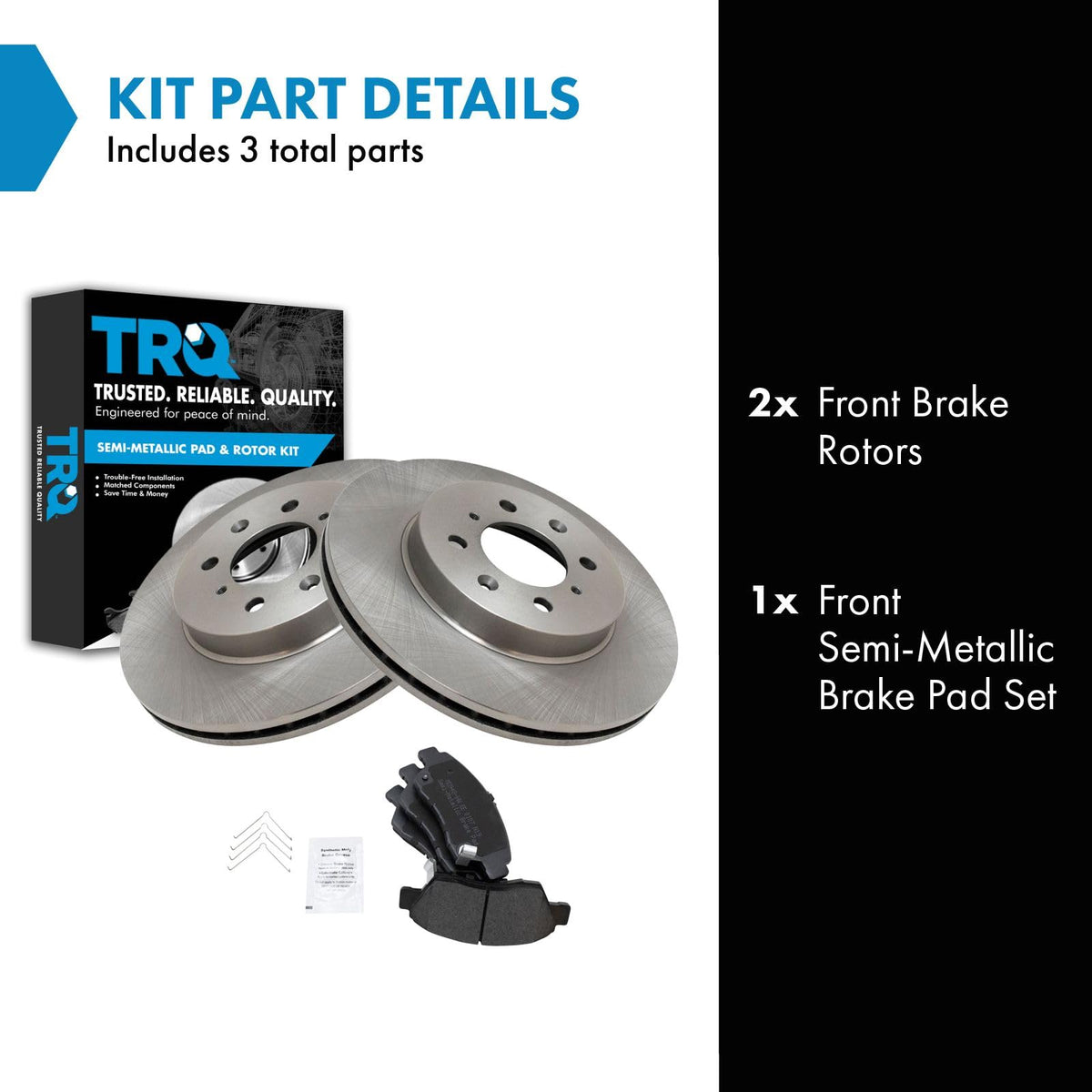 Semi-Metallic Brake Pad & Rotor KitKit Includes(1) Front Semi-Metallic Brake Pad Set(2) Front Brake RotorsFitmentCompatible with: 2003-05 Honda Civic Hybrid FrontCompatible with: 2007-12 Honda FIT FrontCompatible with: 2013 Honda FIT Base Model FrontCompatible with: 2013 Honda FIT Sport FrontCompatible with: 1994-97 Honda Civic Del Sol Front with 4 Wheel ABS BrakesProduct AttributesFront Brake Rotor Diameter: 10.30 in. (262mm)Wheel Lug Count: 4 LugBrake Pad Bonding Type: Premium PosiBrake Pad Friction Material: Semi-MetallicFront Brake Rotor Venting Type: VentedProduct Features Positive Molded - Less dust resulting in clean wheels G3000 Casting Alloy - Reduced noise and improved wear resistance Application Specific Design - Extended service life, no modificationsItem DetailsTRQ brake kits are designed to restore your brake system to like-new performance. TRQ brake pads are positive molded, thermal scorched, chamfered, and utilize a multi-layer shim for enhanced performance and service life. TRQ rotors have a non-directional finish that reduces the break-in period for new rotors as well as reducing vibrations throughout the rotors lifecycle. All products are fit and road-tested in our Massachusetts R&D facility to ensure we deliver on our promise of Trusted Reliable Quality.Reference NumbersAcura: 45022S5BJ00Aimco: 3295Auto Extra: AXMD1394Autopart International: 1402-69763Bendix: PRT1471DuraGo: BR3295Honda: 45022S5BJ00, 45022S5BJ01, 45022SLNA02, 45022TF2J00, 45022TF2J01, 45022TK6A00, 45022TK6A01, 45022TR2A00, 45022TR2A01Raybestos Brakes: 96087, 96087FZN, 96087P, 96087R, EHT948HWagner: BD126585, BD61982