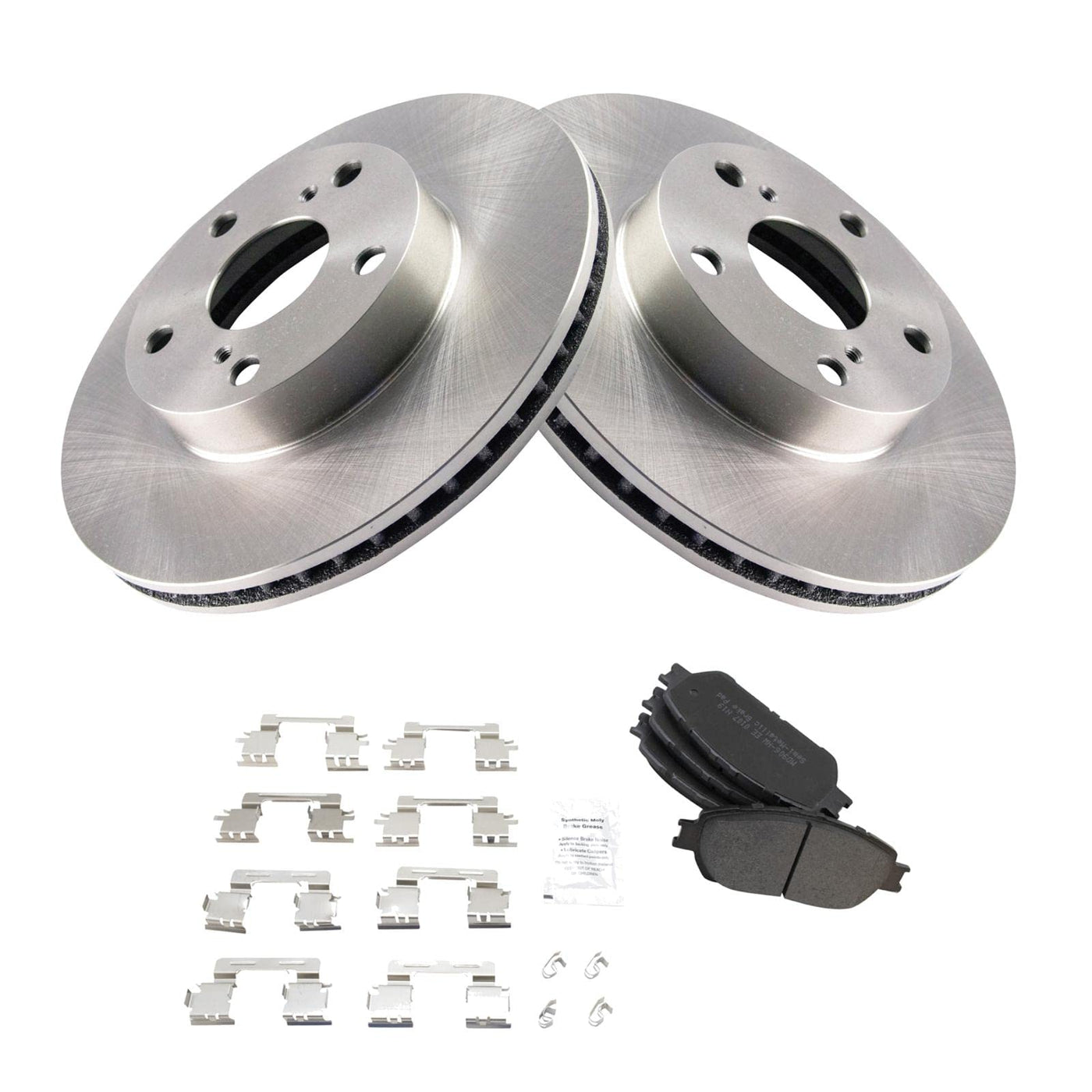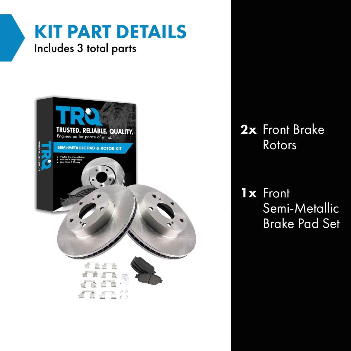 Semi-Metallic Brake Pad & Rotor KitKit Includes(1) Front Semi-Metallic Brake Pad Set(2) Front Brake RotorsFitmentCompatible with: 2005-15 Toyota Tacoma Rear Wheel Drive Front with 5 Lug WheelsProduct AttributesFront Brake Rotor Diameter: 10.83 in. (275mm)Wheel Lug Count: 5 LugBrake Pad Bonding Type: Premium PosiBrake Pad Friction Material: Semi-MetallicFront Brake Rotor Venting Type: VentedProduct Features Positive Molded - Less dust resulting in clean wheels G3000 Casting Alloy - Reduced noise and improved wear resistance Application Specific Design - Extended service life, no modificationsItem DetailsTRQ brake kits are designed to restore your brake system to like-new performance. TRQ brake pads are positive molded, thermal scorched, chamfered, and utilize a multi-layer shim for enhanced performance and service life. TRQ rotors have a non-directional finish that reduces the break-in period for new rotors as well as reducing vibrations throughout the rotors lifecycle. All products are fit and road-tested in our Massachusetts R&D facility to ensure we deliver on our promise of Trusted Reliable Quality.Reference NumbersAimco: 31428Bendix: PRT5717DuraGo: BR900358Lexus: 446533270, 446533280Raybestos Brakes: 980461, 980461FZN, 980461P, 980461PER, 980461R, EHT906HToyota: 446504080, 446508030Wagner: BD126311