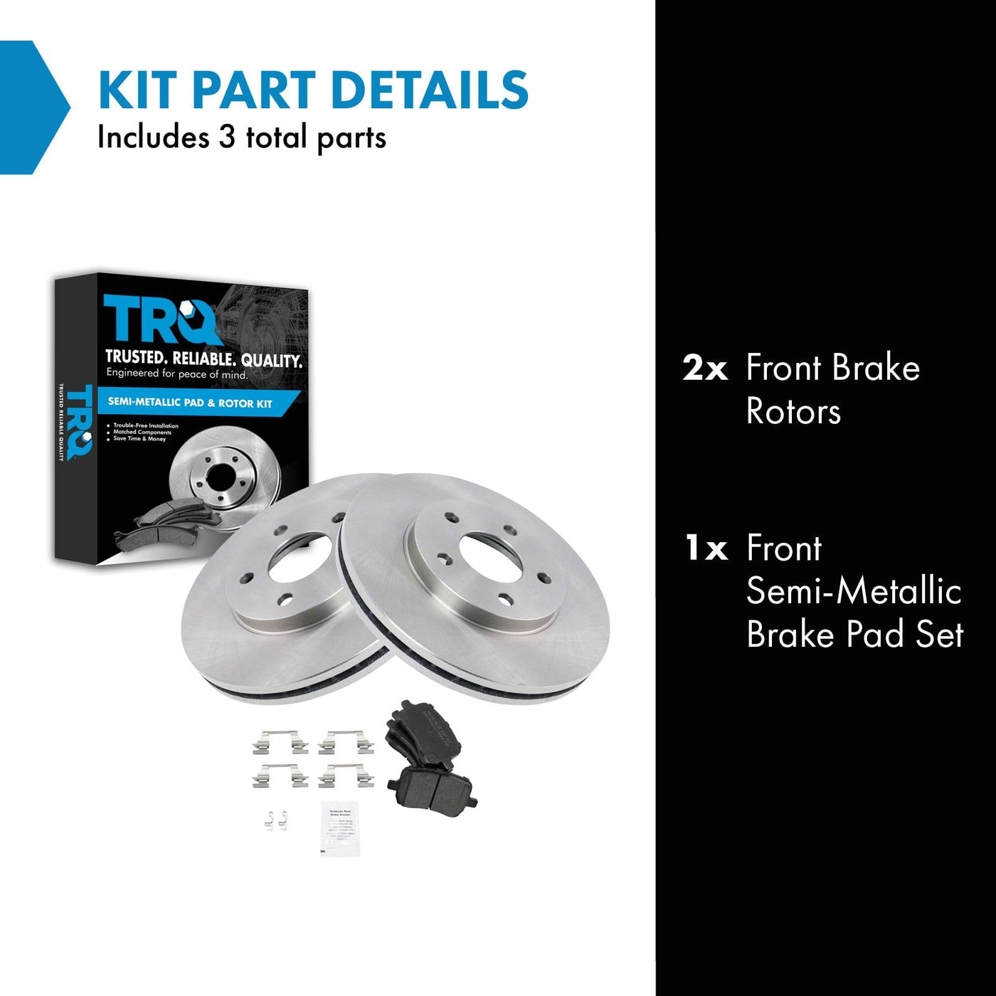 Semi-Metallic Brake Pad & Rotor KitKit Includes(1) Front Semi-Metallic Brake Pad Set(2) Front Brake RotorsFitmentCompatible with: 2008 Chevrolet Malibu Classic LT Front with RPO Code J67 4 Wheel Disc, 4 Wheel ABS BrakesCompatible with: 2008 Chevrolet Malibu Classic LS Front with RPO Code J67 4 Wheel Disc, 4 Wheel ABS BrakesCompatible with: 2007 Pontiac G6 Front with RPO Code J66 4 Wheel Disc Brakes without ABS BrakesCompatible with: 2007 Pontiac G6 Front with RPO Code J67 4 Wheel Disc, 4 Wheel ABS BrakesCompatible with: 2007 Chevrolet Malibu Front with 10.87 in. 276mm Diameter Front Rotors with RPO Code J67 4 Wheel Disc, 4 Wheel ABS BrakesProduct AttributesFront Brake Rotor Diameter: 10.87 in. (276mm)Wheel Lug Count: 5 LugBrake Pad Bonding Type: Premium PosiBrake Pad Friction Material: Semi-MetallicFront Brake Rotor Venting Type: VentedProduct Features Positive Molded - Less dust resulting in clean wheels G3000 Casting Alloy - Reduced noise and improved wear resistance Application Specific Design - Extended service life, no modificationsItem DetailsTRQ brake kits are designed to restore your brake system to like-new performance. TRQ brake pads are positive molded, thermal scorched, chamfered, and utilize a multi-layer shim for enhanced performance and service life. TRQ rotors have a non-directional finish that reduces the break-in period for new rotors as well as reducing vibrations throughout the rotors lifecycle. All products are fit and road-tested in our Massachusetts R&D facility to ensure we deliver on our promise of Trusted Reliable Quality.Reference NumbersAimco: 55095Bendix: PRT5564Chevrolet: 15243704, 15808204, 20881786, 22820406, 25809846, 25957440DuraGo: BR55095Hollander: 530-00116Pontiac: 15808204, 20881786, 25809846, 25957440Raybestos Brakes: 580244, 580244FZN, 580244P, 580244R, EHT1160HSaturn: 15808204Wagner: BD126135