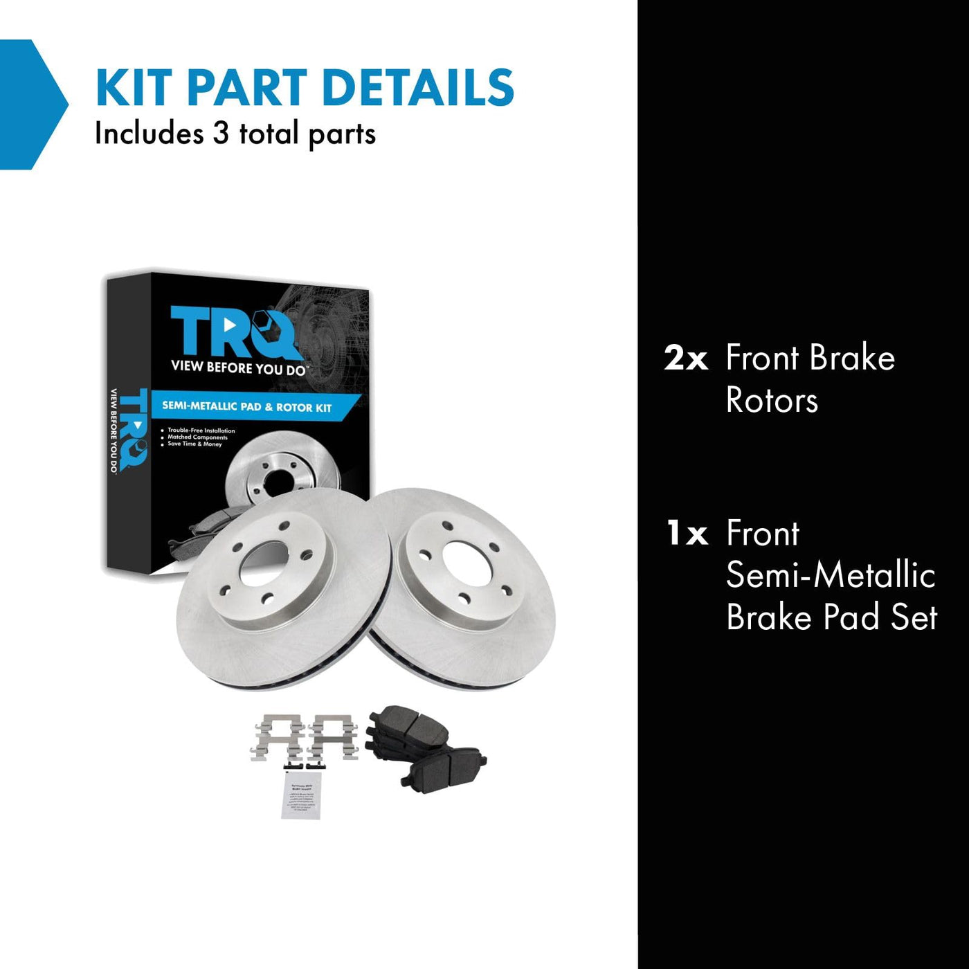 Semi-Metallic Brake Pad & Rotor KitKit Includes(1) Front Semi-Metallic Brake Pad Set(2) Front Brake RotorsFitmentCompatible with: 2007-10 Chevrolet Cobalt L4 2.2L Front with Rear Drum BrakesCompatible with: 2007-09 Pontiac G5 Base Model Front with Rear Drum BrakesProduct AttributesBrake Pad Bonding Type: Premium PosiBrake Pad Friction Material: Semi-MetallicProduct Features Positive Molded - Less dust resulting in clean wheels G3000 Casting Alloy - Reduced noise and improved wear resistance Application Specific Design - Extended service life, no modificationsItem DetailsTRQ brake kits are designed to restore your brake system to like-new performance. TRQ brake pads are positive molded, thermal scorched, chamfered, and utilize a multi-layer shim for enhanced performance and service life. TRQ rotors have a non-directional finish that reduces the break-in period for new rotors as well as reducing vibrations throughout the rotors lifecycle. All products are fit and road-tested in our Massachusetts R&D facility to ensure we deliver on our promise of Trusted Reliable Quality.Reference NumbersACDelco: 177-0967Advance Auto Parts: G12542SD, N1000390591APO, YH145654, YH145654C, YH145654PAimco: 55144API: 1407-80286Autopartsource: 593755Autoxtra: AX55126AutoZone: 41124, 55126, 55126DG, 55126DLBendix: 145654, PRT5690Bosch: 25010632BrakeBest: 25010632, 580403, 580403FZN, 580403P, 580403PER, 580403R, 580403RGS, 81-126347, BD126347Brembo: 09.B535.10, 09.B535.11Casting Numbers: 18083321, 211765-C, 326230Centric Parts: 120.62098, 120.62098CRY, 121.62098, 126.62098CSL, 126.62098CSR, 126.62098SL, 126.62098SR, 127.62098CL, 127.62098CR, 127.62098L, 127.62098R, 128.62098CL, 128.62098CR, 128.62098L, 128.62098R, 226.62098SL, 226.62098SR, 227.62098L, 227.62098R, 320.62098, 320.62098F, 321.62098Chevrolet: 10366667, 25906723Dura Corp: BR55126, BR5512602, BR900652DuraGo: 900245, 900652, BR55126, BR5512602, BR900498, BR900652, BR90245General Motors: 15251335, 20879454, 23127613, 25862792, 25955931Monroe Brakes: BD126347Newtek Automotive USA: 55126Omnicraft: QBRR188Parts Master: 126347Performance Friction: 301.052.01Pontiac: 10366667, 25906723PowerStop: AR82110EVC, PSR6620584Promax: 14-55126, 20-55126Quality Brand: Q4233Raybestos Brakes: 580403, 580403R, 580503, 580503FZN, 580503P, 580503R, EHT956HSaturn: 10366667, 22688646UAP: 55126Ultra Brake: 55144VIPAR - Vehicle Indusrty Parts & Manufacturing: X51758WABCO - Archived: PS126347Wagner Brake: BD126347, BD126347E, BD180846EWagner: BD126482Winhere: 6620584