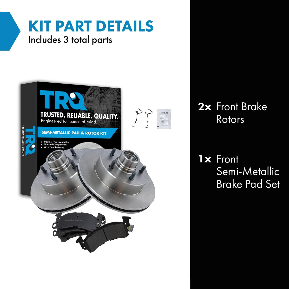 Semi-Metallic Brake Pad & Rotor KitKit Includes(1) Front Semi-Metallic Brake Pad Set(2) Front Brake RotorsFitmentCompatible with: 1993-02 Chevrolet Astro Rear Wheel Drive FrontCompatible with: 1993-02 GMC Safari Rear Wheel Drive FrontCompatible with: 1990-92 Chevrolet Astro Rear Wheel Drive Front with ABS BrakesCompatible with: 1990-92 GMC Safari Rear Wheel Drive Front with ABS BrakesProduct AttributesBrake Pad Friction Material: Semi-MetallicProduct Features Positive Molded - Less dust resulting in clean wheels G3000 Casting Alloy - Reduced noise and improved wear resistance Application Specific Design - Extended service life, no modificationsItem DetailsTRQ brake kits are designed to restore your brake system to like-new performance. TRQ brake pads are positive molded, thermal scorched, chamfered, and utilize a multi-layer shim for enhanced performance and service life. TRQ rotors have a non-directional finish that reduces the break-in period for new rotors as well as reducing vibrations throughout the rotors lifecycle. All products are fit and road-tested in our Massachusetts R&D facility to ensure we deliver on our promise of Trusted Reliable Quality.Reference NumbersAimco: 5578Bendix: PRT1464Buick: 1154578, 18024914Cadillac: 18024914Chevrolet: 12321435, 12321457, 12510015, 12510032, 18024904, 18024914, 18043837DuraGo: BR5578GMC: 12321435, 12510032, 18024904, 18043837Hollander: 530-01977Jeep: 83501356, 83504371Oldsmobile: 18024914Pontiac: 12300192, 18024914Raybestos Brakes: 56152, 56152FZN, 56152P, 56152R, EHT52Wagner: BD125171, BD180074