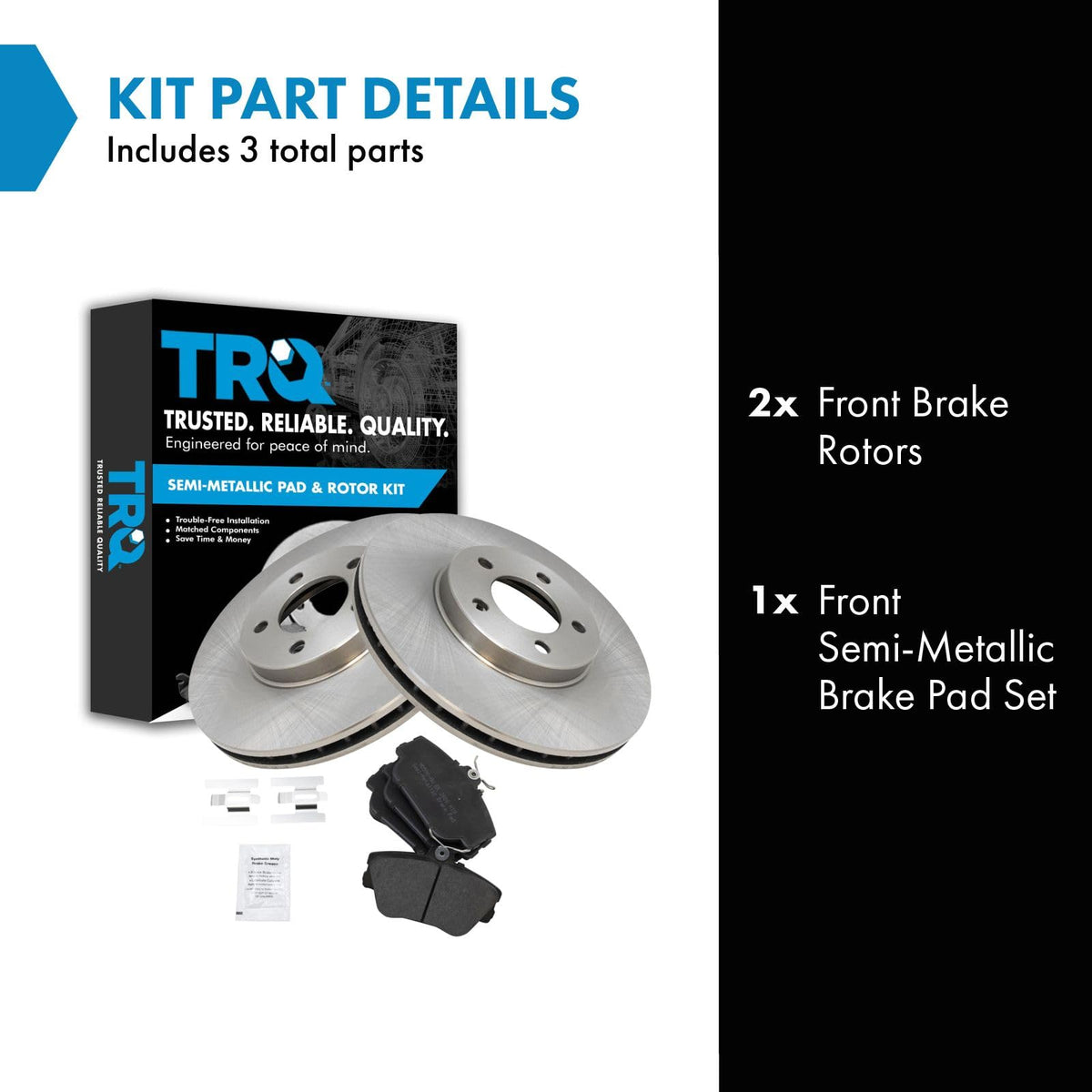 Semi-Metallic Brake Pad & Rotor KitKit Includes(1) Front Semi-Metallic Brake Pad Set(2) Front Brake RotorsFitmentCompatible with: 2001-07 Ford Taurus FrontCompatible with: 2001-05 Mercury Sable FrontCompatible with: 1996-99 Ford Taurus SHO FrontCompatible with: 1995-02 Lincoln Continental FrontCompatible with: 1996-97 Ford Thunderbird Front with Sport SuspensionCompatible with: 1996-98 Lincoln Mark VIII FrontCompatible with: 1996-97 Mercury Cougar Front with Sport SuspensionProduct AttributesFront Brake Rotor Diameter: 11.57 in. (294mm)Wheel Lug Count: 5 LugBrake Pad Bonding Type: Premium PosiBrake Pad Friction Material: Semi-MetallicFront Brake Rotor Venting Type: VentedProduct Features Positive Molded - Less dust resulting in clean wheels G3000 Casting Alloy - Reduced noise and improved wear resistance Application Specific Design - Extended service life, no modificationsItem DetailsTRQ brake kits are designed to restore your brake system to like-new performance. TRQ brake pads are positive molded, thermal scorched, chamfered, and utilize a multi-layer shim for enhanced performance and service life. TRQ rotors have a non-directional finish that reduces the break-in period for new rotors as well as reducing vibrations throughout the rotors lifecycle. All products are fit and road-tested in our Massachusetts R&D facility to ensure we deliver on our promise of Trusted Reliable Quality.Reference NumbersAimco: 54030Bendix: PRT5050DuraGo: BR54030Hollander: 530-01853Lincoln: F3LY2001A, F50Y2001A, XF3Z2001CBRaybestos Brakes: 66749, 66749FZN, 66749P, 66749R, EHT598HWagner: BD125532