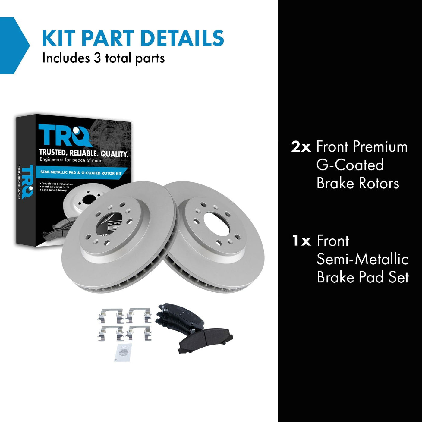 Semi-Metallic Brake Pad & Rotor KitKit Includes(1) Front Semi-Metallic Brake Pad Set(2) Front Premium G-Coated Brake RotorsFitmentCompatible with: 2006-11 Chevrolet Impala Front Semi-Metallic Premium G-Coated Brake Pad & Rotor KitCompatible with: 2012-13 Chevrolet Impala LS Front Semi-Metallic Premium G-Coated Brake Pad & Rotor KitCompatible with: 2012-13 Chevrolet Impala LT Front Semi-Metallic Premium G-Coated Brake Pad & Rotor KitCompatible with: 2012-13 Chevrolet Impala LTZ Front Semi-Metallic Premium G-Coated Brake Pad & Rotor KitCompatible with: 2006-08 Buick Lucerne V6 3.8L Front Semi-Metallic Premium G-Coated Brake Pad & Rotor KitCompatible with: 2014-16 Chevrolet Impala Limited LS Front Semi-Metallic Premium G-Coated Brake Pad & Rotor KitCompatible with: 2014-16 Chevrolet Impala Limited LTZ Front Semi-Metallic Premium G-Coated Brake Pad & Rotor KitCompatible with: 2014-16 Chevrolet Impala Limited LT Front Semi-Metallic Premium G-Coated Brake Pad & Rotor KitCompatible with: 2009-11 Buick Lucerne CX Front Semi-Metallic Premium G-Coated Brake Pad & Rotor KitCompatible with: 2009-11 Buick Lucerne CXL Front Semi-Metallic Premium G-Coated Brake Pad & Rotor KitCompatible with: 2006-07 Chevrolet Monte Carlo Front Semi-Metallic Premium G-Coated Brake Pad & Rotor KitCompatible with: 2010 Buick Lucerne CXL Special Edition Front Semi-Metallic Premium G-Coated Brake Pad & Rotor KitProduct AttributesBrake Rotor Diameter: 11.93 in. (303mm)Wheel Lug Count: 5 LugBrake Rotor Coating: Premium G-CoatedBrake Pad Bonding Type: Premium PosiBrake Pad Friction Material: Semi-MetallicBrake Rotor Venting Type: VentedProduct Features Positive Molded: Less dust resulting in clean wheels Electrostatic Coated: Long-lasting rust protection G3000 Casting Alloy: Reduced noise and improved wear resistance Application Specific Design: Extended service life, no modificationsItem DetailsTRQ brake kits are designed to restore your brake system to like-new performance. TRQ brake pads are positive molded, thermal scorched, chamfered, and utilize a multi-layer shim for enhanced performance and service life. TRQ G-coated rotors have long-lasting rust prevention, perfect for wheels with large openings that expose the rotor and rotor hat during daily drives. All products are fit and road-tested in our Massachusetts R&D facility to ensure we deliver on our promise of Trusted Reliable Quality.Reference NumbersAamco: 55126Aimco: 55126Buick: 15270292, 15812610, 25996832Cadillac: 15812610, 25996832Chevrolet: 15270292, 19207421, 19260481Raybestos Brakes: EHT1159H
