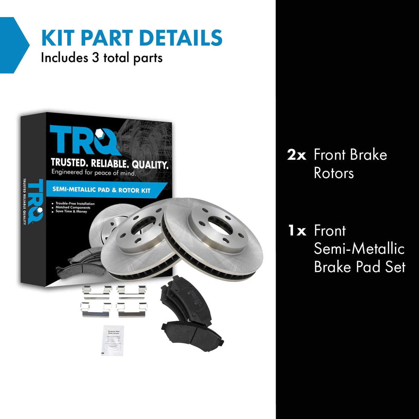 Semi-Metallic Brake Pad & Rotor KitKit Includes(1) Front Semi-Metallic Brake Pad Set(2) Front Brake RotorsFitmentCompatible with: 2000-05 Buick LeSabre Front with 15 Inch WheelsCompatible with: 1997-05 Buick Century FrontCompatible with: 1997-03 Pontiac Grand Prix FrontCompatible with: 1997-04 Buick Regal FrontCompatible with: 2000-05 Pontiac Bonneville SE FrontCompatible with: 2002-04 Chevrolet Venture Front Wheel Drive FrontCompatible with: 1997-01 Chevrolet Venture FrontCompatible with: 2002-04 Pontiac Montana Front Wheel Drive FrontCompatible with: 2000-02 Olds Intrigue FrontCompatible with: 1999-01 Pontiac Montana FrontCompatible with: 1997-01 Olds Silhouette FrontCompatible with: 2005 Pontiac Montana Base Model FrontCompatible with: 1998-99 Olds Intrigue Front with 278 mm Diameter Front RotorsCompatible with: 2002-04 Olds Silhouette Front Wheel Drive FrontCompatible with: 2005 Chevrolet Venture FrontCompatible with: 1997-98 Pontiac Trans Sport FrontCompatible with: 1999 Buick Riviera FrontProduct AttributesBrake Pad Bonding Type: Premium PosiBrake Pad Friction Material: Semi-MetallicProduct Features Positive Molded - Less dust resulting in clean wheels G3000 Casting Alloy - Reduced noise and improved wear resistance Application Specific Design - Extended service life, no modificationsItem DetailsTRQ brake kits are designed to restore your brake system to like-new performance. TRQ brake pads are positive molded, thermal scorched, chamfered, and utilize a multi-layer shim for enhanced performance and service life. TRQ rotors have a non-directional finish that reduces the break-in period for new rotors as well as reducing vibrations throughout the rotors lifecycle. All products are fit and road-tested in our Massachusetts R&D facility to ensure we deliver on our promise of Trusted Reliable Quality.Reference NumbersAimco: 55036Bendix: PRT5250Buick: 19152498Cadillac: 18029827Chevrolet: 18029828DuraGo: BR55036Hollander: 530-01981Oldsmobile: 18029827Pontiac: 19152498Raybestos Brakes: 56631, 56631FZN, 56631P, 56631R, EHT699HWagner: BD125507