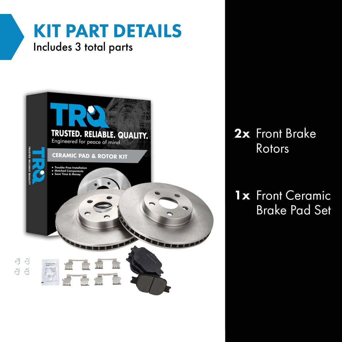 Ceramic Brake Pad & Rotor KitKit Includes(1) Front Ceramic Brake Pad Set(2) Front Brake RotorsFitmentCompatible with: 2005-10 Scion tC FrontCompatible with: 2001-05 Toyota Celica FrontCompatible with: 2000 Toyota Celica GTS FrontProduct AttributesFront Brake Rotor Diameter: 10.83 in. (275mm)Wheel Lug Count: 5 LugBrake Pad Friction Material: CeramicBrake Pad Bonding Type: Premium PosiFront Brake Rotor Venting Type: VentedProduct Features Positive Molded - Less dust resulting in clean wheels G3000 Casting Alloy - Reduced noise and improved wear resistance Application Specific Design - Extended service life, no modificationsItem DetailsTRQ brake kits are designed to restore your brake system to like-new performance. TRQ brake pads are positive molded, thermal scorched, chamfered, and utilize a multi-layer shim for enhanced performance and service life. TRQ rotors have a non-directional finish that reduces the break-in period for new rotors as well as reducing vibrations throughout the rotors lifecycle. All products are fit and road-tested in our Massachusetts R&D facility to ensure we deliver on our promise of Trusted Reliable Quality.Reference NumbersAimco: 31270Bendix: PRT5294DuraGo: BR31270Raybestos Brakes: 96934, 96934FZN, 96934P, 96934R, EHT817H, MGD817CH, SGD817CScion: 446521030Toyota: 044652B010, 446520540Wagner: BD126017