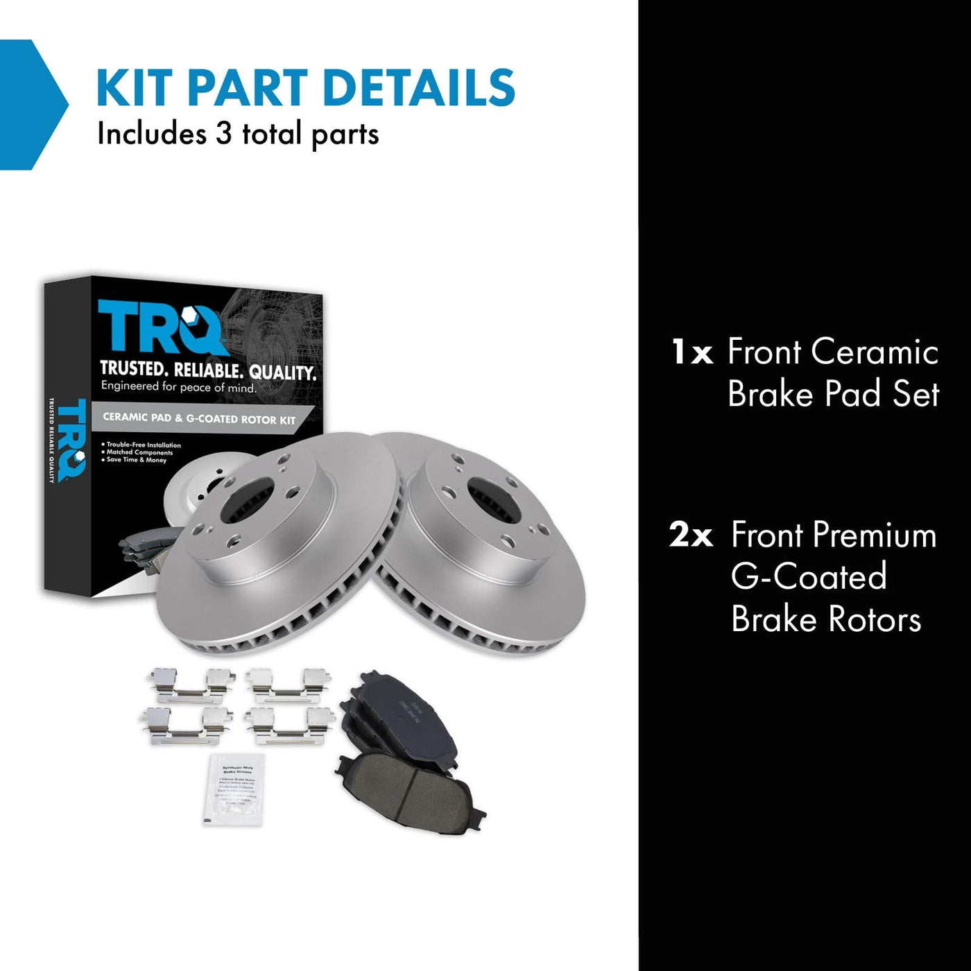 Ceramic Brake Pad & Rotor KitKit Includes(1) Front Ceramic Brake Pad Set(2) Front Premium G-Coated Brake RotorsFitmentCompatible with: 2005-15 Toyota Tacoma Rear Wheel Drive with 5 Lug Wheels Front Ceramic Premium G-Coated Brake Pad & Rotor KitProduct AttributesFront Brake Rotor Diameter: 10.83 in. (275mm)Wheel Lug Count: 5 LugBrake Pad Friction Material: CeramicBrake Rotor Coating: Premium G-CoatedBrake Pad Bonding Type: Premium PosiFront Brake Rotor Venting Type: VentedProduct Features Positive Molded: Less dust resulting in clean wheels Electrostatic Coated: Long-lasting rust protection G3000 Casting Alloy: Reduced noise and improved wear resistance Application Specific Design: Extended service life, no modificationsItem DetailsTRQ brake kits are designed to restore your brake system to like-new performance. TRQ brake pads are positive molded, thermal scorched, chamfered, and utilize a multi-layer shim for enhanced performance and service life. TRQ G-coated rotors have long-lasting rust prevention, perfect for wheels with large openings that expose the rotor and rotor hat during daily drives. All products are fit and road-tested in our Massachusetts R&D facility to ensure we deliver on our promise of Trusted Reliable Quality.Reference NumbersAimco: 31428Lexus: 446533270, 446533280Raybestos Brakes: EHT906H, MGD906CH, SGD906CToyota: 446504080, 446508030