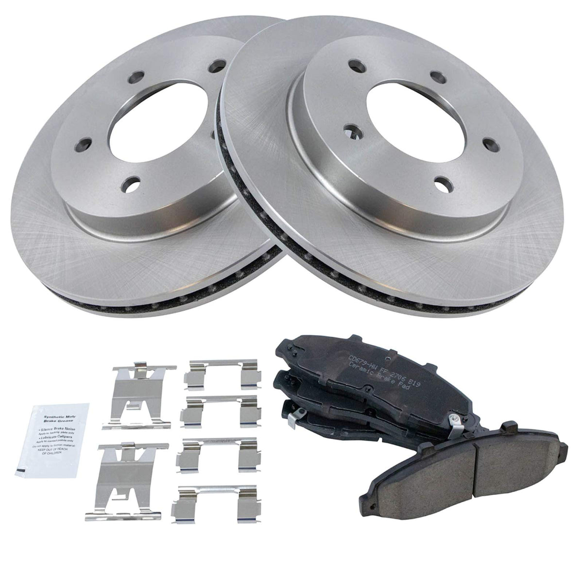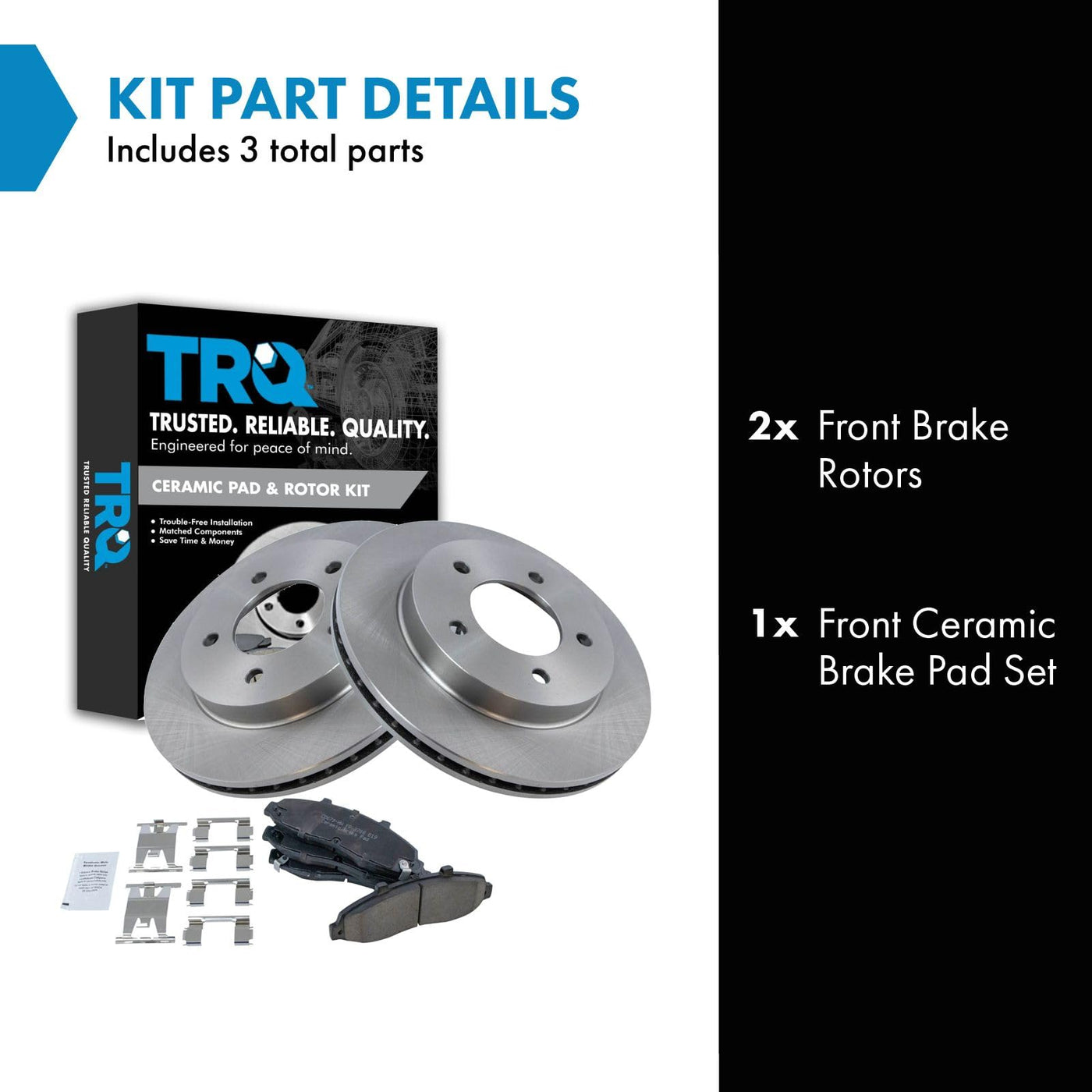 Ceramic Brake Pad & Rotor KitKit Includes(1) Front Ceramic Brake Pad Set(2) Front Brake RotorsFitmentCompatible with: 1999-03 Ford F150 Truck XL Front with 5 Lug Wheels with Rear Disc BrakesCompatible with: 1999-03 Ford F150 Truck Lariat Front with 5 Lug Wheels with Rear Disc BrakesCompatible with: 1999-03 Ford F150 Truck XLT Front with 5 Lug Wheels with Rear Disc BrakesCompatible with: 2000-03 Ford F150 Truck Harley-Davidson Edition Front with 5 Lug Wheels with Rear Disc BrakesCompatible with: 2001-03 Ford F150 Truck King Ranch Front with 5 Lug Wheels with Rear Disc BrakesCompatible with: 1999-00 Ford F150 Truck Base Model Front with 5 Lug Wheels with Rear Disc BrakesCompatible with: 1997-98 Ford F150 Truck Front with 4 Wheel ABS Brakes with 5 Lug WheelsCompatible with: 2004 Ford F150 Heritage Truck XL 11th Vin Digit C Front with 5 Lug Wheels with Rear Disc BrakesCompatible with: 2004 Ford F150 Heritage Truck XLT 11th Vin Digit C Front with 5 Lug Wheels with Rear Disc BrakesProduct AttributesFront Brake Rotor Diameter: 12.13 in. (308mm)Wheel Lug Count: 5 LugBrake Pad Friction Material: CeramicBrake Pad Bonding Type: Premium PosiFront Brake Rotor Venting Type: VentedProduct Features Positive Molded - Less dust resulting in clean wheels G3000 Casting Alloy - Reduced noise and improved wear resistance Application Specific Design - Extended service life, no modificationsItem DetailsTRQ brake kits are designed to restore your brake system to like-new performance. TRQ brake pads are positive molded, thermal scorched, chamfered, and utilize a multi-layer shim for enhanced performance and service life. TRQ rotors have a non-directional finish that reduces the break-in period for new rotors as well as reducing vibrations throughout the rotors lifecycle. All products are fit and road-tested in our Massachusetts R&D facility to ensure we deliver on our promise of Trusted Reliable Quality.Reference NumbersAimco: 54042Bendix: PRT5146DuraGo: BR54042Ford: F65Z2001AA, F85Z2001AAHollander: 530-01988, 530-02085Lincoln: F85Z2001AARaybestos Brakes: 66630, 66630FZN, 66630P, 66630PER, 66630R, EHT679H, MGD679CH, SGD679CWagner: BD125512
