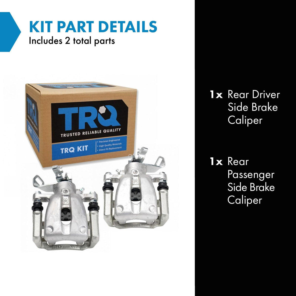 2 Piece Brake Caliper SetKit Includes(1) Rear Driver Side Brake Caliper(1) Rear Passenger Side Brake CaliperFitmentCompatible with: 2009-13 Mini Cooper without John Cooper Works Brake Package Rear Driver & Passenger SideProduct AttributesQuantity: 2 PieceIncludes: BracketIncludes: HardwareProduct Features Zinc Coated: Long lasting rust prevention EPDM Seals: Enhanced resistance to thermal deterioration No Core Charge: 100% new components Hardware and Abutment Kit Included: Complete repair in a single purchase Direct Replacement: No modifications necessaryItem DetailsTRQ brake calipers are made from premium raw materials designed to restore original performance. All TRQ calipers are new, so there will never be a core charge with your TRQ purchase. TRQ brake calipers include upgraded seals, washers, abutment kits and brackets where applicable to ensure a complete repair. TRQ recommends replacing your calipers in pairs with new brake pads and brake rotors to ensure components wear evenly and avoid multiple repairs of the same system. All products are fit and road-tested in our Massachusetts R&D facility to ensure we deliver on our promise of Trusted Reliable Quality.Reference NumbersCARDONE Reman: 19-B3318, 19-B3319DFC Calipers Outright Program - Archived: 330-32604, 331-32605Nugeon: 22-02401L, 22-02401RUAP: C34587, C34588UCX: 10-2868S, 10-2869S