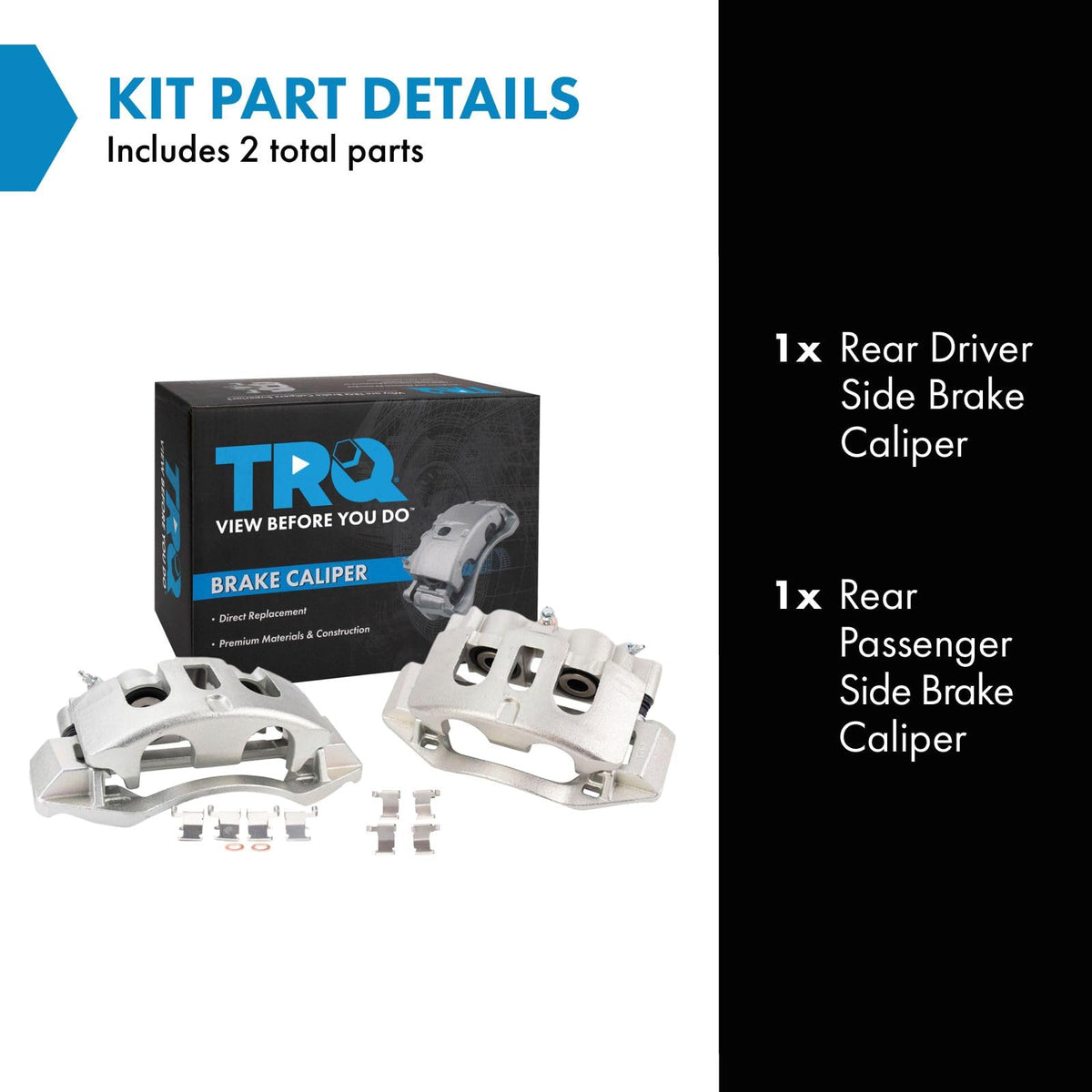 2 Piece Brake Caliper SetKit Includes(1) Rear Driver Side Brake Caliper(1) Rear Passenger Side Brake CaliperFitmentCompatible with: 2011-19 Chevrolet Silverado 2500 HD Rear Driver & Passenger SideCompatible with: 2011-19 GMC Sierra 2500 HD Rear Driver & Passenger SideCompatible with: 2011-19 Chevrolet Silverado 3500 HD with Single Rear Wheels SRW Rear Driver & Passenger SideCompatible with: 2016-19 Chevrolet Suburban with 8 Lug Wheels Rear Driver & Passenger SideCompatible with: 2011-19 GMC Sierra 3500 HD with Single Rear Wheels SRW Rear Driver & Passenger SideCompatible with: 2016 Chevrolet Suburban 3500 HD Rear Driver & Passenger SideProduct AttributesQuantity: 2 PieceProduct Features High-Temperature EPDM Seals and Boots: Improved resistance to thermal deterioration Electrostatic High Heat Powder Coating: Resist rust and corrosion Racing-Grade Silicone Lubricant Hardware and Abutment Kit Included 100% New ComponentsItem DetailsTRQ brake calipers are made from premium raw materials designed to restore original performance. All TRQ calipers are new, so there will never be a core charge with your TRQ purchase. TRQ brake calipers include upgraded seals, washers, abutment kits and brackets where applicable to ensure a complete repair. TRQ recommends replacing your calipers in pairs with new brake pads and brake rotors to ensure components wear evenly and avoid multiple repairs of the same system. All products are fit and road-tested in our Massachusetts R&D facility to ensure we deliver on our promise of Trusted Reliable Quality.Reference NumbersAdvance Auto Parts: 18-B5306, 18-B5307Better Brake Parts: 99-17444A, 99-17444BCARDONE Reman: 18-B5306, 18-B5307, 18-P5330, 18-P5331Centric Parts: 141.66537, 141.66538, 142.66537, 142.66538DFC Calipers Outright Program - Archived: 330-47728DNS: SC3135, SC3136Dynamic Friction Company: 331-47728, 331-47729, 333-47729NAPA BRAKES: SE5857A, SE5858ANugeon: 22-17444R, 99-17444A, 99-17444Bpromecanix: 11-26066-1Raybestos Brakes: FRC12465, FRC12465DN, FRC12465N, FRC12466UAP: C66537