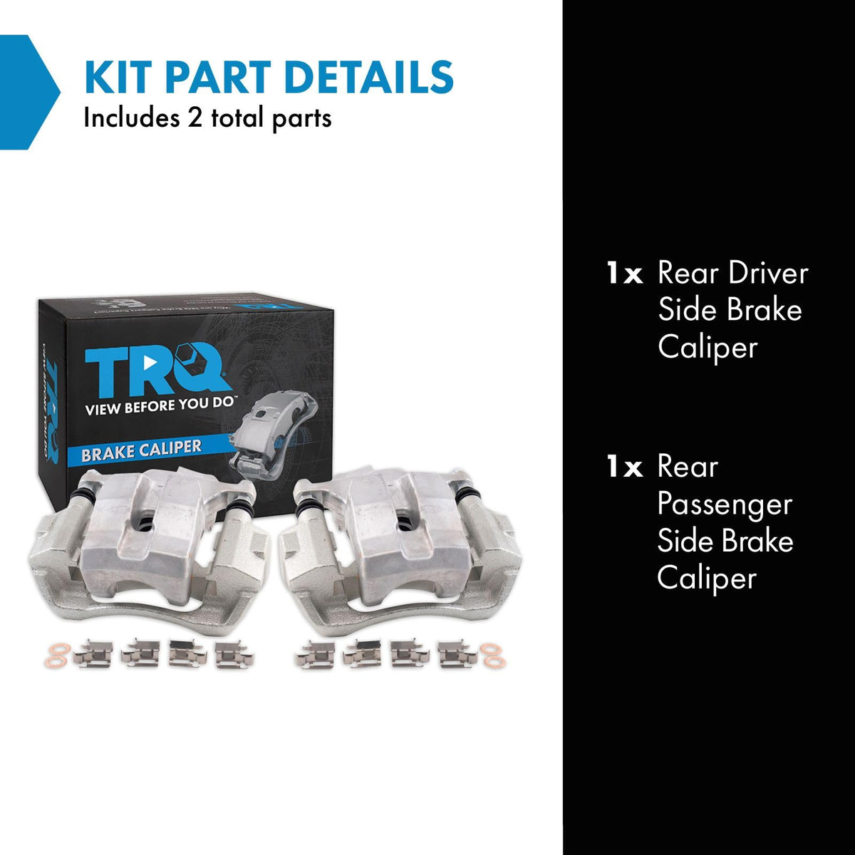 2 Piece Brake Caliper SetKit Includes(1) Rear Driver Side Brake Caliper(1) Rear Passenger Side Brake CaliperFitmentCompatible with: 2012-17 Toyota Prius V Rear Driver & Passenger SideProduct AttributesQuantity: 2 PieceProduct Features Zinc Coated: Long lasting rust prevention EPDM Seals: Enhanced resistance to thermal deterioration No Core Charge: 100% new components Hardware and Abutment Kit Included: Complete repair in a single purchase Direct Replacement: No modifications necessaryItem DetailsTRQ brake calipers are made from premium raw materials designed to restore original performance. All TRQ calipers are new, so there will never be a core charge with your TRQ purchase. TRQ brake calipers include upgraded seals, washers, abutment kits and brackets where applicable to ensure a complete repair. TRQ recommends replacing your calipers in pairs with new brake pads and brake rotors to ensure components wear evenly and avoid multiple repairs of the same system. All products are fit and road-tested in our Massachusetts R&D facility to ensure we deliver on our promise of Trusted Reliable Quality.Reference NumbersCARDONE Reman: 19-B7026, 19-B7027Raybestos Brakes: FRC12818C