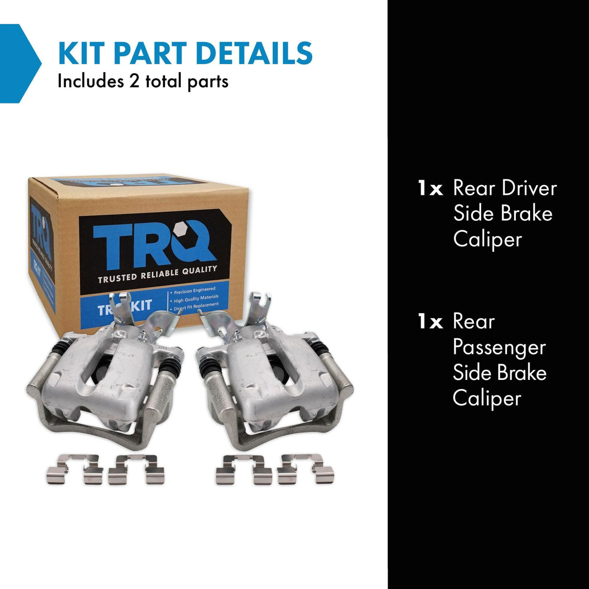 2 Piece Brake Caliper SetKit Includes(1) Rear Driver Side Brake Caliper(1) Rear Passenger Side Brake CaliperFitmentCompatible with: 2014-15 Chevrolet Malibu L4 2.5L Rear Driver & Passenger SideCompatible with: 2016 Chevrolet Malibu L4 1.5L with Brake Code J60 Rear Driver & Passenger SideCompatible with: 2014 Chevrolet Malibu L4 2.4L Rear Driver & Passenger SideCompatible with: 2016 Chevrolet Malibu Limited Rear Driver & Passenger SideProduct AttributesQuantity: 2 PieceProduct Features Zinc Coated: Long lasting rust prevention EPDM Seals: Enhanced resistance to thermal deterioration No Core Charge: 100% new components Hardware and Abutment Kit Included: Complete repair in a single purchase Direct Replacement: No modifications necessaryItem DetailsTRQ brake calipers are made from premium raw materials designed to restore original performance. All TRQ calipers are new, so there will never be a core charge with your TRQ purchase. TRQ brake calipers include upgraded seals, washers, abutment kits and brackets where applicable to ensure a complete repair. TRQ recommends replacing your calipers in pairs with new brake pads and brake rotors to ensure components wear evenly and avoid multiple repairs of the same system. All products are fit and road-tested in our Massachusetts R&D facility to ensure we deliver on our promise of Trusted Reliable Quality.Reference NumbersCARDONE Reman: 18-B5504, 18-B5505Raybestos Brakes: FRC12889C, FRC12889N, FRC12890N