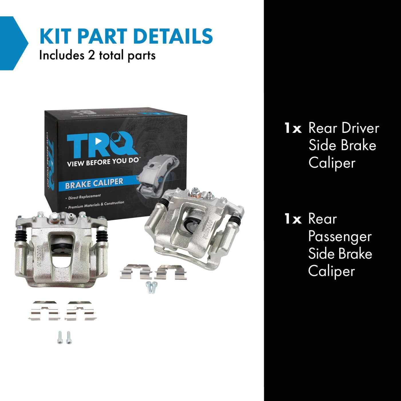 2 Piece Brake Caliper SetKit Includes(1) Rear Driver Side Brake Caliper(1) Rear Passenger Side Brake CaliperFitmentCompatible with: 2014-16 Kia Optima Hybrid EX Rear Driver & Passenger SideProduct AttributesQuantity: 2 PieceProduct Features Zinc Coated: Long lasting rust prevention EPDM Seals: Enhanced resistance to thermal deterioration No Core Charge: 100% new components Hardware and Abutment Kit Included: Complete repair in a single purchase Direct Replacement: No modifications necessaryItem DetailsTRQ brake calipers are made from premium raw materials designed to restore original performance. All TRQ calipers are new, so there will never be a core charge with your TRQ purchase. TRQ brake calipers include upgraded seals, washers, abutment kits and brackets where applicable to ensure a complete repair. TRQ recommends replacing your calipers in pairs with new brake pads and brake rotors to ensure components wear evenly and avoid multiple repairs of the same system. All products are fit and road-tested in our Massachusetts R&D facility to ensure we deliver on our promise of Trusted Reliable Quality.Reference NumbersCARDONE Reman: 19-B7118, 19-B7119CARDONE: 19B7118NM, 19B7119NMCentric Parts: 141.50511, 141.50512, 142.50511, 142.50512DFC Calipers Outright Program - Archived: 331-21610, 331-21611Kia: 583103ZA00, 583113ZA00Raybestos Brakes: FRC12797N, FRC12798NUAP: C50511, C50512