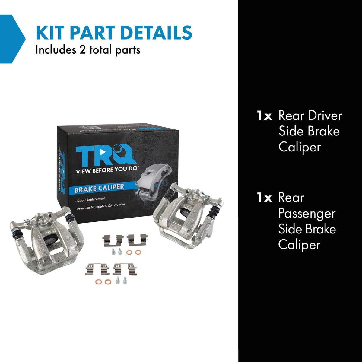 2 Piece Brake Caliper SetKit Includes(1) Rear Driver Side Brake Caliper(1) Rear Passenger Side Brake CaliperFitmentCompatible with: 2018-20 Chevrolet Equinox Rear Driver & Passenger SideCompatible with: 2016-18 Chevrolet Malibu with Electric Parking Brake Rear Driver & Passenger SideCompatible with: 2018-21 GMC Terrain Rear Driver & Passenger SideCompatible with: 2017-19 Buick LaCrosse with Electric Parking Brake Rear Driver & Passenger SideProduct AttributesQuantity: 2 PieceProduct Features High-Temperature EPDM Seals and Boots: Improved resistance to thermal deterioration Electrostatic High Heat Powder Coating: Resist rust and corrosion Racing-Grade Silicone Lubricant Hardware and Abutment Kit Included 100% New ComponentsItem DetailsTRQ brake calipers are made from premium raw materials designed to restore original performance. All TRQ calipers are new, so there will never be a core charge with your TRQ purchase. TRQ brake calipers include upgraded seals, washers, abutment kits and brackets where applicable to ensure a complete repair. TRQ recommends replacing your calipers in pairs with new brake pads and brake rotors to ensure components wear evenly and avoid multiple repairs of the same system. All products are fit and road-tested in our Massachusetts R&D facility to ensure we deliver on our promise of Trusted Reliable Quality.Reference NumbersCARDONE Reman: 18-B5544, 18-B5545CARDONE: 18B5544, 18B5545Raybestos Brakes: FRC12895N, FRC12896N