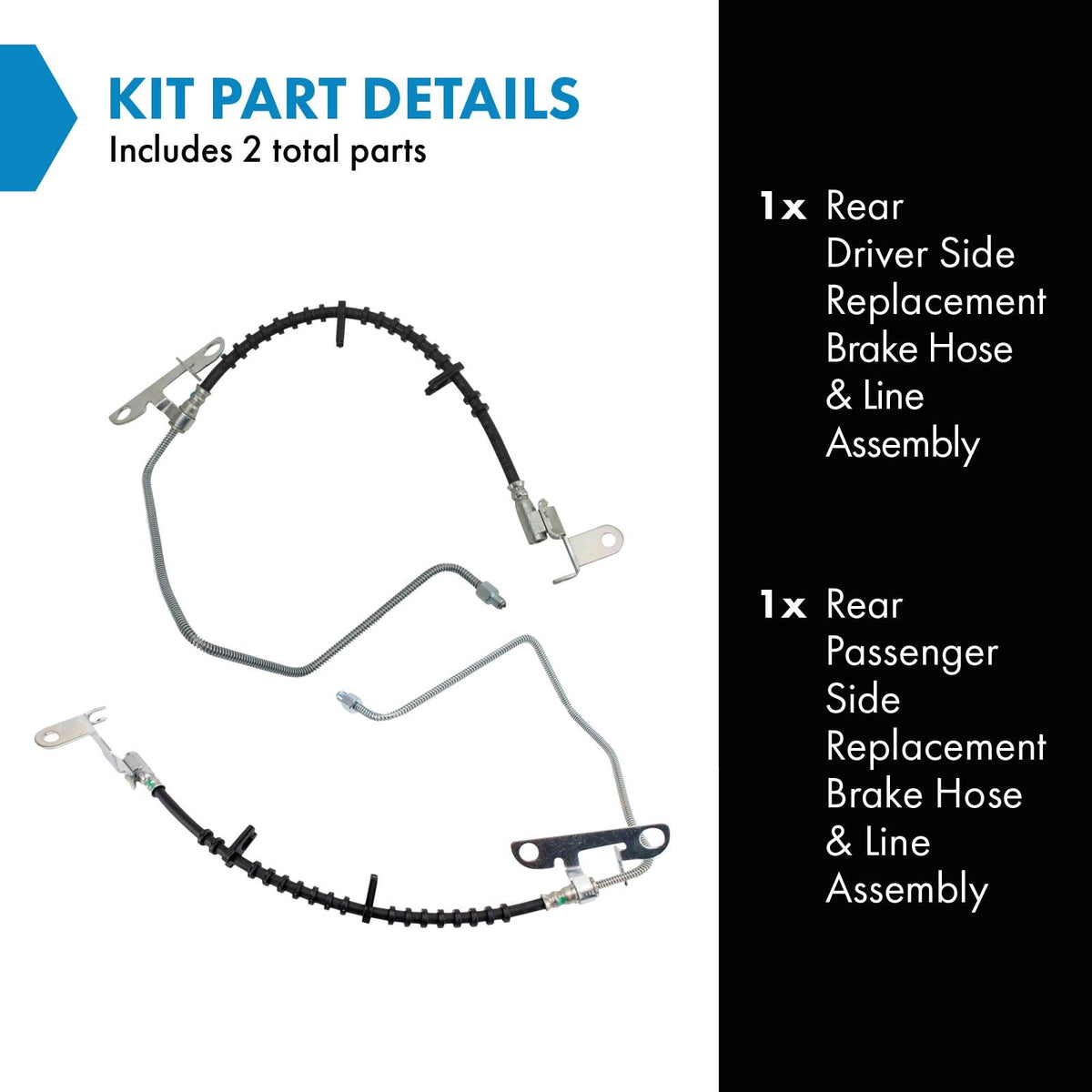 2 Piece Brake Hose SetKit Includes(1) Rear Driver Side Replacement Brake Hose & Line Assembly(1) Rear Passenger Side Replacement Brake Hose & Line AssemblyFitmentCompatible with: 2005 Dodge Grand Caravan Rear Driver & Passenger Side with Rear Drum BrakesCompatible with: 2003 Dodge Grand Caravan Front Wheel Drive Rear Driver & Passenger Side with Rear Drum BrakesCompatible with: 2003 Chrysler Town & Country Front Wheel Drive Rear Driver & Passenger Side with Rear Drum BrakesCompatible with: 2004 Chrysler Town & Country LX with 119.3 in. Wheel Base Rear Driver & Passenger SideCompatible with: 2004 Chrysler Town & Country Base Model with 119.3 in. Wheel Base Rear Driver & Passenger SideProduct AttributesQuantity: 2 PieceProduct Features Safety assured: Certified by DOT Upgraded performance: Improves pedal firmness and brake responsiveness Upgraded durability: Premium PTFE core Enhanced protection: Corrosion resistant clear, nylon outer jacket Engineered to meet or exceed OEM standards Precision designed for a perfect fitReference NumbersACDelco: 18J4268, 18J4269Centric Parts: 150.67341Chrysler: 4721183AB, 4721183AF, 4721322AA, 4721322AB, 4721322AC, 4721322ADDorman - First Stop: H620141Dorman: H620141R1 Concepts: 350-40253Raybestos Brakes: BH382346, BH382348Sunsong: 2204363, 2204765Wagner Brake: BH142194
