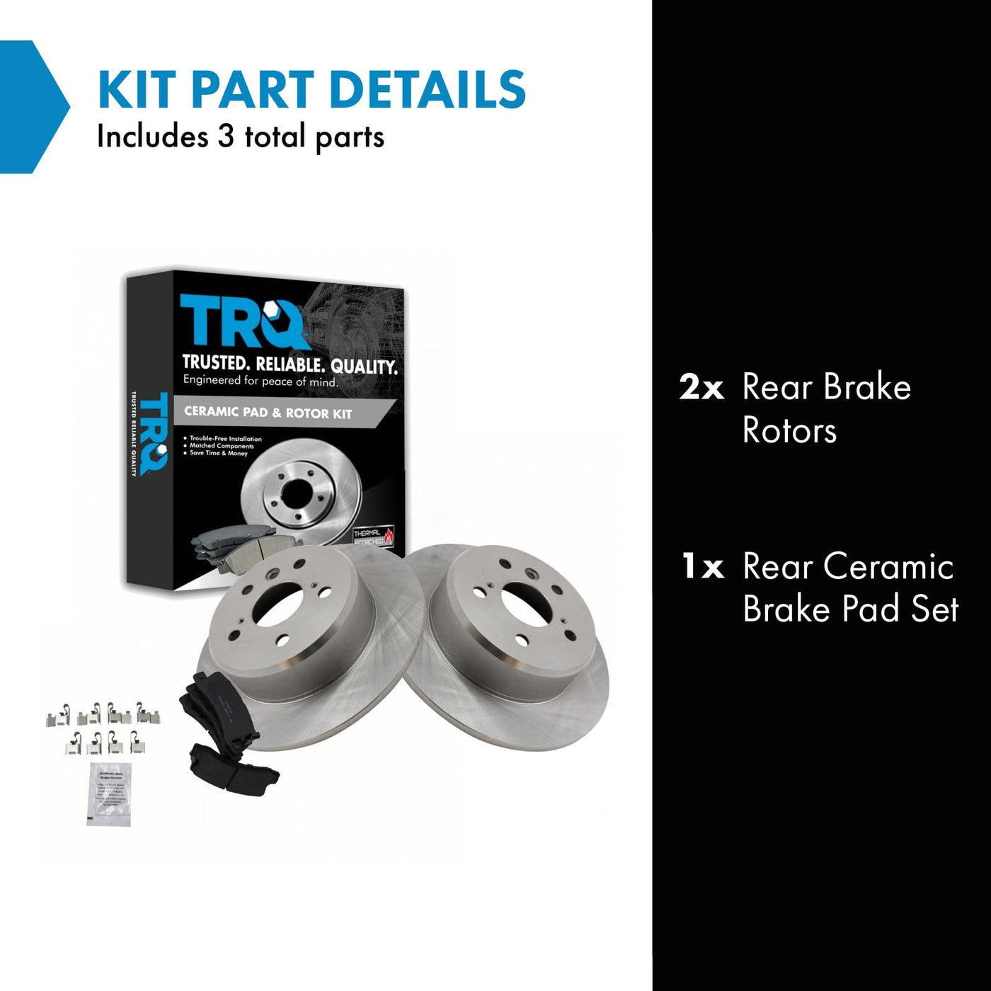 Ceramic Brake Pad & Rotor KitKit Includes(1) Rear Ceramic Brake Pad Set(2) Rear Brake RotorsFitmentCompatible with: 1992-96 Toyota Camry Wagon V6 3.0L RearCompatible with: 1999-03 Lexus RX300 Front Wheel Drive RearCompatible with: 1992-96 Lexus ES300 RearProduct AttributesRear Brake Rotor Diameter: 11.34 in. (288mm)Wheel Lug Count: 5 LugBrake Pad Friction Material: CeramicBrake Pad Bonding Type: Premium PosiRear Brake Rotor Venting Type: SolidProduct Features Positive Molded - Less dust resulting in clean wheels G3000 Casting Alloy - Reduced noise and improved wear resistance Application Specific Design - Extended service life, no modificationsItem DetailsTRQ brake kits are designed to restore your brake system to like-new performance. TRQ brake pads are positive molded, thermal scorched, chamfered, and utilize a multi-layer shim for enhanced performance and service life. TRQ rotors have a non-directional finish that reduces the break-in period for new rotors as well as reducing vibrations throughout the rotors lifecycle. All products are fit and road-tested in our Massachusetts R&D facility to ensure we deliver on our promise of Trusted Reliable Quality.Reference NumbersAimco: 31110, 31400Bendix: PRT1800DIY Solutions: BFS00437DuraGo: BR31110Hollander: 533-58281Lexus: 446632010, 446633040, 446633050, 446633110, 449232010, 449232070, 449233010Raybestos Brakes: 96503, 96503FZN, 96503P, 96503R, 980200, 980200FZN, 980200P, 980200R, EHT325H, MGD325CH, SGD325CToyota: 446620080, 446632010, 446632050, 446633010, 446633040, 449220011, 449220050, 449220051, 449220060, 449220061, 449232040, 449232041, 449233010Wagner: BD125260