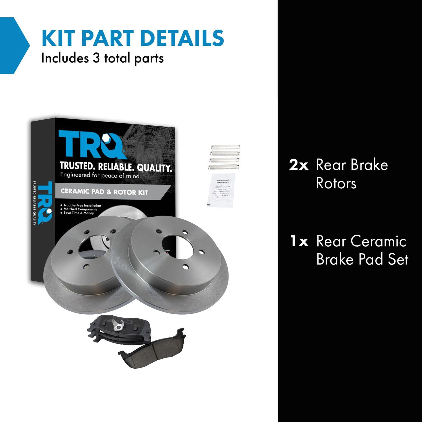 Ceramic Brake Pad & Rotor KitKit Includes(1) Rear Ceramic Brake Pad Set(2) Rear Brake RotorsFitmentCompatible with: 1999-03 Ford F150 Truck Rear with 5 Lug Wheels with Rear Disc BrakesCompatible with: 1997-02 Ford Expedition RearCompatible with: 2004 Ford F150 Heritage Truck 11th Vin Digit C Rear with 5 Lug Wheels with Rear Disc BrakesCompatible with: 1998-02 Lincoln Navigator RearCompatible with: 2002 Lincoln Blackwood RearProduct AttributesRear Brake Rotor Diameter: 13.15 in. (334mm)Wheel Lug Count: 5 LugBrake Pad Friction Material: CeramicBrake Pad Bonding Type: Premium PosiRear Brake Rotor Venting Type: VentedProduct Features Positive Molded - Less dust resulting in clean wheels G3000 Casting Alloy - Reduced noise and improved wear resistance Application Specific Design - Extended service life, no modificationsItem DetailsTRQ brake kits are designed to restore your brake system to like-new performance. TRQ brake pads are positive molded, thermal scorched, chamfered, and utilize a multi-layer shim for enhanced performance and service life. TRQ rotors have a non-directional finish that reduces the break-in period for new rotors as well as reducing vibrations throughout the rotors lifecycle. All products are fit and road-tested in our Massachusetts R&D facility to ensure we deliver on our promise of Trusted Reliable Quality.Reference NumbersAimco: 54047, 54090Bendix: PRT5140, PRT5299DuraGo: BR54090Ford: F75Z2200BA, XL3Z2200AALincoln: 3W1Z2200BA, 6W1Z2200BA, F75Z2200BA, XL3Z2200AARaybestos Brakes: 66670, 66670FZN, 66670P, 66670R, 66947, 66947FZN, 66947P, 66947R, EHT711H, MGD711CH, SGD711CWagner: BD125752