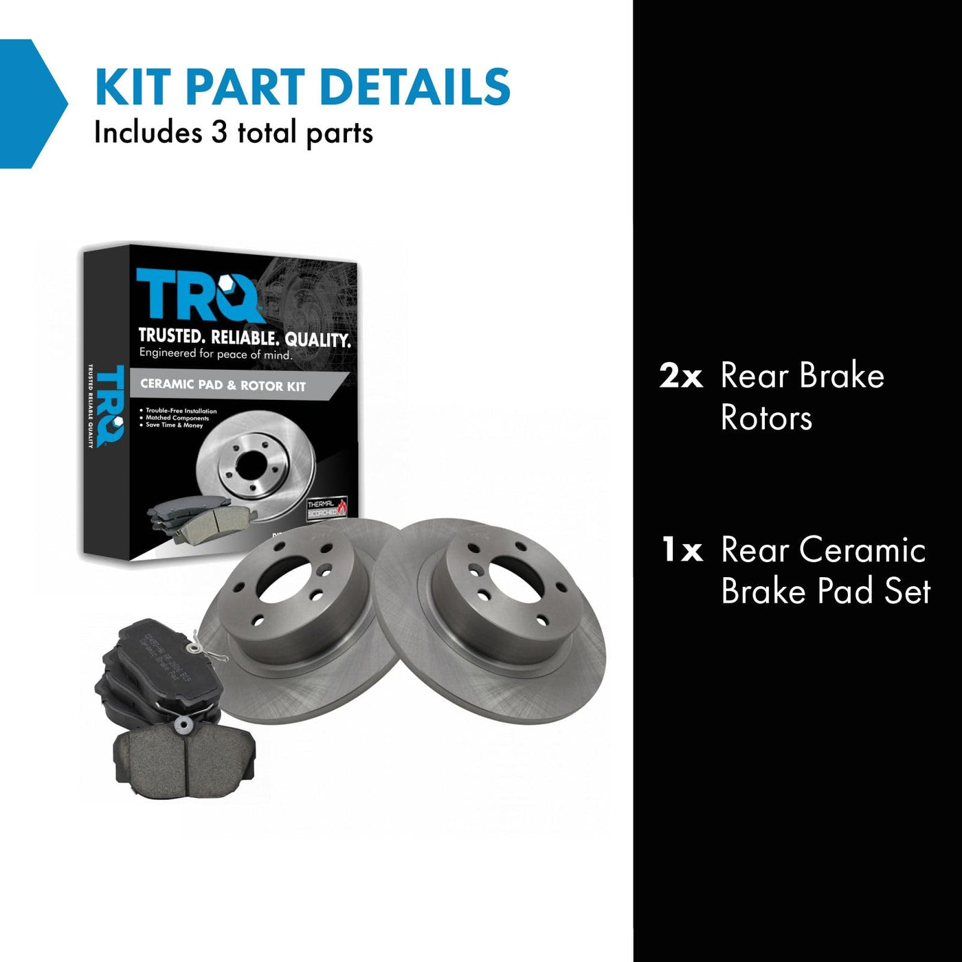 Ceramic Brake Pad & Rotor KitKit Includes(1) Rear Ceramic Brake Pad Set(2) Rear Brake RotorsFitmentCompatible with: 2000-04 Land Rover Discovery RearCompatible with: 1996-02 Land Rover Range Rover RearCompatible with: 1999 Land Rover Discovery Series II RearCompatible with: 1995 Land Rover Range Rover SE RearProduct AttributesBrake Pad Friction Material: CeramicBrake Pad Bonding Type: Premium PosiProduct Features Positive Molded - Less dust resulting in clean wheels G3000 Casting Alloy - Reduced noise and improved wear resistance Application Specific Design - Extended service life, no modificationsItem DetailsTRQ brake kits are designed to restore your brake system to like-new performance. TRQ brake pads are positive molded, thermal scorched, chamfered, and utilize a multi-layer shim for enhanced performance and service life. TRQ rotors have a non-directional finish that reduces the break-in period for new rotors as well as reducing vibrations throughout the rotors lifecycle. All products are fit and road-tested in our Massachusetts R&D facility to ensure we deliver on our promise of Trusted Reliable Quality.Reference NumbersAimco: 34146Bendix: PRT5121BMW: 34111160522, 34111162481DuraGo: BR34146Land Rover: SFP100470, SFP500130, STC1879, STC3684Raybestos Brakes: 96728, 96728FZN, 96728P, 96728R, EHT493Wagner: BD125540