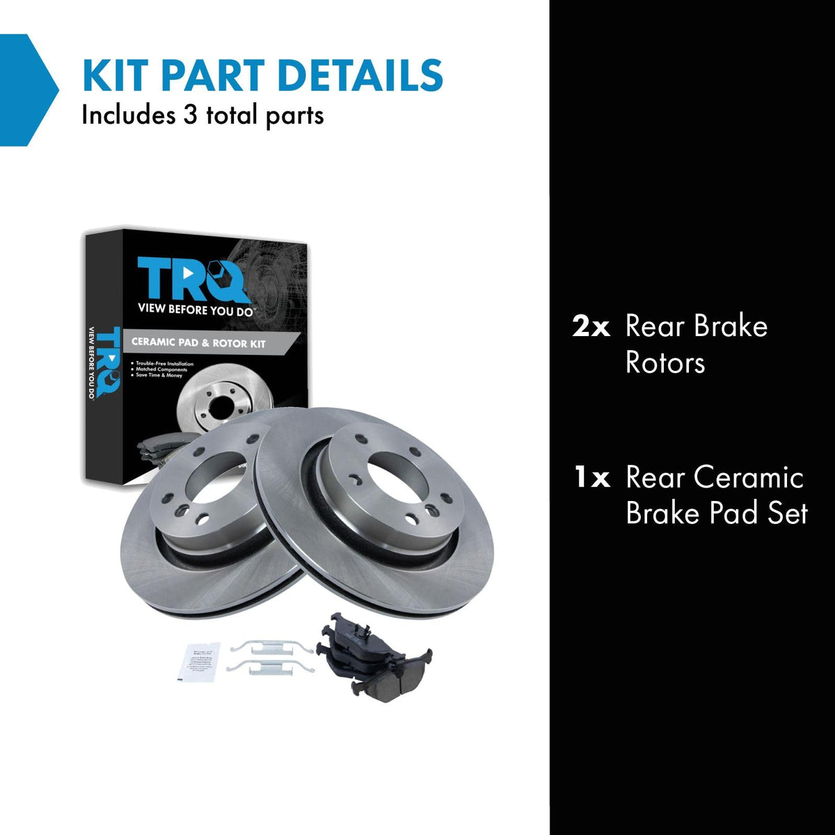 Ceramic Brake Pad & Rotor KitKit Includes(1) Rear Ceramic Brake Pad Set(2) Rear Brake RotorsFitmentCompatible with: 2000 BMW 323i Wagon RearCompatible with: 1999-00 BMW 328i RearCompatible with: 2000 BMW 323Ci Convertible RearCompatible with: 2000 BMW 328Ci RearProduct AttributesBrake Pad Friction Material: CeramicBrake Pad Bonding Type: Premium PosiProduct Features Positive Molded - Less dust resulting in clean wheels G3000 Casting Alloy - Reduced noise and improved wear resistance Application Specific Design - Extended service life, no modificationsItem DetailsTRQ brake kits are designed to restore your brake system to like-new performance. TRQ brake pads are positive molded, thermal scorched, chamfered, and utilize a multi-layer shim for enhanced performance and service life. TRQ rotors have a non-directional finish that reduces the break-in period for new rotors as well as reducing vibrations throughout the rotors lifecycle. All products are fit and road-tested in our Massachusetts R&D facility to ensure we deliver on our promise of Trusted Reliable Quality.Reference NumbersAimco: 34220Bendix: PRT5417BMW: 34211157334, 34211157814, 34211158221, 34211160198, 34211160199, 34211160533, 34211162536, 34212226092DuraGo: BR34220Hollander: 533-58560Raybestos Brakes: 980127, 980127FZN, 980127P, 980127R, PGD396MWagner: BD126247