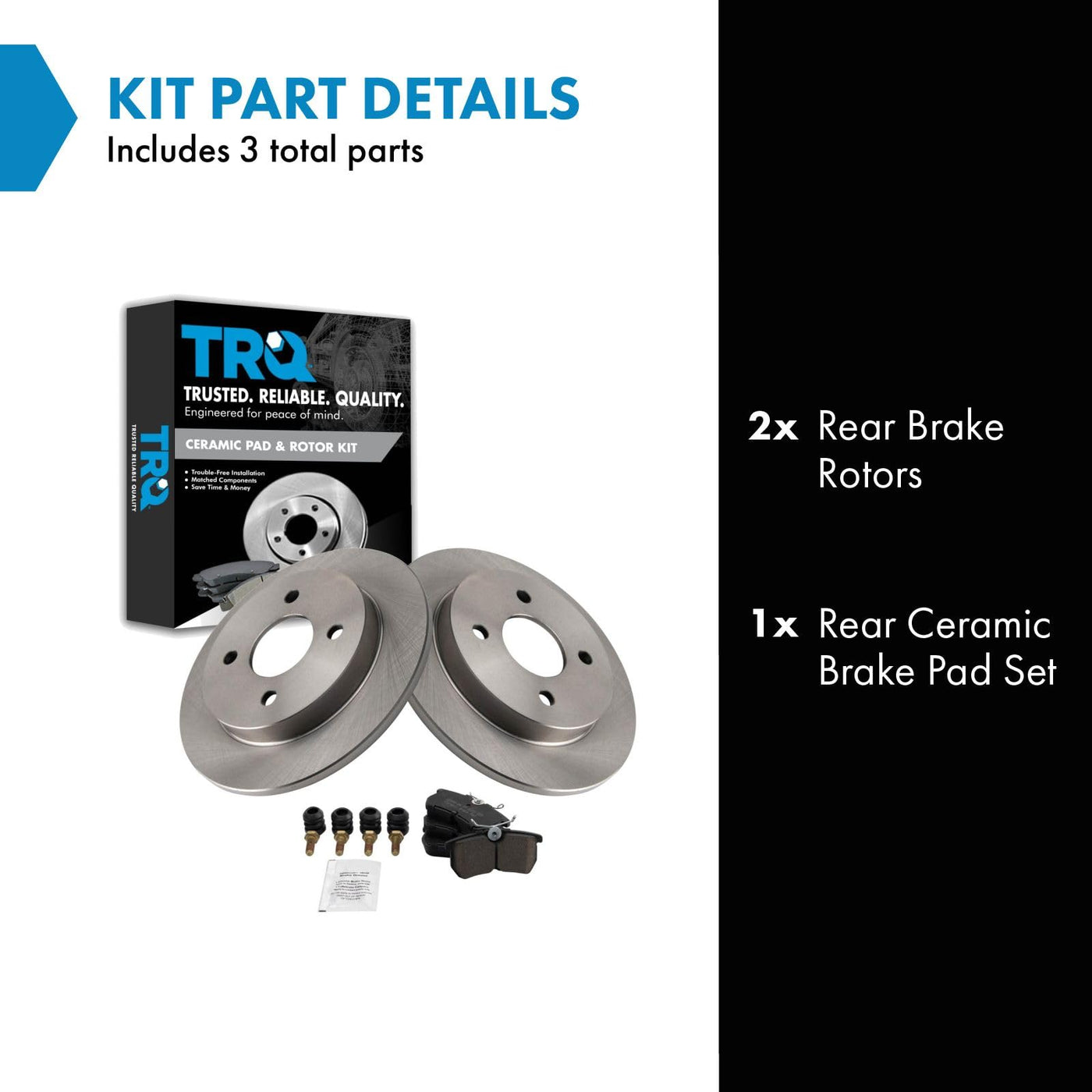 Ceramic Brake Pad & Rotor KitKit Includes(1) Rear Ceramic Brake Pad Set(2) Rear Brake RotorsFitmentCompatible with: 2005-07 Ford Focus RearCompatible with: 2002-04 Ford Focus LX RearCompatible with: 2002-04 Ford Focus SE RearCompatible with: 2002-04 Ford Focus ZX5 RearCompatible with: 2002-04 Ford Focus ZTW RearCompatible with: 2002-04 Ford Focus ZTS RearCompatible with: 2002-04 Ford Focus ZX3 RearCompatible with: 2001 Ford Focus RearProduct AttributesWheel Lug Count: 4 LugRear Brake Rotor Diameter: 9.96 in. (253mm)Brake Pad Friction Material: CeramicBrake Pad Bonding Type: Premium PosiRear Brake Rotor Venting Type: SolidProduct Features Positive Molded - Less dust resulting in clean wheels G3000 Casting Alloy - Reduced noise and improved wear resistance Application Specific Design - Extended service life, no modificationsItem DetailsTRQ brake kits are designed to restore your brake system to like-new performance. TRQ brake pads are positive molded, thermal scorched, chamfered, and utilize a multi-layer shim for enhanced performance and service life. TRQ rotors have a non-directional finish that reduces the break-in period for new rotors as well as reducing vibrations throughout the rotors lifecycle. All products are fit and road-tested in our Massachusetts R&D facility to ensure we deliver on our promise of Trusted Reliable Quality.Reference NumbersAimco: 54095Bendix: PRT5312DuraGo: BR54095Ford: 1S4Z2200BA, C1BZ2200ARaybestos Brakes: 680035, 680035FZN, 680035P, 680035R, PGD886MWagner: BD126006
