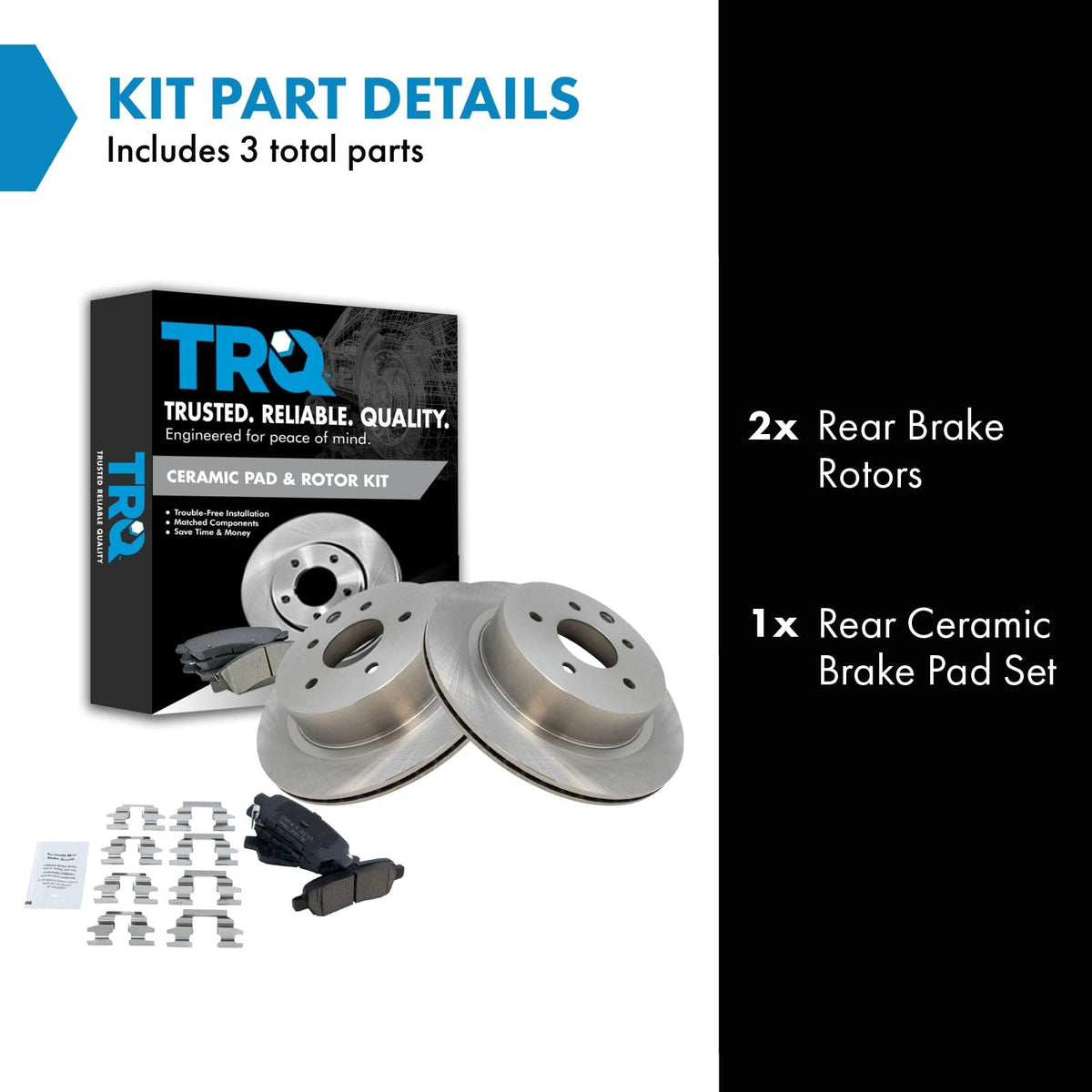 Ceramic Brake Pad & Rotor KitKit Includes(1) Rear Ceramic Brake Pad Set(2) Rear Brake RotorsFitmentCompatible with: 2008-17 Nissan Rogue RearCompatible with: 2018 Nissan Rogue Rear with Manual Parking BrakeCompatible with: 2019 Nissan Rogue SV Hybrid Rear with Manual Parking BrakeCompatible with: 2019 Nissan Rogue SL Hybrid Rear with Manual Parking BrakeCompatible with: 2019 Nissan Rogue SV Rear with Manual Parking BrakeCompatible with: 2019 Nissan Rogue S Rear with Manual Parking BrakeCompatible with: 2020 Nissan Rogue Rear with Manual Parking BrakeCompatible with: 2017-18 Nissan Rogue Sport RearCompatible with: 2014-15 Nissan Rogue Select RearCompatible with: 2021-22 Nissan Rogue Sport SV Rear with Manual Parking Brake with Vented Rear RotorsCompatible with: 2021-22 Nissan Rogue Sport S Rear with Manual Parking Brake with Vented Rear RotorsCompatible with: 2003-04 Infiniti G35 Rear with Single Piston Rear CalipersCompatible with: 2020 Nissan Rogue Sport Rear with Manual Parking BrakeCompatible with: 2019 Nissan Rogue Sport SV Rear with Manual Parking BrakeCompatible with: 2019 Nissan Rogue Sport S Rear with Manual Parking BrakeCompatible with: 2011-16 Nissan Leaf RearCompatible with: 2003-05 Nissan 350Z Rear with Single Piston Rear CalipersCompatible with: 2017-21 Nissan Leaf Rear with Manual Parking BrakeCompatible with: 2005 Infiniti G35 All Wheel Drive RearCompatible with: 2022-23 Nissan Leaf Rear with Manual Parking Brake with Vented Rear RotorsProduct AttributesRear Brake Rotor Diameter: 11.50 in. (292mm)Wheel Lug Count: 5 LugBrake Pad Friction Material: CeramicBrake Pad Bonding Type: Premium PosiRear Brake Rotor Venting Type: SolidProduct Features Positive Molded - Less dust resulting in clean wheels G3000 Casting Alloy - Reduced noise and improved wear resistance Application Specific Design - Extended service life, no modificationsItem DetailsTRQ brake kits are designed to restore your brake system to like-new performance. TRQ brake pads are positive molded, thermal scorched, chamfered, and utilize a multi-layer shim for enhanced performance and service life. TRQ rotors have a non-directional finish that reduces the break-in period for new rotors as well as reducing vibrations throughout the rotors lifecycle. All products are fit and road-tested in our Massachusetts R&D facility to ensure we deliver on our promise of Trusted Reliable Quality.Reference NumbersAimco: 31349Bendix: PRT5536DuraGo: BR31349INFINITI: 44060AL585, 44060AM485, 44060EG00J, 44060EG00K, 44060EG085Nissan: 440608H385, 44060AL585, 44060AL586, 44060AM485, 44060CB10J, 44060EG00J, D40608H385Raybestos Brakes: 980113, 980113FZN, 980113P, 980113R, EHT1288H, EHT905H, MGD905CHWagner Brake: ZD1393Wagner: BD126093