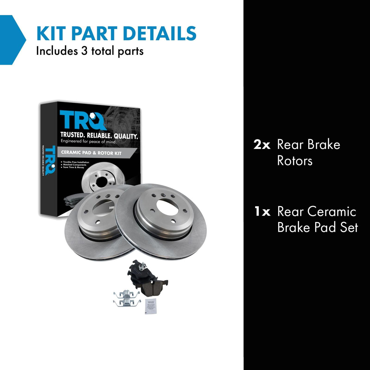Ceramic Brake Pad & Rotor KitKit Includes(1) Rear Ceramic Brake Pad Set(2) Rear Brake RotorsFitmentCompatible with: 2004-07 BMW 530i RearCompatible with: 2008-10 BMW 528i RearCompatible with: 2004-07 BMW 525i RearProduct AttributesRear Brake Rotor Diameter: 12.60 in. (320mm)Wheel Lug Count: 5 LugBrake Pad Friction Material: CeramicBrake Pad Bonding Type: Premium PosiRear Brake Rotor Venting Type: VentedProduct Features Positive Molded - Less dust resulting in clean wheels G3000 Casting Alloy - Reduced noise and improved wear resistance Application Specific Design - Extended service life, no modificationsItem DetailsTRQ brake kits are designed to restore your brake system to like-new performance. TRQ brake pads are positive molded, thermal scorched, chamfered, and utilize a multi-layer shim for enhanced performance and service life. TRQ rotors have a non-directional finish that reduces the break-in period for new rotors as well as reducing vibrations throughout the rotors lifecycle. All products are fit and road-tested in our Massachusetts R&D facility to ensure we deliver on our promise of Trusted Reliable Quality.Reference NumbersAimco: 34278Bendix: PRT5885BMW: 34216763043, 34216763044, 34216776937, 34216784135, 34216857108, 34216868497DuraGo: BR900734Raybestos Brakes: 980379, 980379FZN, 980379P, 980379R, EHT1042Wagner: BD126522