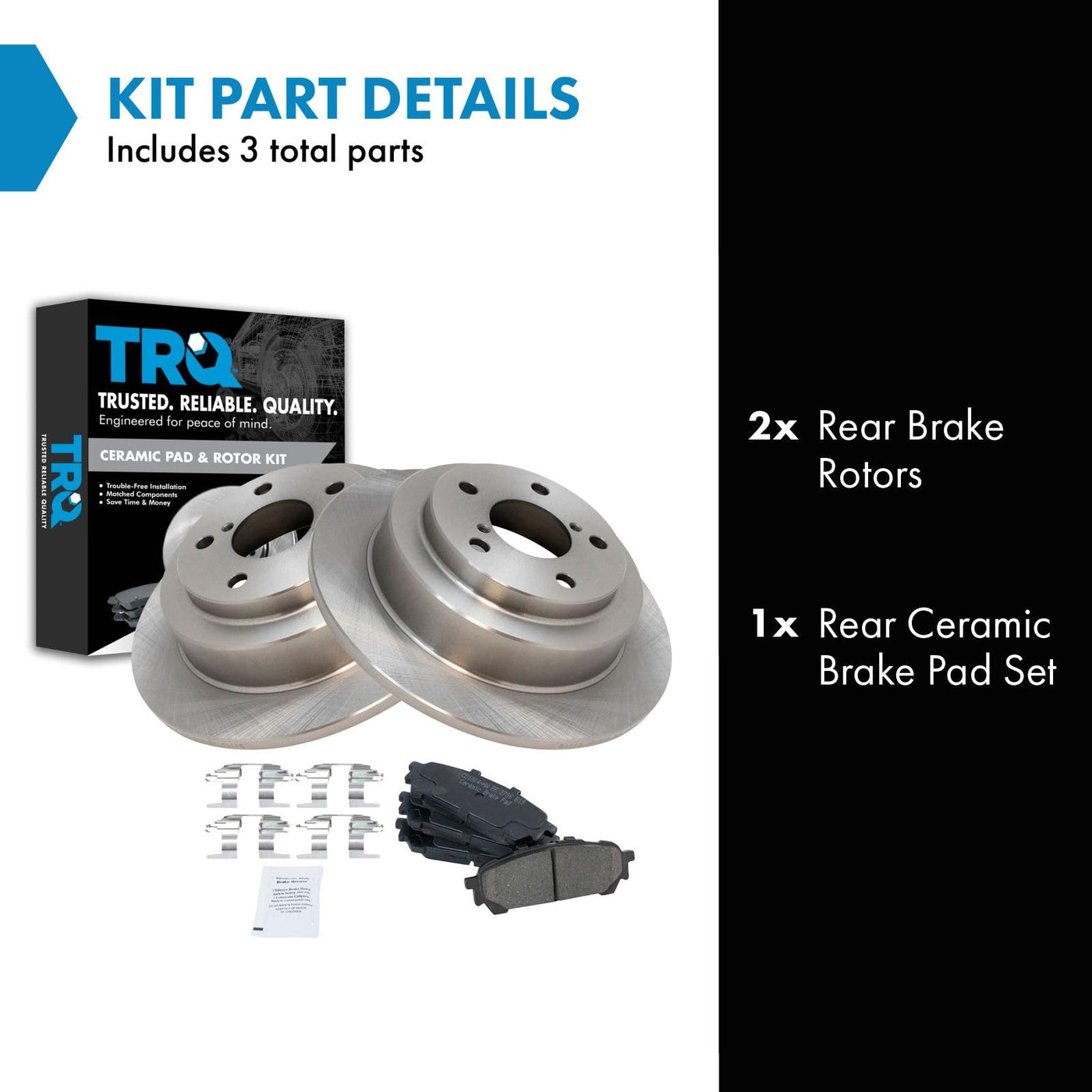 Ceramic Brake Pad & Rotor KitKit Includes(1) Rear Ceramic Brake Pad Set(2) Rear Brake RotorsFitmentCompatible with: 2004-08 Subaru Forester RearCompatible with: 2005-07 Subaru Impreza Outback Sport H4 2.5L RearCompatible with: 2006-07 Subaru Impreza 2.5i H4 2.5L RearCompatible with: 2004-05 Subaru Impreza WRX H4 2.0L RearCompatible with: 2004-05 Subaru Impreza RS H4 2.5L RearCompatible with: 2004 Subaru Impreza Outback H4 2.5L RearCompatible with: 2004 Subaru Impreza TS H4 2.5L RearCompatible with: 2005-06 Saab 9-2X RearProduct AttributesRear Brake Rotor Diameter: 10.47 in. (266mm)Wheel Lug Count: 5 LugBrake Pad Friction Material: CeramicBrake Pad Bonding Type: Premium PosiRear Brake Rotor Venting Type: SolidProduct Features Positive Molded - Less dust resulting in clean wheels G3000 Casting Alloy - Reduced noise and improved wear resistance Application Specific Design - Extended service life, no modificationsItem DetailsTRQ brake kits are designed to restore your brake system to like-new performance. TRQ brake pads are positive molded, thermal scorched, chamfered, and utilize a multi-layer shim for enhanced performance and service life. TRQ rotors have a non-directional finish that reduces the break-in period for new rotors as well as reducing vibrations throughout the rotors lifecycle. All products are fit and road-tested in our Massachusetts R&D facility to ensure we deliver on our promise of Trusted Reliable Quality.Reference NumbersAimco: 31043Bendix: PRT1474DuraGo: BR31043Raybestos Brakes: 96121, 96121FZN, 96121FZNFZN, 96121FZNP, 96121FZNR, 96121P, 96121R, EHT1004H, MGD1004CH, SGD1004CSaab: 32006220Subaru: 26696FE040, 26696FE050Wagner: BD125046, BD126494