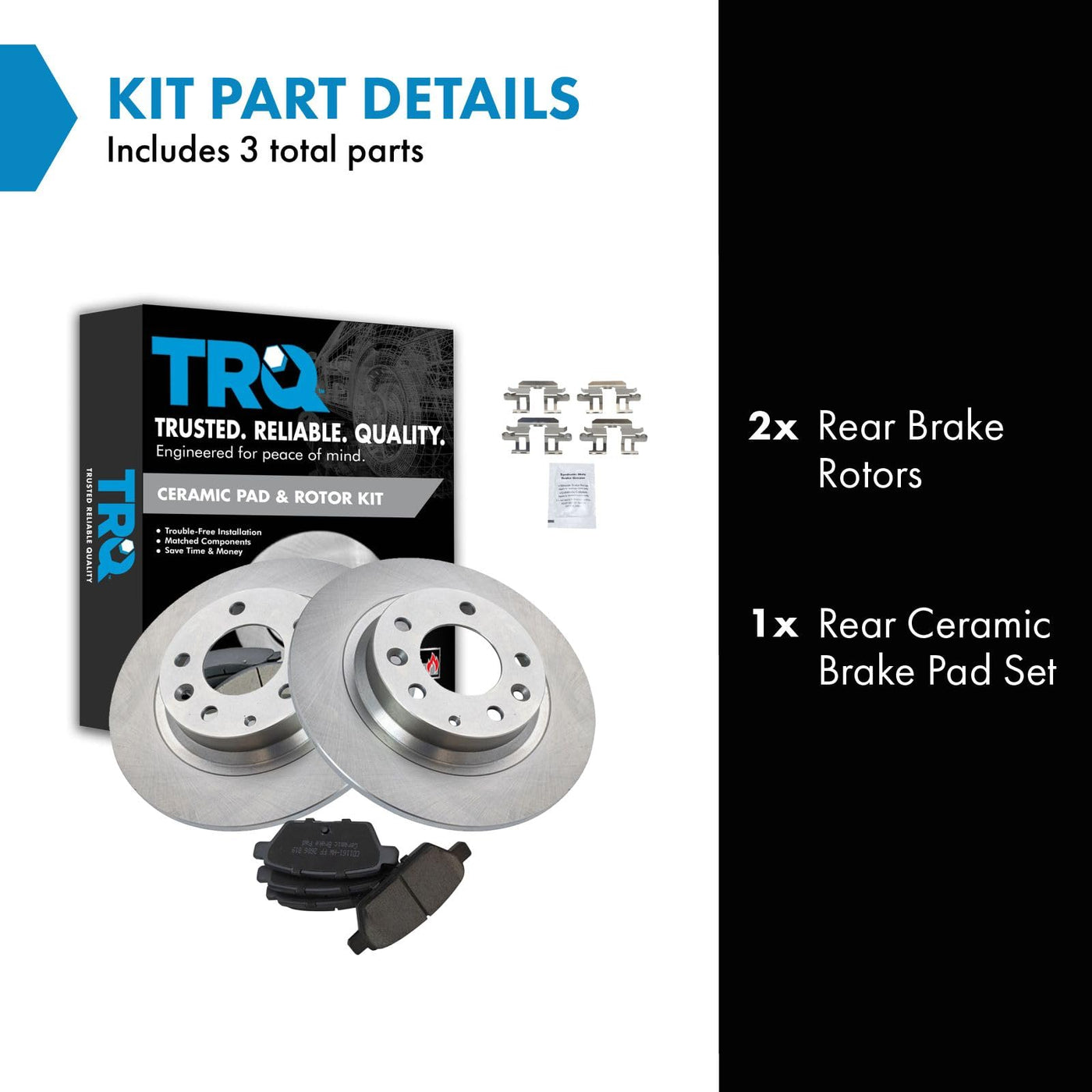 Ceramic Brake Pad & Rotor KitKit Includes(1) Rear Ceramic Brake Pad Set(2) Rear Brake RotorsFitmentCompatible with: 2006-12 Ford Fusion RearCompatible with: 2006-13 Mazda 6 RearCompatible with: 2007-12 Lincoln MKZ RearCompatible with: 2006-11 Mercury Milan RearCompatible with: 2006 Lincoln Zephyr RearProduct AttributesBrake Pad Friction Material: CeramicBrake Pad Bonding Type: Premium PosiProduct Features Positive Molded - Less dust resulting in clean wheels G3000 Casting Alloy - Reduced noise and improved wear resistance Application Specific Design - Extended service life, no modificationsItem DetailsTRQ brake kits are designed to restore your brake system to like-new performance. TRQ brake pads are positive molded, thermal scorched, chamfered, and utilize a multi-layer shim for enhanced performance and service life. TRQ rotors have a non-directional finish that reduces the break-in period for new rotors as well as reducing vibrations throughout the rotors lifecycle. All products are fit and road-tested in our Massachusetts R&D facility to ensure we deliver on our promise of Trusted Reliable Quality.Reference NumbersAimco: 31325Bendix: PRT5499, PRT5806DuraGo: BR31325Ford: 6E5Z2200B, 6E5Z2200C, 9E5Z2200A, BE5Z2200ALincoln: 6E5Z2200B, 6E5Z2200C, 9E5Z2200A, BE5Z2200AMazda: GER12648Z, GPYA2643ZC, GPYA2648ZC, GPYA2648ZD, GPYB2643ZMercury: 6E5Z2200B, 6E5Z2200C, 9E5Z2200ARaybestos Brakes: 680958, 680958FZN, 680958P, 680958R, 980172, 980172FZN, 980172P, 980172R, EHT1161H, MGD1161CH, SGD1161CWagner: BD126545, BD180397