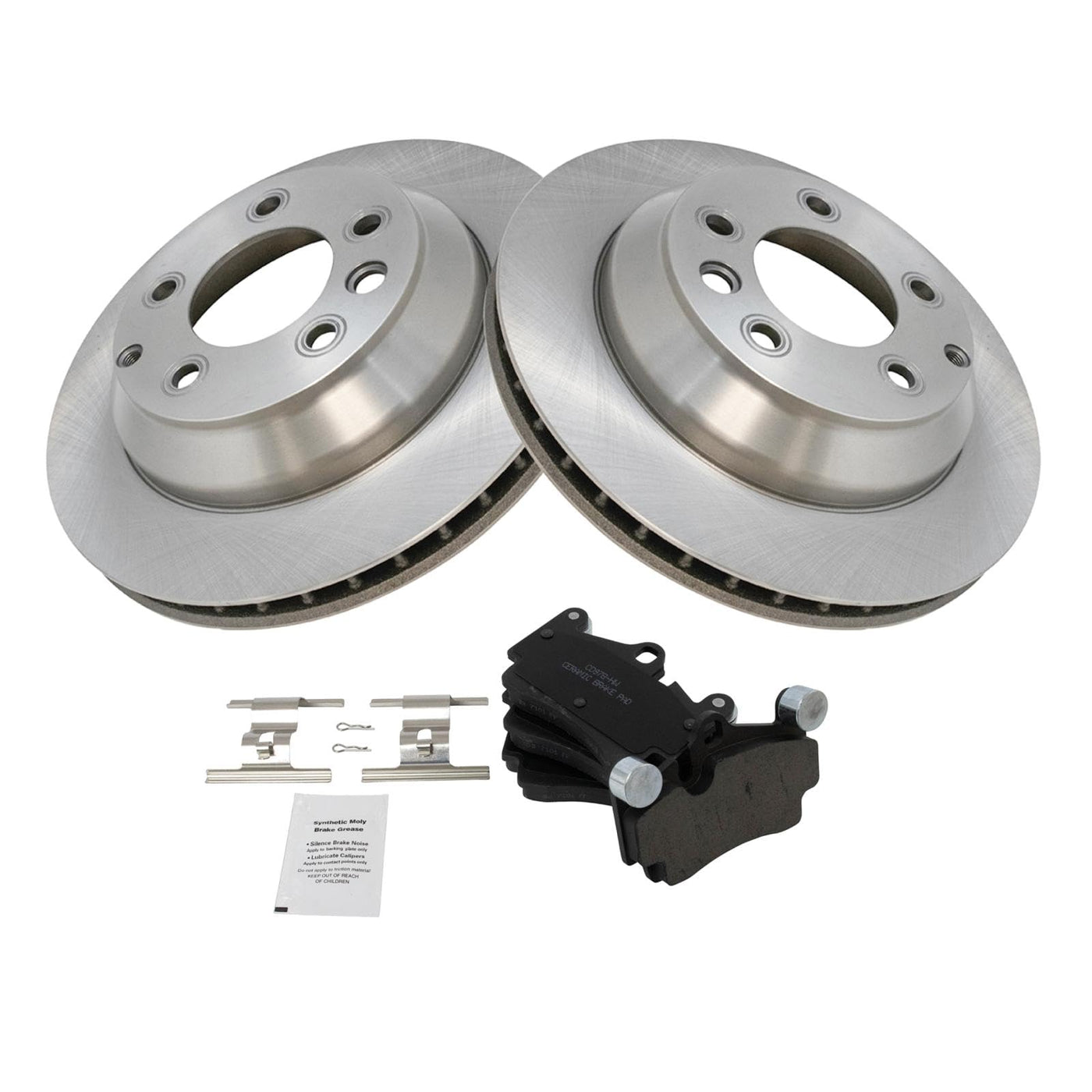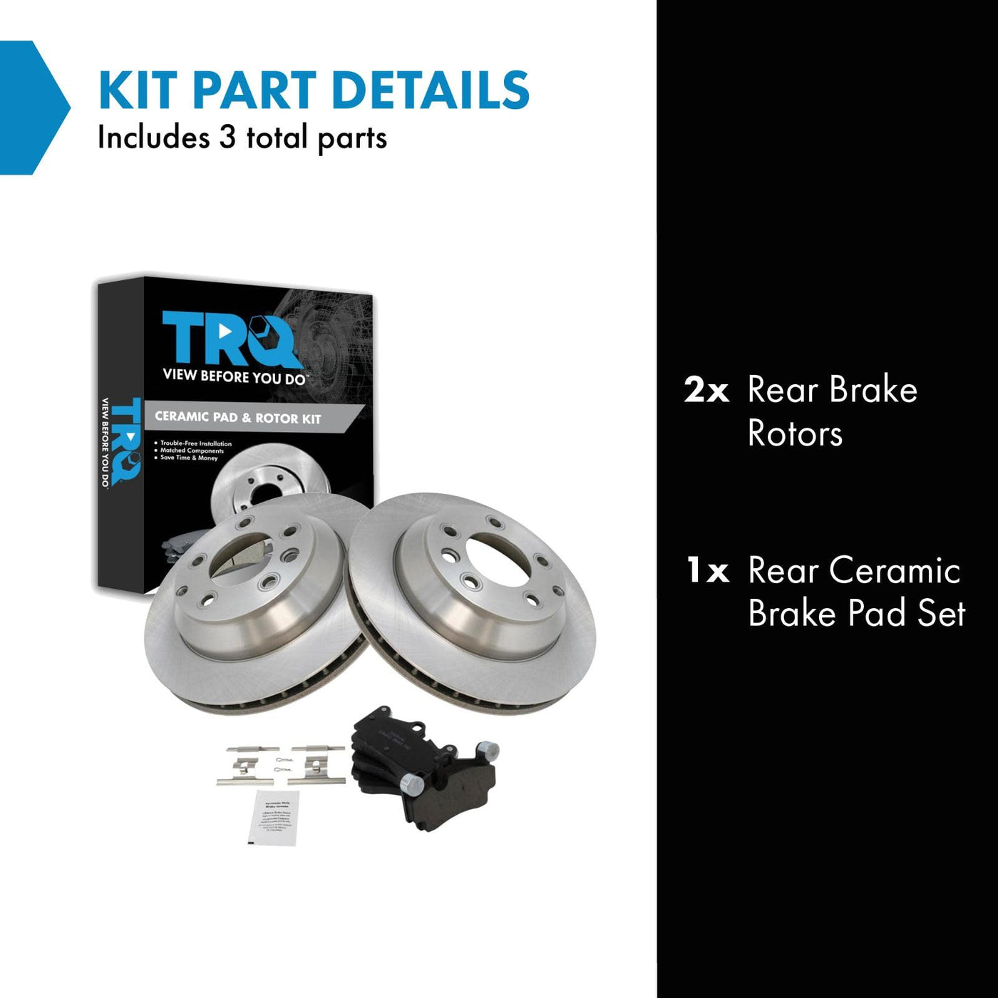 Ceramic Brake Pad & Rotor KitKit Includes(1) Rear Ceramic Brake Pad Set(2) Rear Brake RotorsFitmentCompatible with: 2007-15 Audi Q7 RearCompatible with: 2003-06 Porsche Cayenne Rear with 12.99 in. 330mm Diameter Rear RotorsCompatible with: 2008-10 Porsche Cayenne GTS Rear with 12.99 in. 330mm Diameter Rear RotorsCompatible with: 2008-10 Porsche Cayenne Base Model Rear with 12.99 in. 330mm Diameter Rear RotorsCompatible with: 2008-10 Porsche Cayenne S Rear with 12.99 in. 330mm Diameter Rear RotorsCompatible with: 2006-09 VW Touareg Rear with 4 Piston Rear CalipersCompatible with: 2004-05 VW Touareg RearCompatible with: 2010 Porsche Cayenne S Transsyberia Rear with 12.99 in. 330mm Diameter Rear RotorsCompatible with: 2010 VW Touareg Rear with Dual Piston Rear CalipersProduct AttributesBrake Pad Friction Material: CeramicBrake Pad Bonding Type: Premium PosiProduct Features Positive Molded - Less dust resulting in clean wheels G3000 Casting Alloy - Reduced noise and improved wear resistance Application Specific Design - Extended service life, no modificationsItem DetailsTRQ brake kits are designed to restore your brake system to like-new performance. TRQ brake pads are positive molded, thermal scorched, chamfered, and utilize a multi-layer shim for enhanced performance and service life. TRQ rotors have a non-directional finish that reduces the break-in period for new rotors as well as reducing vibrations throughout the rotors lifecycle. All products are fit and road-tested in our Massachusetts R&D facility to ensure we deliver on our promise of Trusted Reliable Quality.Reference NumbersAimco: 34287Audi: 7L0698451B, 7L0698451G, 7L0698451HBendix: PRT5758DuraGo: BR900478Hollander: 533-50152, 533-58692Porsche: 95535293901, 95535293902, 95535293903Raybestos Brakes: 980230, 980230FZN, 980230P, 980230PER, 980230R, PGD978MVolkswagen: 7L0698451A, 7L0698451B, 7L6698451DWagner: BD126340
