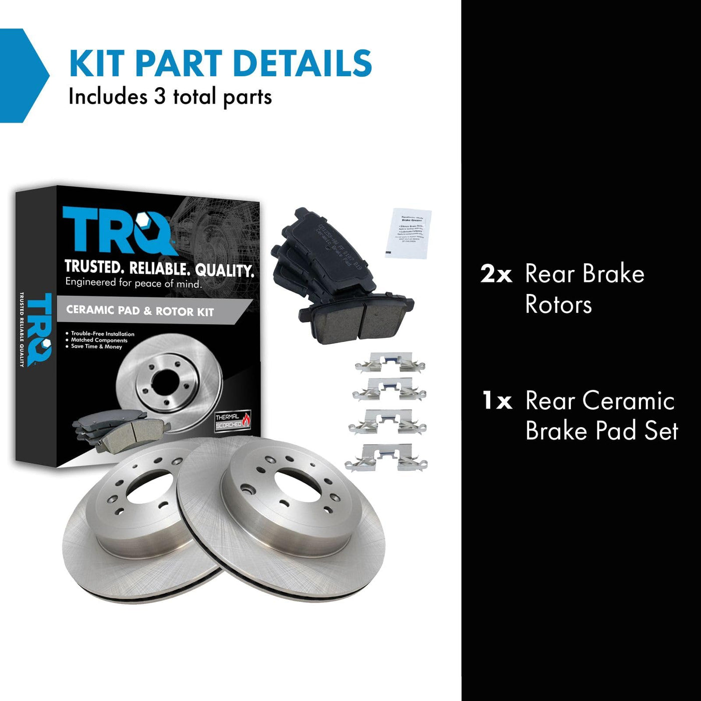 Ceramic Brake Pad & Rotor KitKit Includes(1) Rear Ceramic Brake Pad Set(2) Rear Brake RotorsFitmentCompatible with: 2007-15 Mazda CX-9 RearProduct AttributesRear Brake Rotor Diameter: 12.76 in. (324mm)Wheel Lug Count: 5 LugBrake Pad Friction Material: CeramicBrake Pad Bonding Type: Premium PosiRear Brake Rotor Venting Type: VentedProduct Features Positive Molded - Less dust resulting in clean wheels G3000 Casting Alloy - Reduced noise and improved wear resistance Application Specific Design - Extended service life, no modificationsItem DetailsTRQ brake kits are designed to restore your brake system to like-new performance. TRQ brake pads are positive molded, thermal scorched, chamfered, and utilize a multi-layer shim for enhanced performance and service life. TRQ rotors have a non-directional finish that reduces the break-in period for new rotors as well as reducing vibrations throughout the rotors lifecycle. All products are fit and road-tested in our Massachusetts R&D facility to ensure we deliver on our promise of Trusted Reliable Quality.Reference NumbersAimco: 31480Bendix: PRT5782DuraGo: BR900356Ford: 7T4Z2200A, 8T4Z2200AHollander: 533-50185Lincoln: 7T4Z2200A, 8T4Z2200AMazda: L2Y62643Z, L2Y72643Z, L2Y72648Z, L2Y82643ZA, L2Y82643ZBRaybestos Brakes: 980579, 980579FZN, 980579P, 980579R, EHT1259H, MGD1259CH, SGD1259CWagner: BD126498