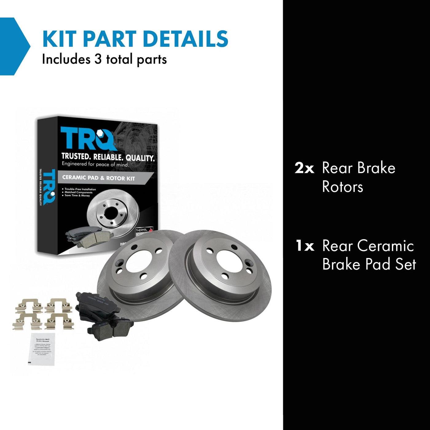 Ceramic Brake Pad & Rotor KitKit Includes(1) Rear Ceramic Brake Pad Set(2) Rear Brake RotorsFitmentCompatible with: 2009-15 Mini Cooper Base Model RearCompatible with: 2008-15 Mini Cooper Clubman RearCompatible with: 2012-15 Mini Cooper Coupe RearCompatible with: 2012-15 Mini Cooper Roadster RearProduct AttributesRear Brake Rotor Diameter: 10.20 in. (259mm)Wheel Lug Count: 4 LugBrake Pad Friction Material: CeramicBrake Pad Bonding Type: Premium PosiRear Brake Rotor Venting Type: SolidProduct Features Positive Molded - Less dust resulting in clean wheels G3000 Casting Alloy - Reduced noise and improved wear resistance Application Specific Design - Extended service life, no modificationsItem DetailsTRQ brake kits are designed to restore your brake system to like-new performance. TRQ brake pads are positive molded, thermal scorched, chamfered, and utilize a multi-layer shim for enhanced performance and service life. TRQ rotors have a non-directional finish that reduces the break-in period for new rotors as well as reducing vibrations throughout the rotors lifecycle. All products are fit and road-tested in our Massachusetts R&D facility to ensure we deliver on our promise of Trusted Reliable Quality.Reference NumbersAimco: 34366Bendix: PRT5964, PRT6164DuraGo: BR900672Mini: 34216778327, 34216794059Raybestos Brakes: 980604, 980604FZN, 980604P, 980604R, EHT1309HWagner: BD180011