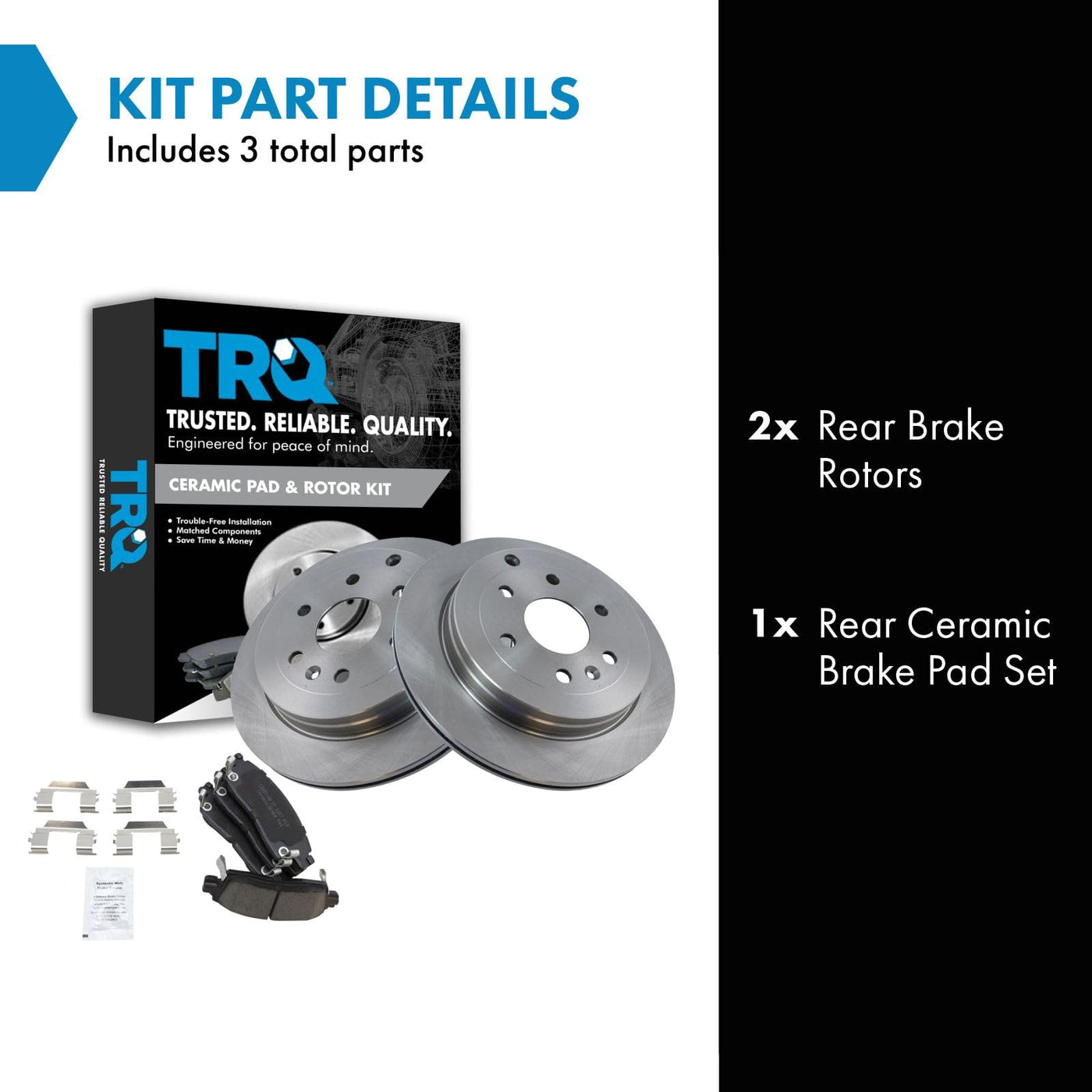 Ceramic Brake Pad & Rotor KitKit Includes(1) Rear Ceramic Brake Pad Set(2) Rear Brake RotorsFitmentCompatible with: 2009-17 Chevrolet Traverse RearCompatible with: 2007-16 GMC Acadia RearCompatible with: 2008-17 Buick Enclave RearCompatible with: 2007-10 Saturn Outlook RearCompatible with: 2017 GMC Acadia Limited RearProduct AttributesRear Brake Rotor Diameter: 13.03 in. (331mm)Wheel Lug Count: 6 LugBrake Pad Friction Material: CeramicBrake Pad Bonding Type: Premium PosiRear Brake Rotor Venting Type: VentedProduct Features Positive Molded - Less dust resulting in clean wheels G3000 Casting Alloy - Reduced noise and improved wear resistance Application Specific Design - Extended service life, no modificationsItem DetailsTRQ brake kits are designed to restore your brake system to like-new performance. TRQ brake pads are positive molded, thermal scorched, chamfered, and utilize a multi-layer shim for enhanced performance and service life. TRQ rotors have a non-directional finish that reduces the break-in period for new rotors as well as reducing vibrations throughout the rotors lifecycle. All products are fit and road-tested in our Massachusetts R&D facility to ensure we deliver on our promise of Trusted Reliable Quality.Reference NumbersAimco: 55151Bendix: PRT5749Buick: 15855898, 19149111, 22866196, 88983915, 88983916Cadillac: 22892950Chevrolet: 15855898, 19149111, 22866196, 88935752, 88935809, 88983915, 88983916DuraGo: BR900378GMC: 15855898, 19149111, 22866196, 88935752, 88935809, 88983915, 88983916Hollander: 533-00117Isuzu: 8191491110, 8889839150Oldsmobile: 88935752, 88983916Raybestos Brakes: 580569, 580569FZN, 580569P, 580569PER, 580569R, EHT883H, MGD883CH, SGD883CSaab: 19149111, 88983915, 89027184Saturn: 15855898Wagner: BD126503