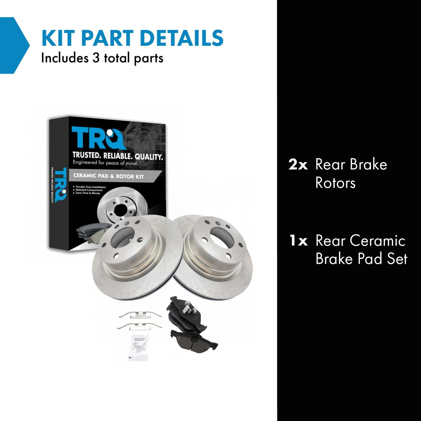 Ceramic Brake Pad & Rotor KitKit Includes(1) Rear Ceramic Brake Pad Set(2) Rear Brake RotorsFitmentCompatible with: 2011 BMW 128i RearCompatible with: 2013 BMW 128i RearCompatible with: 2009 BMW 128i RearCompatible with: 2012 BMW 128i RearCompatible with: 2010 BMW 128i RearProduct AttributesBrake Pad Friction Material: CeramicProduct Features Positive Molded - Less dust resulting in clean wheels G3000 Casting Alloy - Reduced noise and improved wear resistance Application Specific Design - Extended service life, no modificationsItem DetailsTRQ brake kits are designed to restore your brake system to like-new performance. TRQ brake pads are positive molded, thermal scorched, chamfered, and utilize a multi-layer shim for enhanced performance and service life. TRQ rotors have a non-directional finish that reduces the break-in period for new rotors as well as reducing vibrations throughout the rotors lifecycle. All products are fit and road-tested in our Massachusetts R&D facility to ensure we deliver on our promise of Trusted Reliable Quality.Reference NumbersAimco: 34401BMW: 34216774692, 34216790761Dura Corp: BR900776Raybestos Brakes: 980692, 980692FZN, 980692P, 980692R