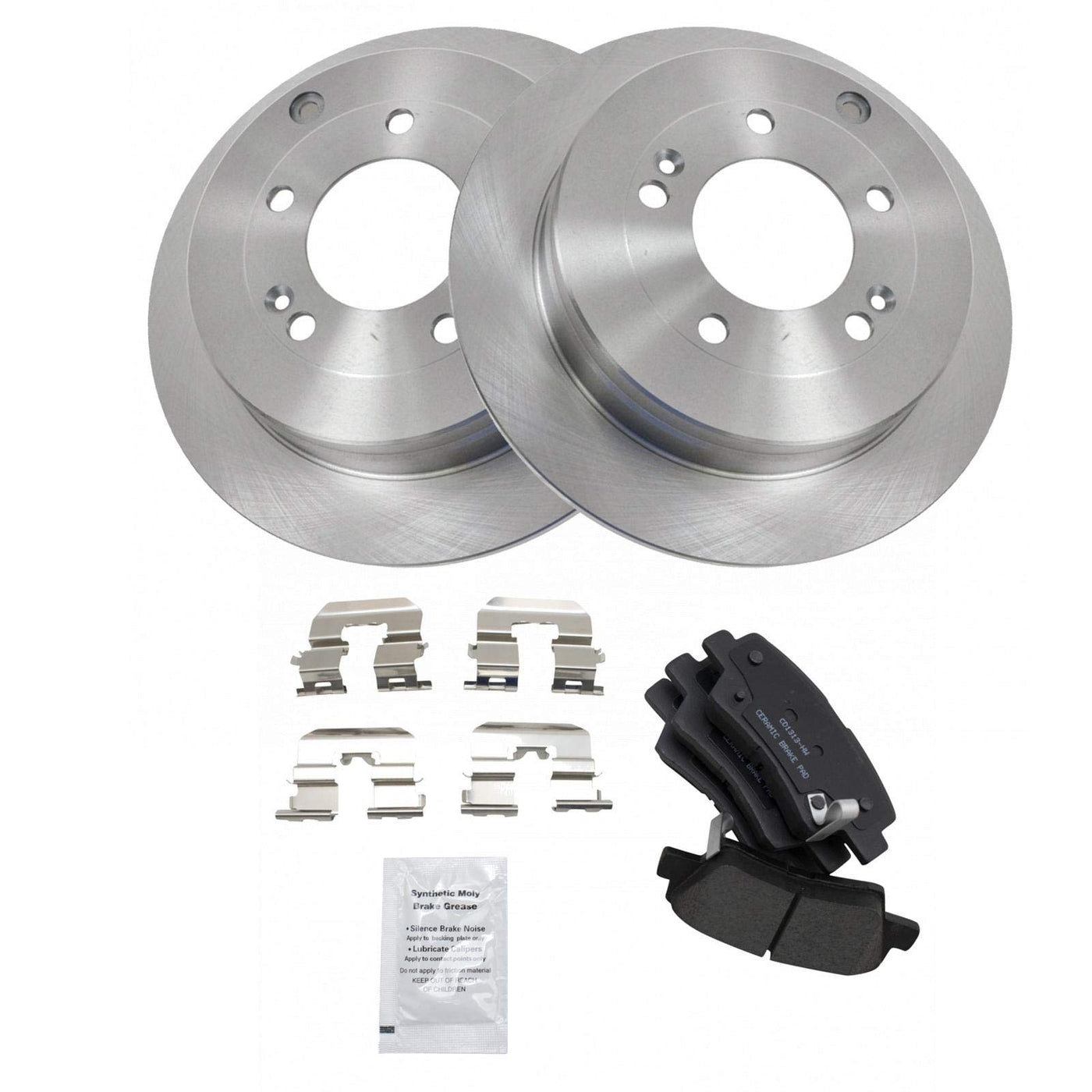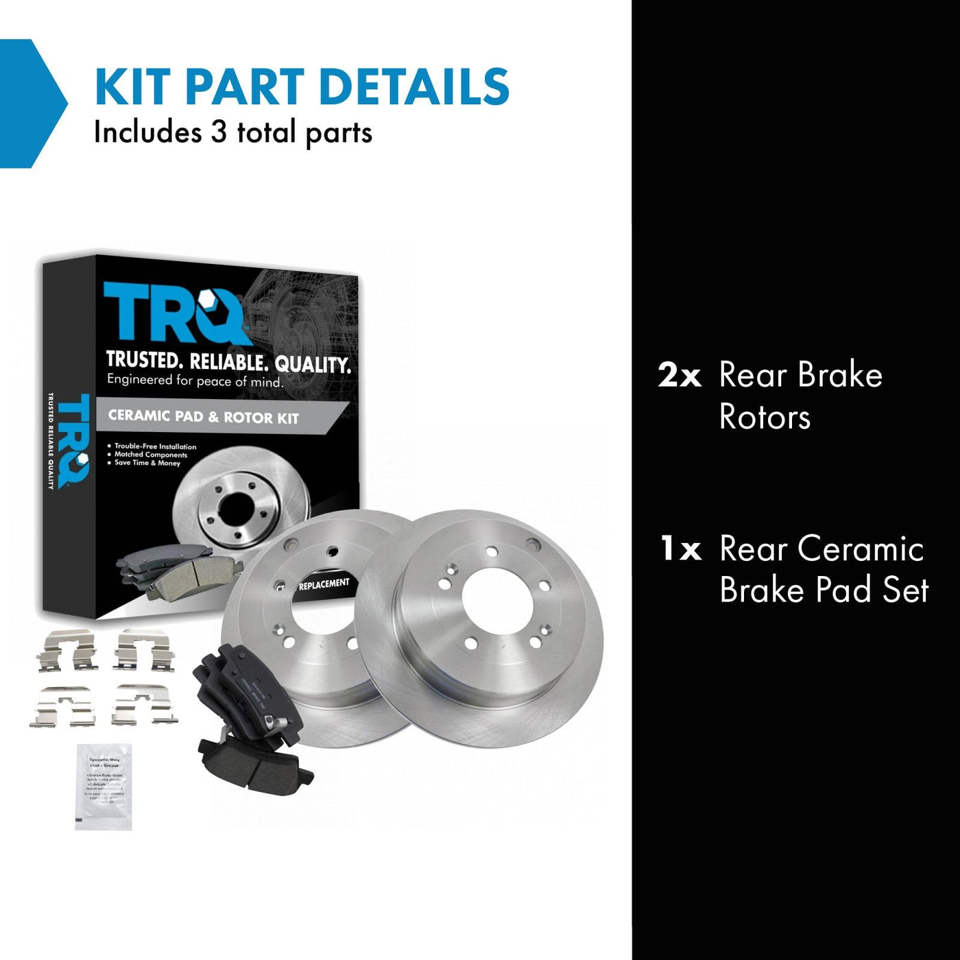 Ceramic Brake Pad & Rotor KitKit Includes(1) Rear Ceramic Brake Pad Set(2) Rear Brake RotorsFitmentCompatible with: 2007-09 Kia Amanti RearCompatible with: 2010 Hyundai Azera To 7/06/09 Production Date RearProduct AttributesRear Brake Rotor Diameter: 11.18 in. (284mm)Wheel Lug Count: 5 LugBrake Pad Friction Material: CeramicRear Brake Rotor Venting Type: SolidProduct Features Positive Molded - Less dust resulting in clean wheels G3000 Casting Alloy - Reduced noise and improved wear resistance Application Specific Design - Extended service life, no modificationsItem DetailsTRQ brake kits are designed to restore your brake system to like-new performance. TRQ brake pads are positive molded, thermal scorched, chamfered, and utilize a multi-layer shim for enhanced performance and service life. TRQ rotors have a non-directional finish that reduces the break-in period for new rotors as well as reducing vibrations throughout the rotors lifecycle. All products are fit and road-tested in our Massachusetts R&D facility to ensure we deliver on our promise of Trusted Reliable Quality.Reference NumbersAimco: 31421Bendix: PRT5852DuraGo: BR900398Hollander: 533-50110Kia: 583023FA01Raybestos Brakes: 980417, 980417FZN, 980417P, 980417R, EHT1313H, MGD1313CH, SGD1313CWagner: BD126460