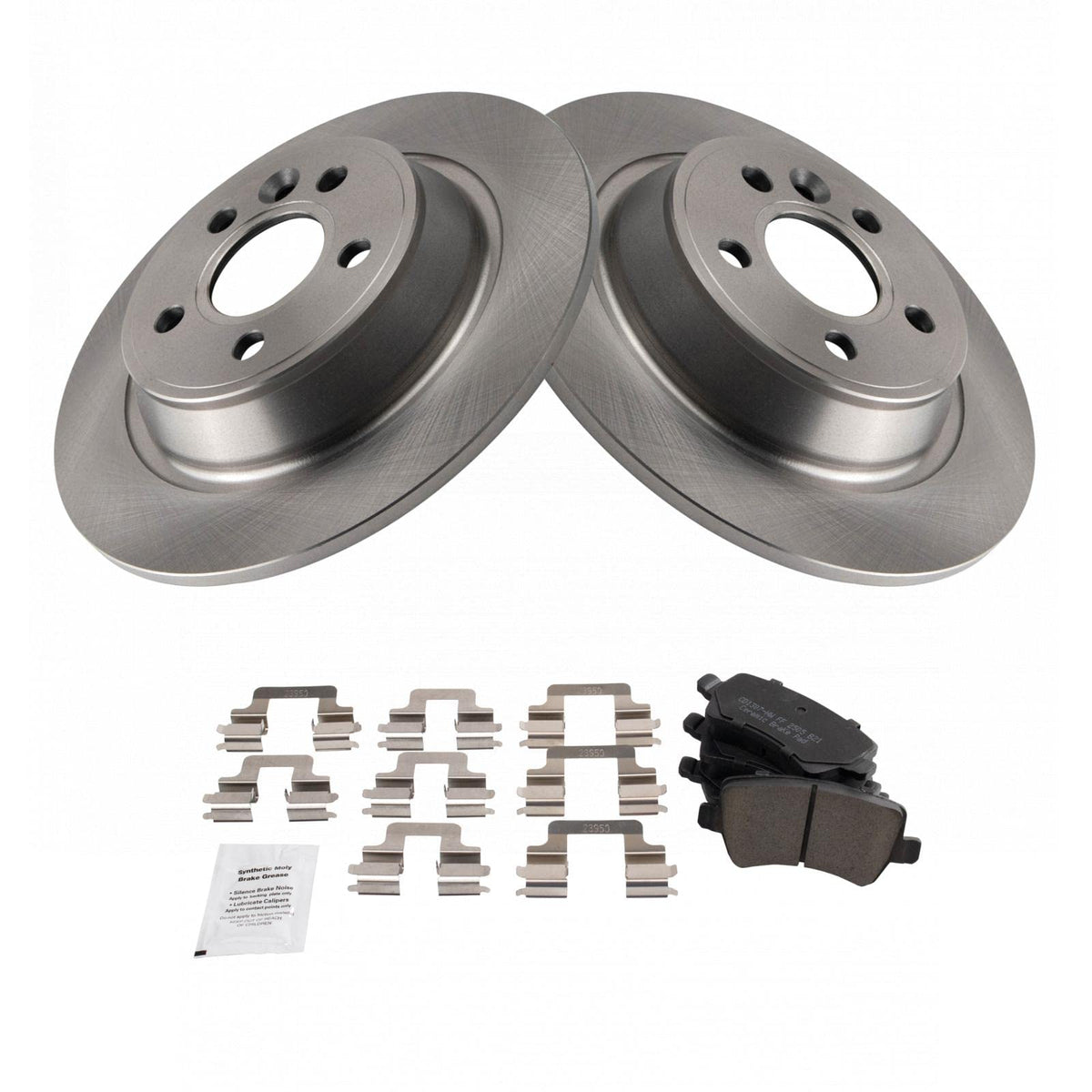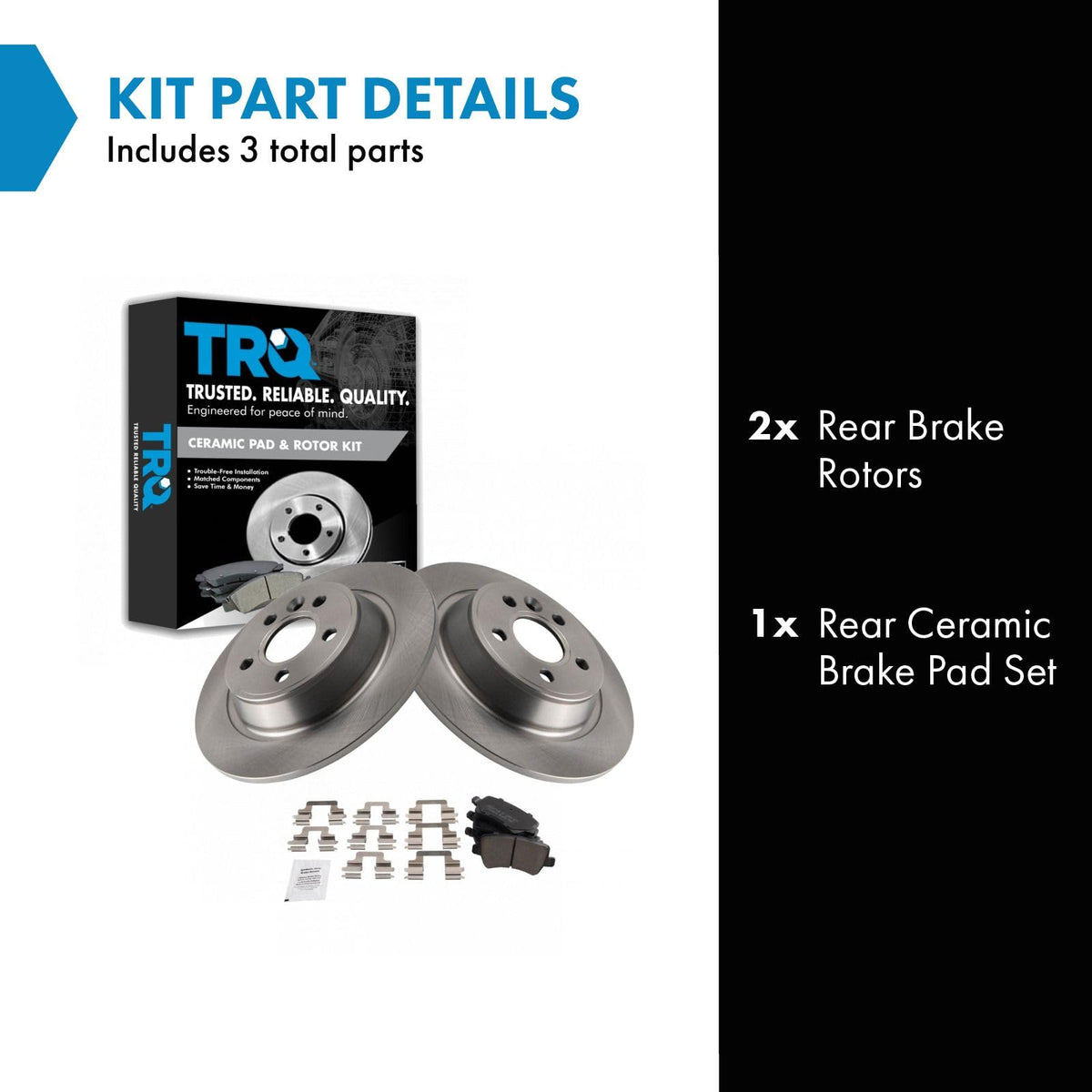 Ceramic Brake Pad & Rotor KitKit Includes(1) Rear Ceramic Brake Pad Set(2) Rear Brake RotorsFitmentCompatible with: 2012-15 Land Rover Range Rover Evoque Rear Driver & Passenger SideProduct AttributesBrake Pad Friction Material: CeramicProduct Features Positive Molded - Less dust resulting in clean wheels G3000 Casting Alloy - Reduced noise and improved wear resistance Application Specific Design - Extended service life, no modificationsItem DetailsTRQ brake kits are designed to restore your brake system to like-new performance. TRQ brake pads are positive molded, thermal scorched, chamfered, and utilize a multi-layer shim for enhanced performance and service life. TRQ rotors have a non-directional finish that reduces the break-in period for new rotors as well as reducing vibrations throughout the rotors lifecycle. All products are fit and road-tested in our Massachusetts R&D facility to ensure we deliver on our promise of Trusted Reliable Quality.Reference NumbersDuraGo: BR901436Ford: 1379931, 1385590, 1405500, 1864280, 1892357, 7G912A315BALand Rover: LR027123Raybestos Brakes: 980956, 980956FZN, 980956P, 980956R
