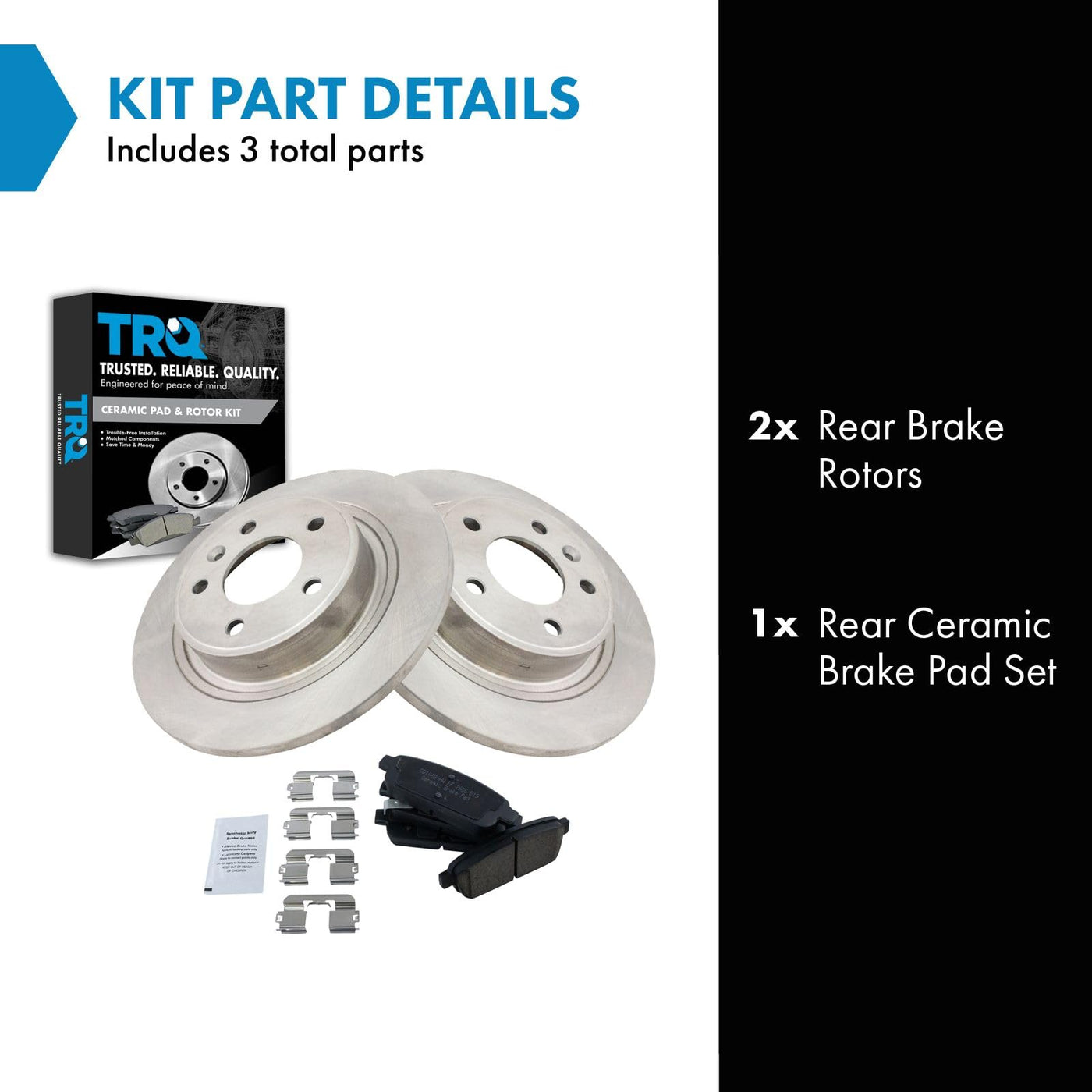 Ceramic Brake Pad & Rotor KitKit Includes(1) Rear Ceramic Brake Pad Set(2) Rear Brake RotorsFitmentCompatible with: 2013-15 Chevrolet Cruze with 11.5 in. 292mm Diameter Rear Rotors RearCompatible with: 2012-17 Buick Verano RearCompatible with: 2011-15 Chevrolet Volt RearCompatible with: 2016-19 Buick Cascada RearCompatible with: 2014-15 Cadillac ELR RearProduct AttributesRear Brake Rotor Diameter: 11.50 in. (292mm)Wheel Lug Count: 5 LugBrake Pad Friction Material: CeramicBrake Pad Bonding Type: Premium PosiRear Brake Rotor Venting Type: SolidProduct Features Positive Molded - Less dust resulting in clean wheels G3000 Casting Alloy - Reduced noise and improved wear resistance Application Specific Design - Extended service life, no modificationsItem DetailsTRQ brake kits are designed to restore your brake system to like-new performance. TRQ brake pads are positive molded, thermal scorched, chamfered, and utilize a multi-layer shim for enhanced performance and service life. TRQ rotors have a non-directional finish that reduces the break-in period for new rotors as well as reducing vibrations throughout the rotors lifecycle. All products are fit and road-tested in our Massachusetts R&D facility to ensure we deliver on our promise of Trusted Reliable Quality.Reference NumbersAimco: 41273Bendix: PRT6097Buick: 13319293, 13404405, 13408579, 13411380Cadillac: 13319293, 13404405, 13417473Chevrolet: 13300868, 13319293, 13319294, 13404405, 13408579DuraGo: BR901034Raybestos Brakes: 580900, 580900FZN, 580900P, 580900R, 581044, 581044FZN, 581044P, 581044R, EHT1468H, MGD1468CH, SGD1468CWagner: BD180491