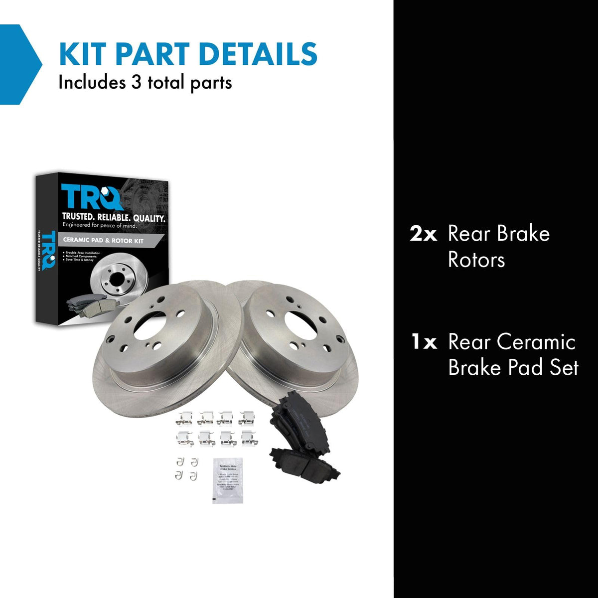 Ceramic Brake Pad & Rotor KitKit Includes(1) Rear Ceramic Brake Pad Set(2) Rear Brake RotorsFitmentCompatible with: 2012-17 Toyota Prius V RearCompatible with: 2016-18 Toyota Mirai RearCompatible with: 2019 Toyota Mirai To 11/30/18 Production Date RearProduct AttributesRear Brake Rotor Diameter: 11.42 in. (290mm)Wheel Lug Count: 5 LugBrake Pad Friction Material: CeramicBrake Pad Bonding Type: Premium PosiRear Brake Rotor Venting Type: SolidProduct Features Positive Molded - Less dust resulting in clean wheels G3000 Casting Alloy - Reduced noise and improved wear resistance Application Specific Design - Extended service life, no modificationsItem DetailsTRQ brake kits are designed to restore your brake system to like-new performance. TRQ brake pads are positive molded, thermal scorched, chamfered, and utilize a multi-layer shim for enhanced performance and service life. TRQ rotors have a non-directional finish that reduces the break-in period for new rotors as well as reducing vibrations throughout the rotors lifecycle. All products are fit and road-tested in our Massachusetts R&D facility to ensure we deliver on our promise of Trusted Reliable Quality.Reference NumbersAimco: 44754Autoxtra: AX901444Bendix: PRT6174BrakeBest: 981058, 981058FZN, 981058RDura Corp: BR900344-02, BR901444DuraGo: BR901444Lexus: 446630280, 446630300, 446630310, 446630311, 446630312, 446648130Newtek Automotive USA: R1444Raybestos Brakes: 980955, 980955FZN, 980955P, 980955R, 981058, 981058FZN, 981058P, 981058R, EHT1391AH, EHT1391H, MGD1391CHToyota: 4243147080, 446647050, 446647051, 446647071UAP: R44181Wagner Brake: BD180828E