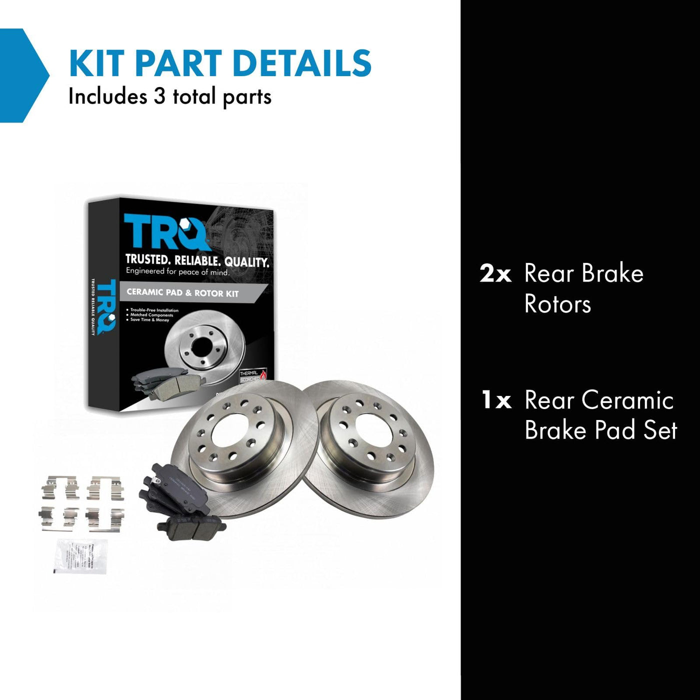 Ceramic Brake Pad & Rotor KitKit Includes(1) Rear Ceramic Brake Pad Set(2) Rear Brake RotorsFitmentCompatible with: 2018-22 Chevrolet Equinox RearCompatible with: 2016-21 Chevrolet Malibu Rear with Power Parking BrakeCompatible with: 2018-22 GMC Terrain RearCompatible with: 2017-19 Buick LaCrosse RearCompatible with: 2018-19 Buick Regal Sportback Base Model Rear with Brake Code J17 with Brake Code J60Compatible with: 2018-19 Buick Regal Sportback Essence Rear with Brake Code J17 with Brake Code J60Compatible with: 2018-19 Buick Regal Sportback Preferred II Rear with Brake Code J17 with Brake Code J60Compatible with: 2018-19 Buick Regal Sportback Preferred Rear with Brake Code J17 with Brake Code J60Compatible with: 2018-19 Buick Regal TourX Rear with Brake Code J17 with Brake Code J60Compatible with: 2019 Buick Regal Sportback Avenir Rear with Brake Code J17 with Brake Code J60Product AttributesRear Brake Rotor Diameter: 11.34 in. (288mm)Wheel Lug Count: 5 LugBrake Pad Friction Material: CeramicBrake Pad Bonding Type: Premium PosiRear Brake Rotor Venting Type: SolidProduct Features Positive Molded - Less dust resulting in clean wheels G3000 Casting Alloy - Reduced noise and improved wear resistance Application Specific Design - Extended service life, no modificationsItem DetailsTRQ brake kits are designed to restore your brake system to like-new performance. TRQ brake pads are positive molded, thermal scorched, chamfered, and utilize a multi-layer shim for enhanced performance and service life. TRQ rotors have a non-directional finish that reduces the break-in period for new rotors as well as reducing vibrations throughout the rotors lifecycle. All products are fit and road-tested in our Massachusetts R&D facility to ensure we deliver on our promise of Trusted Reliable Quality.Reference NumbersACDelco: 177-1179Advance Auto Parts: YH586423PAutoxtra: AX901620BrakeBest: 581999, 581999RCentric Parts: 120.62145, 121.62145, 320.62145Chevrolet: 13595651Dura Corp: BR90162002Durabrake: BR901620DuraGo: BR901620Dynamic Friction Company: 604-47075General Motors: 13513886, 13517854, 13517858, 13544245, 13583682Newtek Automotive USA: R1620PowerStop: AR82197, AR82197EVC, AR82197SCR, AR82197XPRPromax: 14-650017Raybestos Brakes: 581999, 581999FZN, 581999R, EHT1915HUAP: R62145Wagner Brake: BD180783E