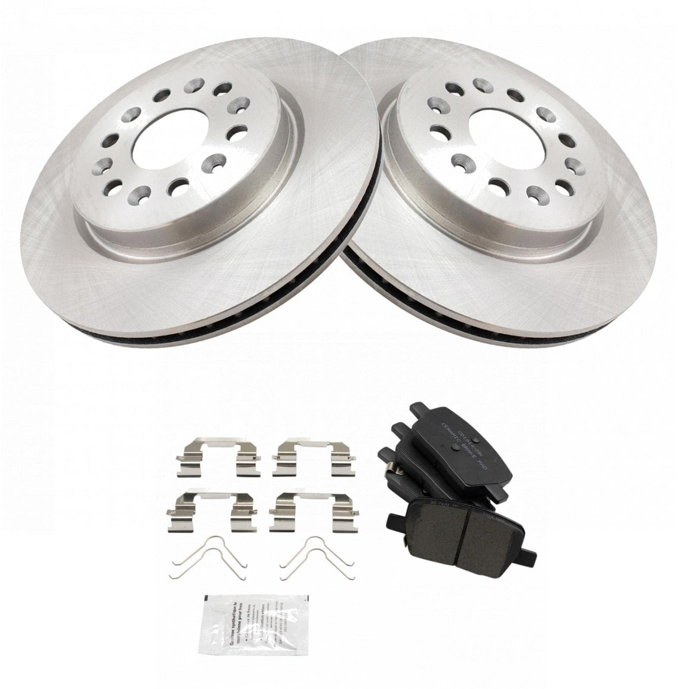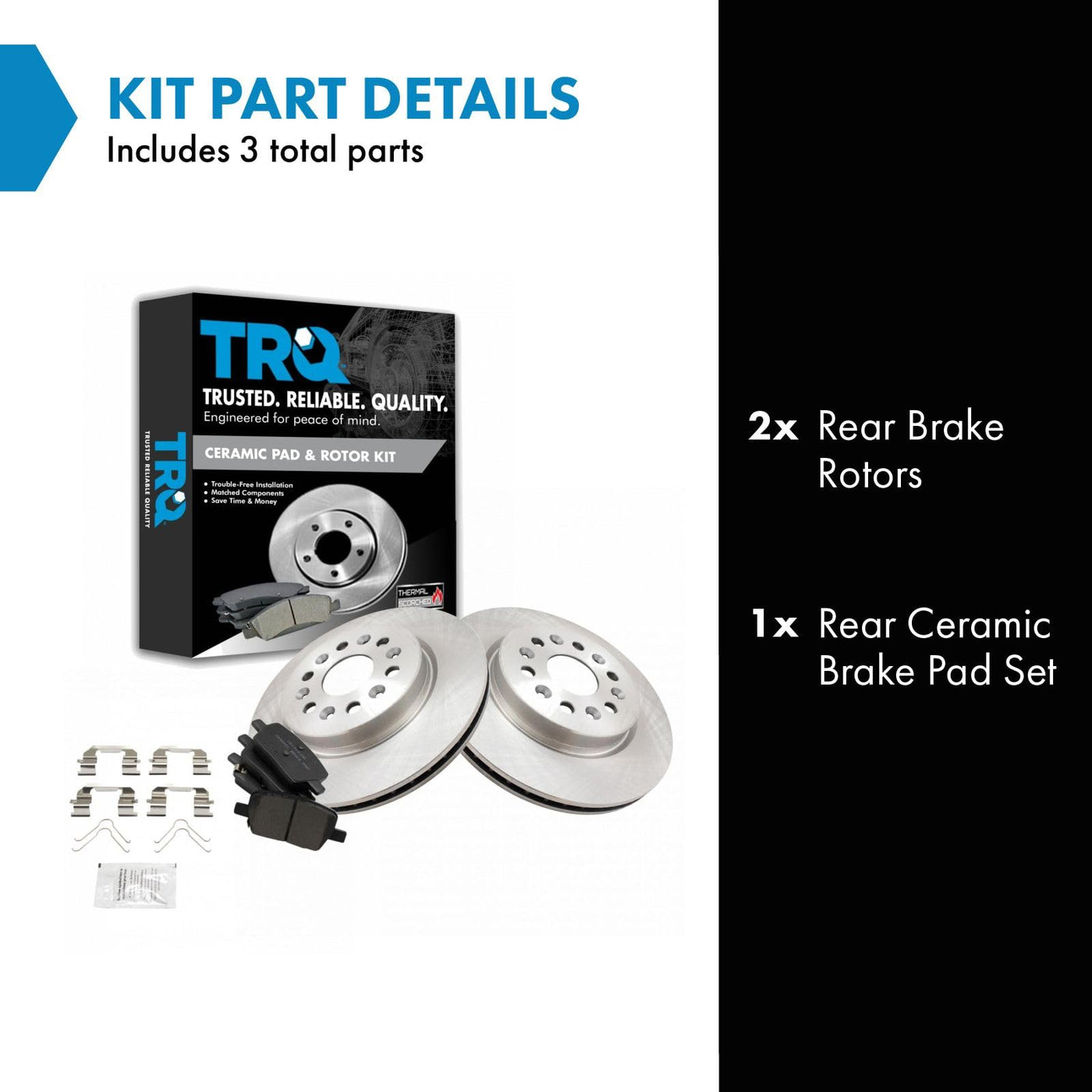 Ceramic Brake Pad & Rotor KitKit Includes(1) Rear Ceramic Brake Pad Set(2) Rear Brake RotorsFitmentCompatible with: 2018-21 Chevrolet Traverse RearCompatible with: 2017-21 GMC Acadia RearCompatible with: 2017-21 Cadillac XT5 RearCompatible with: 2019-21 Chevrolet Blazer RearCompatible with: 2018-21 Buick Enclave RearCompatible with: 2020-21 Cadillac XT6 RearProduct AttributesRear Brake Rotor Diameter: 12.40 in. (315mm)Wheel Lug Count: 6 LugBrake Pad Friction Material: CeramicBrake Pad Bonding Type: Premium PosiRear Brake Rotor Venting Type: VentedProduct Features Positive Molded - Less dust resulting in clean wheels G3000 Casting Alloy - Reduced noise and improved wear resistance Application Specific Design - Extended service life, no modificationsItem DetailsTRQ brake kits are designed to restore your brake system to like-new performance. TRQ brake pads are positive molded, thermal scorched, chamfered, and utilize a multi-layer shim for enhanced performance and service life. TRQ rotors have a non-directional finish that reduces the break-in period for new rotors as well as reducing vibrations throughout the rotors lifecycle. All products are fit and road-tested in our Massachusetts R&D facility to ensure we deliver on our promise of Trusted Reliable Quality.Reference NumbersAdvance Auto Parts: YH549465PAutoZone: 72077DG, 72077DLBrakeBest: 582060RGSCadillac: 23341199, 23341200Centric Parts: 120.62169, 121.62169, 126.62169SL, 126.62169SR, 127.62169L, 127.62169R, 128.62169L, 128.62169RDura Corp: BR901700Durabrake: BR901700Dynamic Friction Company: 600-48000General Motors: 13507408, 13514473, 13516726, 13592624PowerStop: AR82192EVCPromax: 14-650009Raybestos Brakes: 582060, 582060FZN, 582060P, 582060PER, 582060R, EHT1877H, EHT1914HUAP: R62169Wagner Brake: BD180684E