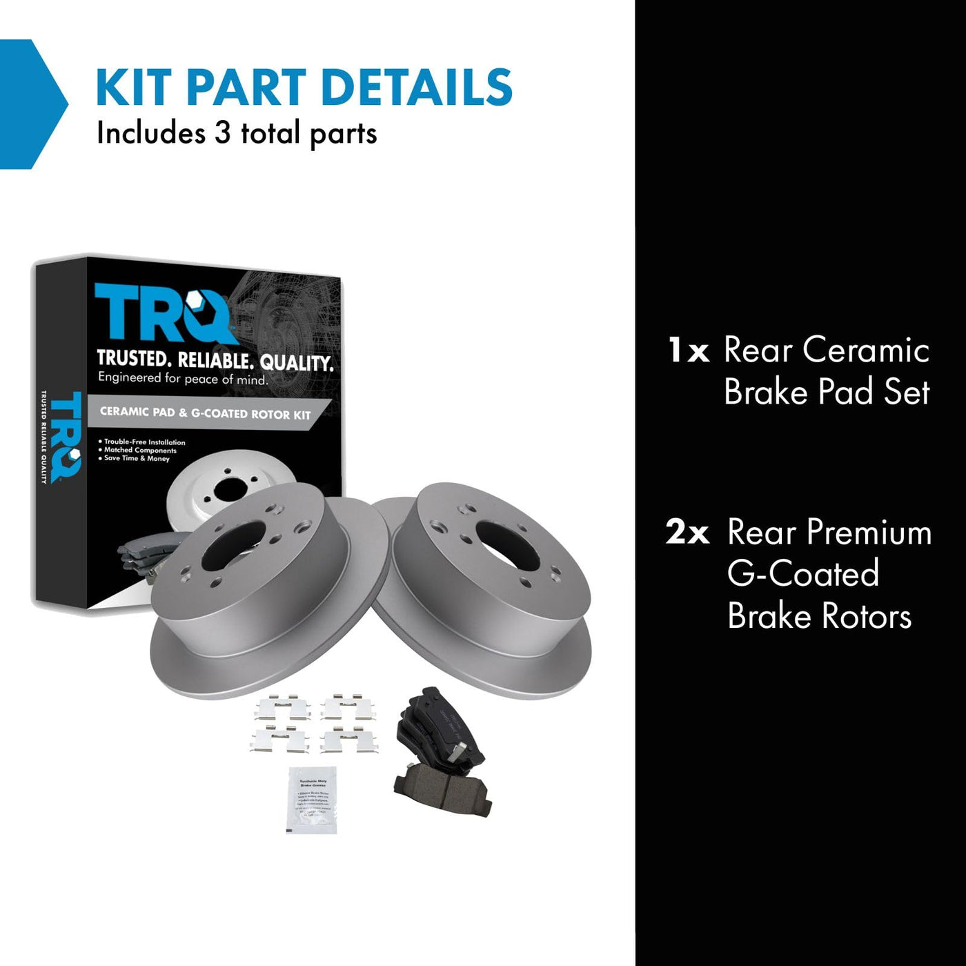 Ceramic Brake Pad & Rotor KitKit Includes(1) Rear Ceramic Brake Pad Set(2) Rear Premium G-Coated Brake RotorsFitmentCompatible with: 2001-06 Hyundai Santa Fe Rear Ceramic Premium G-Coated Brake Pad & Rotor KitCompatible with: 2005-10 Kia Sportage All Wheel Drive Rear Ceramic Premium G-Coated Brake Pad & Rotor KitCompatible with: 2005-09 Hyundai Tucson 4 Wheel Drive Rear Ceramic Premium G-Coated Brake Pad & Rotor KitProduct AttributesRear Brake Rotor Diameter: 11.18 in. (284mm)Wheel Lug Count: 5 LugBrake Pad Friction Material: CeramicBrake Rotor Coating: Premium G-CoatedBrake Pad Bonding Type: Premium PosiRear Brake Rotor Venting Type: SolidProduct Features Positive Molded: Less dust resulting in clean wheels Electrostatic Coated: Long-lasting rust protection G3000 Casting Alloy: Reduced noise and improved wear resistance Application Specific Design: Extended service life, no modificationsItem DetailsTRQ brake kits are designed to restore your brake system to like-new performance. TRQ brake pads are positive molded, thermal scorched, chamfered, and utilize a multi-layer shim for enhanced performance and service life. TRQ G-coated rotors have long-lasting rust prevention, perfect for wheels with large openings that expose the rotor and rotor hat during daily drives. All products are fit and road-tested in our Massachusetts R&D facility to ensure we deliver on our promise of Trusted Reliable Quality.Reference NumbersHyundai: 5830226A20, 583022EA00, 583022HA00, 5830238A10, 583023KA10, 583023KA50, 583023KA51, 583023KA60Kia: 583022EA00, 5830238A10, 583023FA00Raybestos Brakes: EHT813H, MGD813CH, SGD813C