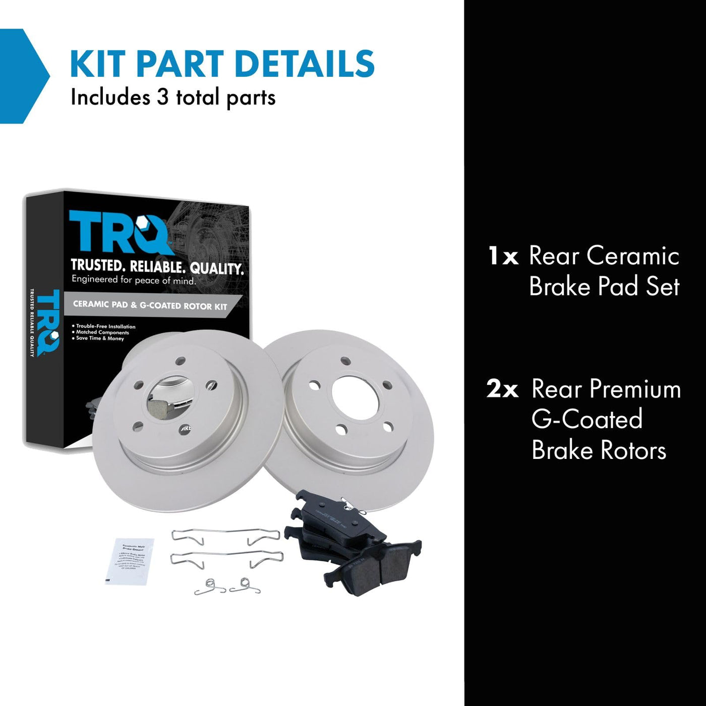 Ceramic Brake Pad & Rotor KitKit Includes(1) Rear Ceramic Brake Pad Set(2) Rear Premium G-Coated Brake RotorsFitmentCompatible with: 2012-15 Ford Focus Rear with Rear Disc Brakes Ceramic Premium G-Coated Brake Pad & Rotor KitCompatible with: 2016-18 Ford Focus Titanium Rear with Rear Disc Brakes Ceramic Premium G-Coated Brake Pad & Rotor KitCompatible with: 2016-18 Ford Focus SE Rear with Rear Disc Brakes Ceramic Premium G-Coated Brake Pad & Rotor KitCompatible with: 2016-18 Ford Focus Electric Rear with Rear Disc Brakes Ceramic Premium G-Coated Brake Pad & Rotor KitCompatible with: 2016-18 Ford Focus ST Rear with Rear Disc Brakes Ceramic Premium G-Coated Brake Pad & Rotor KitCompatible with: 2017-18 Ford Focus SEL Rear with Rear Disc Brakes Ceramic Premium G-Coated Brake Pad & Rotor KitProduct AttributesRear Brake Rotor Diameter: 10.67 in. (271mm)Wheel Lug Count: 5 LugBrake Pad Friction Material: CeramicBrake Rotor Coating: Premium G-CoatedRear Brake Rotor Venting Type: SolidProduct Features Positive Molded: Less dust resulting in clean wheels Electrostatic Coated: Long-lasting rust protection G3000 Casting Alloy: Reduced noise and improved wear resistance Application Specific Design: Extended service life, no modificationsItem DetailsTRQ brake kits are designed to restore your brake system to like-new performance. TRQ brake pads are positive molded, thermal scorched, chamfered, and utilize a multi-layer shim for enhanced performance and service life. TRQ G-coated rotors have long-lasting rust prevention, perfect for wheels with large openings that expose the rotor and rotor hat during daily drives. All products are fit and road-tested in our Massachusetts R&D facility to ensure we deliver on our promise of Trusted Reliable Quality.Reference NumbersAudi: 4B0698151AC, 4B0698151AD, 4B0698151R, 4F0698151A, 8E0698151CChevrolet: 15271565Ford: AV6Z2200AJaguar: C2C27271, C2D23143, C2P17595Mazda: B3YF3323Z, BPYK2648ZB, C2Y32648ZA, C2Y32648ZBPontiac: 15271565Raybestos Brakes: EHT1095H, MGD1095CHSaab: 93166942, 93183140, 93190338, 93195754Saturn: 15271565Volkswagen: 1K0698151BVolvo: 307420290, 30742031, 307420310, 31212184