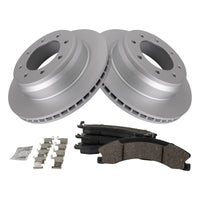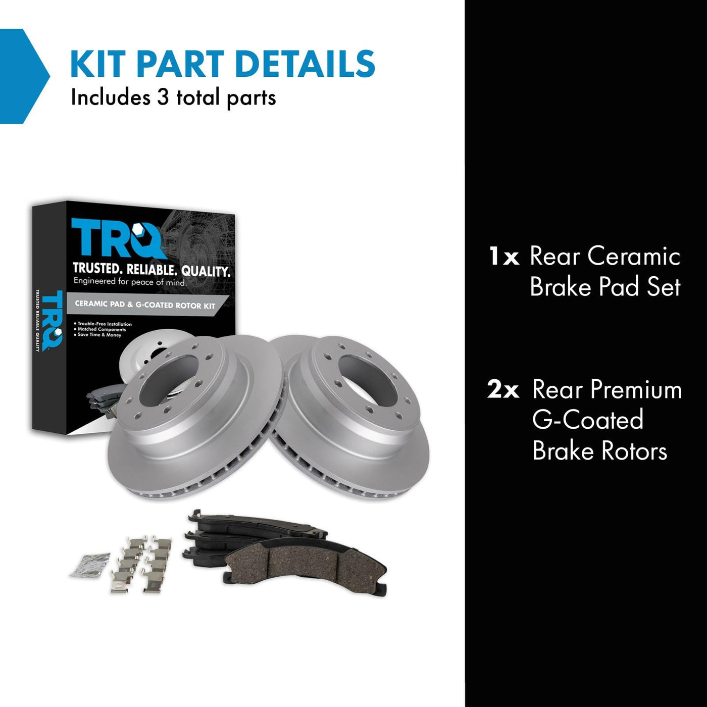 Ceramic Brake Pad & Rotor KitKit Includes(1) Rear Ceramic Brake Pad Set(2) Rear Premium G-Coated Brake RotorsFitmentCompatible with: 2012-19 Nissan NV 2500 Rear Ceramic Premium G-Coated Brake Pad & Rotor KitCompatible with: 2012-19 Nissan NV 3500 Rear Ceramic Premium G-Coated Brake Pad & Rotor KitCompatible with: 2012-19 Nissan NV 1500 Rear Ceramic Premium G-Coated Brake Pad & Rotor KitProduct AttributesRear Brake Rotor Diameter: 14.37 in. (365mm)Wheel Lug Count: 8 LugBrake Pad Friction Material: CeramicBrake Rotor Coating: Premium G-CoatedBrake Pad Bonding Type: Premium PosiRear Brake Rotor Venting Type: VentedProduct Features Positive Molded: Less dust resulting in clean wheels Electrostatic Coated: Long-lasting rust protection G3000 Casting Alloy: Reduced noise and improved wear resistance Application Specific Design: Extended service life, no modificationsItem DetailsTRQ brake kits are designed to restore your brake system to like-new performance. TRQ brake pads are positive molded, thermal scorched, chamfered, and utilize a multi-layer shim for enhanced performance and service life. TRQ G-coated rotors have long-lasting rust prevention, perfect for wheels with large openings that expose the rotor and rotor hat during daily drives. All products are fit and road-tested in our Massachusetts R&D facility to ensure we deliver on our promise of Trusted Reliable Quality.Reference NumbersCadillac: 23270466Chevrolet: 22770745, 22960231, 23270466GMC: 22770745, 22960231, 23270466Nissan: D10601PA0A, D1060EZ00A, D40601PA0A, D40601PA1AWagner Brake: OEX1565