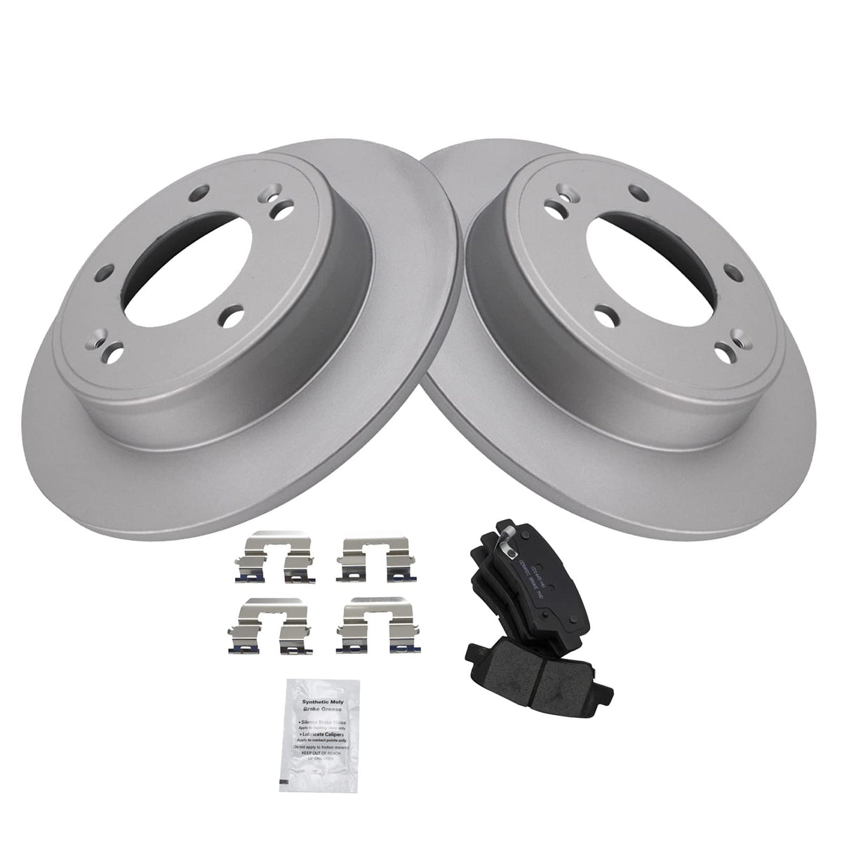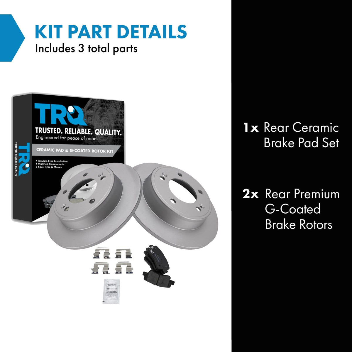 Ceramic Brake Pad & Rotor KitKit Includes(1) Rear Ceramic Brake Pad Set(2) Rear Premium G-Coated Brake RotorsFitmentCompatible with: 2014-16 Kia Soul Rear Ceramic Premium G-Coated Brake Pad & Rotor KitCompatible with: 2014-18 Kia Forte Rear Ceramic Premium G-Coated Brake Pad & Rotor KitCompatible with: 2012-15 Hyundai Veloster Rear Ceramic Premium G-Coated Brake Pad & Rotor KitCompatible with: 2013-16 Hyundai Elantra GT Rear Ceramic Premium G-Coated Brake Pad & Rotor KitCompatible with: 2014-18 Kia Forte5 Rear Ceramic Premium G-Coated Brake Pad & Rotor KitCompatible with: 2014-16 Kia Forte Koup Rear Ceramic Premium G-Coated Brake Pad & Rotor KitProduct AttributesRear Brake Rotor Diameter: 10.31 in. (262mm)Wheel Lug Count: 5 LugBrake Pad Friction Material: CeramicBrake Rotor Coating: Premium G-CoatedBrake Pad Bonding Type: Premium PosiRear Brake Rotor Venting Type: SolidProduct Features Positive Molded: Less dust resulting in clean wheels Electrostatic Coated: Long-lasting rust protection G3000 Casting Alloy: Reduced noise and improved wear resistance Application Specific Design: Extended service life, no modificationsItem DetailsTRQ brake kits are designed to restore your brake system to like-new performance. TRQ brake pads are positive molded, thermal scorched, chamfered, and utilize a multi-layer shim for enhanced performance and service life. TRQ G-coated rotors have long-lasting rust prevention, perfect for wheels with large openings that expose the rotor and rotor hat during daily drives. All products are fit and road-tested in our Massachusetts R&D facility to ensure we deliver on our promise of Trusted Reliable Quality.Reference NumbersHyundai: 583022TA60, 583022VA30, 583023QA10, 58302A5B30, 58302C1A50Kia: 583022TA60, 583023QA10, 583023RA70, 58302A7B30, 58302B2A00, 58302B2A10, 58302E4A00Raybestos Brakes: EHT1445H, MGD1445CH, SGD1445C