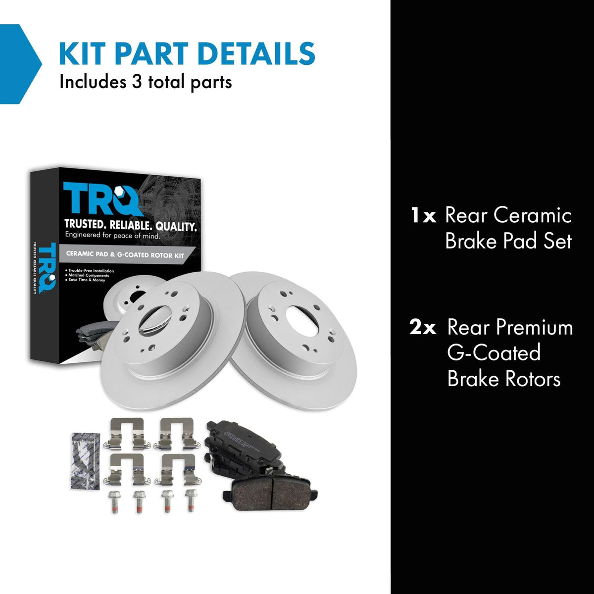 Ceramic Brake Pad & Rotor KitKit Includes(1) Rear Ceramic Brake Pad Set(2) Rear Premium G-Coated Brake RotorsFitmentCompatible with: 2016-18 Honda HR-V Rear Ceramic Premium G-Coated Brake Pad & Rotor KitProduct AttributesRear Brake Rotor Diameter: 11.10 in. (282mm)Wheel Lug Count: 5 LugBrake Pad Friction Material: CeramicBrake Rotor Coating: Premium G-CoatedBrake Pad Bonding Type: Premium PosiRear Brake Rotor Venting Type: SolidProduct Features Positive Molded: Less dust resulting in clean wheels Electrostatic Coated: Long-lasting rust protection G3000 Casting Alloy: Reduced noise and improved wear resistance Application Specific Design: Extended service life, no modificationsItem DetailsTRQ brake kits are designed to restore your brake system to like-new performance. TRQ brake pads are positive molded, thermal scorched, chamfered, and utilize a multi-layer shim for enhanced performance and service life. TRQ G-coated rotors have long-lasting rust prevention, perfect for wheels with large openings that expose the rotor and rotor hat during daily drives. All products are fit and road-tested in our Massachusetts R&D facility to ensure we deliver on our promise of Trusted Reliable Quality.Reference NumbersAamco: 31479Aimco: 31479Honda: 43022T2JH00, 43022T7JH01Raybestos Brakes: EHT1841H, MGD1841CH