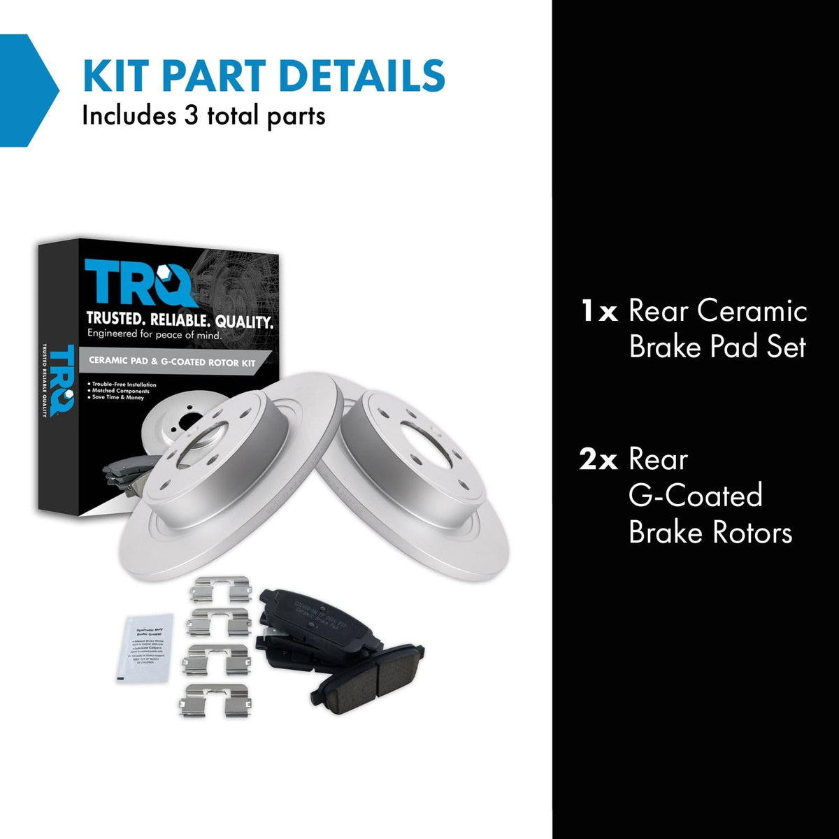 Ceramic Brake Pad & Rotor KitKit Includes(1) Rear Ceramic Brake Pad Set(2) Rear G-Coated Brake RotorsFitmentCompatible with: 2013-15 Chevrolet Cruze with 11.5 in. 292mm Diameter Rear Rotors Rear Ceramic Premium G-Coated Brake Pad & Rotor KitCompatible with: 2012-17 Buick Verano Rear Ceramic Premium G-Coated Brake Pad & Rotor KitCompatible with: 2011-15 Chevrolet Volt Rear Ceramic Premium G-Coated Brake Pad & Rotor KitCompatible with: 2016-19 Buick Cascada Rear Ceramic Premium G-Coated Brake Pad & Rotor KitCompatible with: 2014-15 Cadillac ELR Rear Ceramic Premium G-Coated Brake Pad & Rotor KitProduct AttributesRear Brake Rotor Diameter: 11.50 in. (292mm)Wheel Lug Count: 5 LugBrake Pad Friction Material: CeramicBrake Rotor Coating: Premium G-CoatedBrake Pad Bonding Type: Premium PosiRear Brake Rotor Venting Type: SolidProduct Features Positive Molded: Less dust resulting in clean wheels Electrostatic Coated: Long-lasting rust protection G3000 Casting Alloy: Reduced noise and improved wear resistance Application Specific Design: Extended service life, no modificationsItem DetailsTRQ brake kits are designed to restore your brake system to like-new performance. TRQ brake pads are positive molded, thermal scorched, chamfered, and utilize a multi-layer shim for enhanced performance and service life. TRQ G-coated rotors have long-lasting rust prevention, perfect for wheels with large openings that expose the rotor and rotor hat during daily drives. All products are fit and road-tested in our Massachusetts R&D facility to ensure we deliver on our promise of Trusted Reliable Quality.Reference NumbersAimco: 55196Buick: 13319293, 13404405, 13408579, 13411380Cadillac: 13319293, 13404405, 13417473Chevrolet: 13300868, 13319293, 13319294, 13404405, 13408579Raybestos Brakes: EHT1468H, MGD1468CH, SGD1468C