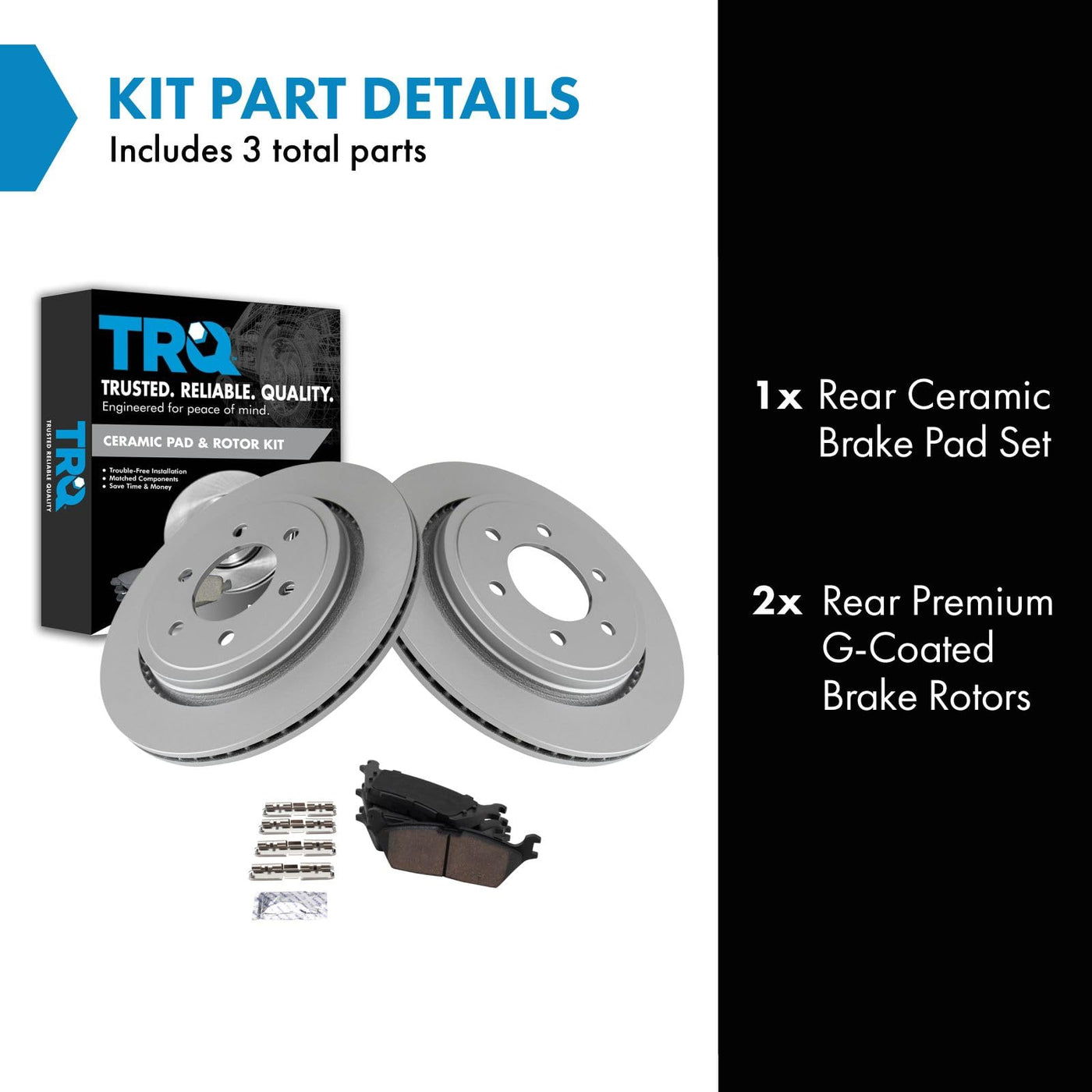 Ceramic Brake Pad & Rotor KitKit Includes(1) Rear Ceramic Brake Pad Set(2) Rear Premium G-Coated Brake RotorsFitmentCompatible with: 2018-19 Ford F150 Truck with Power Parking Brake Rear Ceramic Premium G-Coated Brake Pad & Rotor KitCompatible with: 2018-19 Ford Expedition Rear Ceramic Premium G-Coated Brake Pad & Rotor KitCompatible with: 2018-19 Lincoln Navigator Rear Ceramic Premium G-Coated Brake Pad & Rotor KitProduct AttributesRear Brake Rotor Diameter: 13.23 in. (336mm)Wheel Lug Count: 6 LugBrake Pad Friction Material: CeramicBrake Rotor Coating: Premium G-CoatedBrake Pad Bonding Type: Premium PosiFront Brake Rotor Venting Type: VentedProduct Features Positive Molded: Less dust resulting in clean wheels Electrostatic Coated: Long-lasting rust protection G3000 Casting Alloy: Reduced noise and improved wear resistance Application Specific Design: Extended service life, no modificationsItem DetailsTRQ brake kits are designed to restore your brake system to like-new performance. TRQ brake pads are positive molded, thermal scorched, chamfered, and utilize a multi-layer shim for enhanced performance and service life. TRQ G-coated rotors have long-lasting rust prevention, perfect for wheels with large openings that expose the rotor and rotor hat during daily drives. All products are fit and road-tested in our Massachusetts R&D facility to ensure we deliver on our promise of Trusted Reliable Quality.Reference NumbersFord: 682263, FL3Z2200A, JL3Z2200ARaybestos Brakes: 682263, 682263FZN, 682263P, 682263R, EHT1790H, MGD1790CH