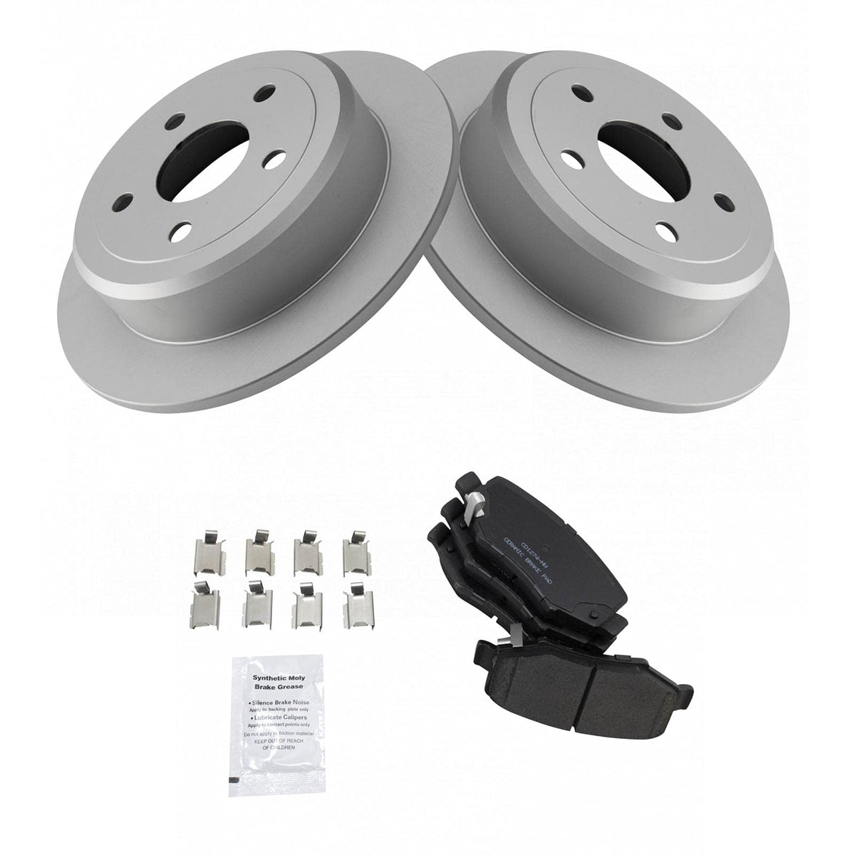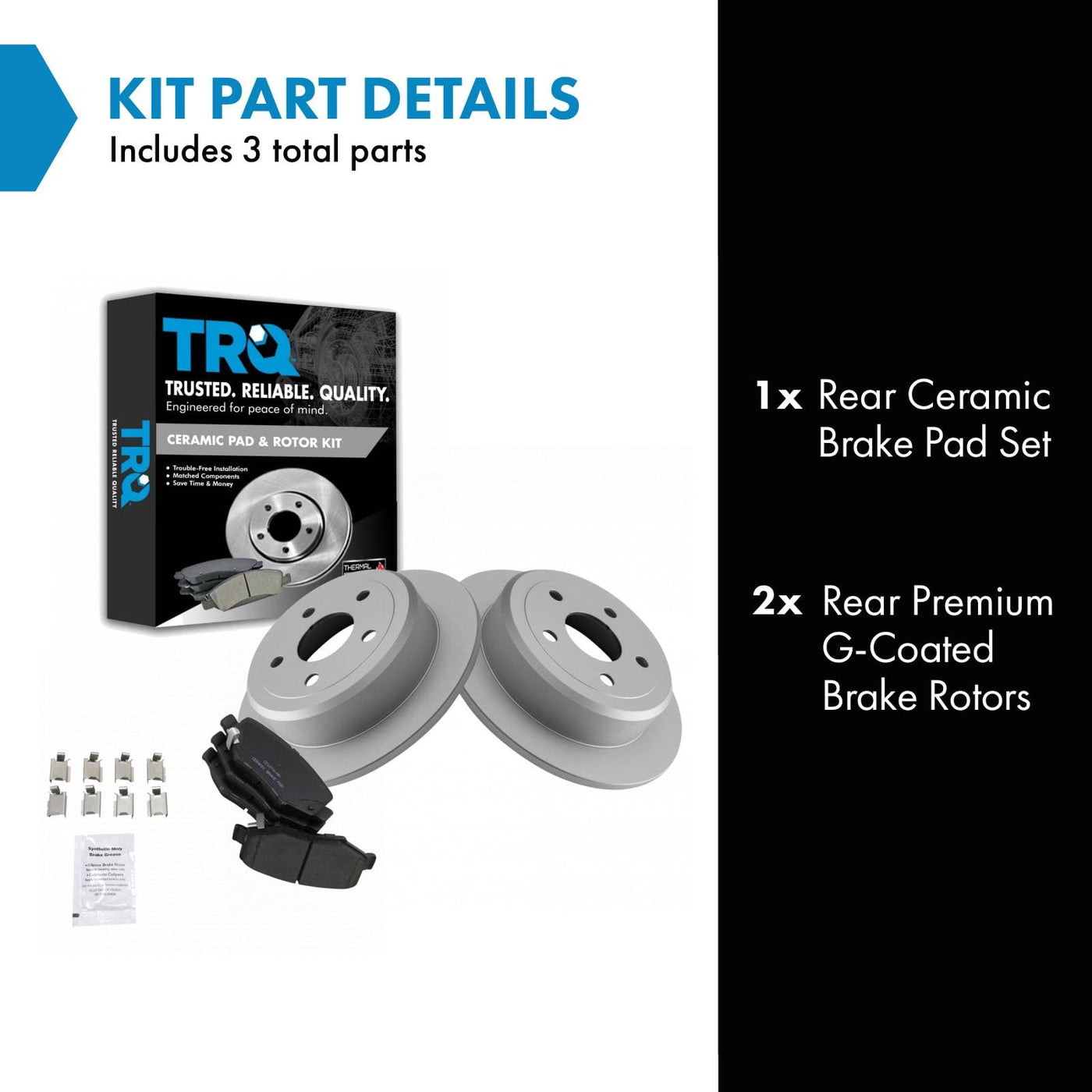 Ceramic Brake Pad & Rotor KitKit Includes(1) Rear Ceramic Brake Pad Set(2) Rear Premium G-Coated Brake RotorsFitmentCompatible with: 2007-17 Jeep Wrangler Rear Ceramic Premium G-Coated Brake Pad & Rotor KitCompatible with: 2018 Jeep Wrangler JK Rear Ceramic Premium G-Coated Brake Pad & Rotor KitProduct AttributesBrake Rotor Diameter: 12.44 in. (316mm)Wheel Lug Count: 5 LugBrake Pad Friction Material: CeramicBrake Rotor Coating: Premium G-CoatedBrake Pad Bonding Type: Premium PosiBrake Rotor Venting Type: SolidProduct Features Positive Molded: Less dust resulting in clean wheels Electrostatic Coated: Long-lasting rust protection G3000 Casting Alloy: Reduced noise and improved wear resistance Application Specific Design: Extended service life, no modificationsItem DetailsTRQ brake kits are designed to restore your brake system to like-new performance. TRQ brake pads are positive molded, thermal scorched, chamfered, and utilize a multi-layer shim for enhanced performance and service life. TRQ G-coated rotors have long-lasting rust prevention, perfect for wheels with large openings that expose the rotor and rotor hat during daily drives. All products are fit and road-tested in our Massachusetts R&D facility to ensure we deliver on our promise of Trusted Reliable Quality.Reference NumbersAamco: 53041Aimco: 53041Dodge: 68003776AAJeep: 68003776AARaybestos Brakes: EHT1274H