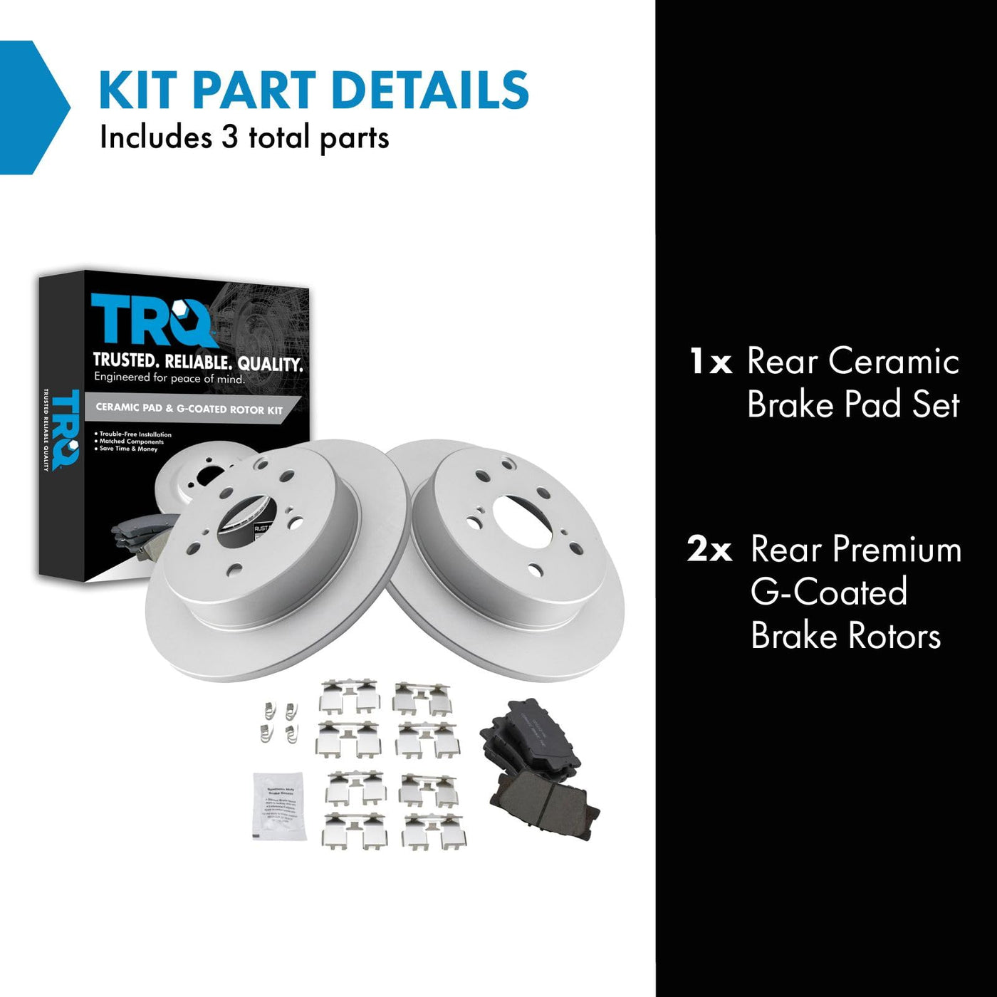 Ceramic Brake Pad & Rotor KitKit Includes(1) Rear Ceramic Brake Pad Set(2) Rear Premium G-Coated Brake RotorsFitmentCompatible with: 2006-18 Toyota Rav4 Rear Ceramic Premium G-Coated Brake Pad & Rotor KitCompatible with: 2010-12 Lexus HS250h Rear Ceramic Premium G-Coated Brake Pad & Rotor KitProduct AttributesBrake Rotor Diameter: 11.06 in. (281mm)Wheel Lug Count: 5 LugBrake Pad Friction Material: CeramicBrake Rotor Coating: Premium G-CoatedBrake Pad Bonding Type: Premium PosiBrake Rotor Venting Type: SolidProduct Features Positive Molded: Less dust resulting in clean wheels Electrostatic Coated: Long-lasting rust protection G3000 Casting Alloy: Reduced noise and improved wear resistance Application Specific Design: Extended service life, no modificationsItem DetailsTRQ brake kits are designed to restore your brake system to like-new performance. TRQ brake pads are positive molded, thermal scorched, chamfered, and utilize a multi-layer shim for enhanced performance and service life. TRQ G-coated rotors have long-lasting rust prevention, perfect for wheels with large openings that expose the rotor and rotor hat during daily drives. All products are fit and road-tested in our Massachusetts R&D facility to ensure we deliver on our promise of Trusted Reliable Quality.Reference NumbersAamco: 31443Aimco: 31443Lexus: 446606090, 446633160, 446633180, 446633200, 446642060Pontiac: 19184917Raybestos Brakes: EHT1212H, MGD1212CH, SGD1212CToyota: 1446633210, 446602220, 446606060, 446606090, 446606200, 446633160, 446633180, 446642060