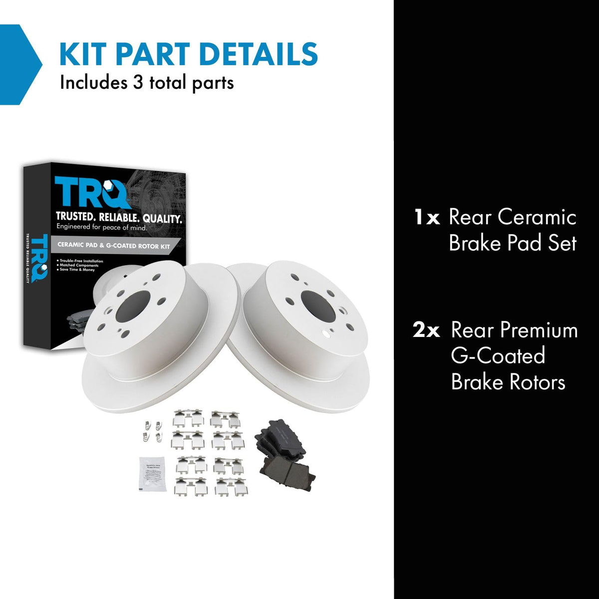 Ceramic Brake Pad & Rotor KitKit Includes(1) Rear Ceramic Brake Pad Set(2) Rear Premium G-Coated Brake RotorsFitmentCompatible with: 2012-17 Toyota Camry Rear Ceramic Premium G-Coated Brake Pad & Rotor KitCompatible with: 2013-18 Lexus ES350 Rear Ceramic Premium G-Coated Brake Pad & Rotor KitCompatible with: 2013-18 Toyota Avalon Rear Ceramic Premium G-Coated Brake Pad & Rotor KitCompatible with: 2013-18 Lexus ES300h Rear Ceramic Premium G-Coated Brake Pad & Rotor KitProduct AttributesBrake Rotor Diameter: 11.06 in. (281mm)Wheel Lug Count: 5 LugBrake Pad Friction Material: CeramicBrake Rotor Coating: Premium G-CoatedBrake Pad Bonding Type: Premium PosiBrake Rotor Venting Type: SolidProduct Features Positive Molded: Less dust resulting in clean wheels Electrostatic Coated: Long-lasting rust protection G3000 Casting Alloy: Reduced noise and improved wear resistance Application Specific Design: Extended service life, no modificationsItem DetailsTRQ brake kits are designed to restore your brake system to like-new performance. TRQ brake pads are positive molded, thermal scorched, chamfered, and utilize a multi-layer shim for enhanced performance and service life. TRQ G-coated rotors have long-lasting rust prevention, perfect for wheels with large openings that expose the rotor and rotor hat during daily drives. All products are fit and road-tested in our Massachusetts R&D facility to ensure we deliver on our promise of Trusted Reliable Quality.Reference NumbersAamco: 31608Aimco: 31608Lexus: 446606090, 446633160, 446633180, 446633200, 446642060Pontiac: 19184917Raybestos Brakes: EHT1212H, MGD1212CH, SGD1212CToyota: 1446633210, 446602220, 446606060, 446606090, 446606200, 446633160, 446633180, 446642060