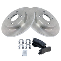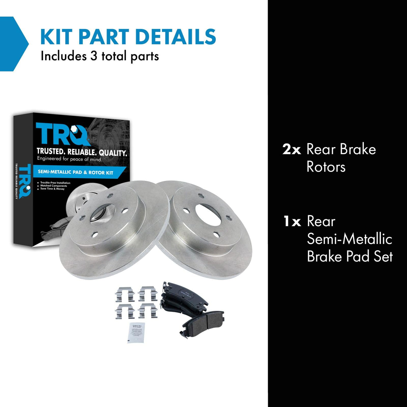 Semi-Metallic Brake Pad & Rotor KitKit Includes(1) Rear Semi-Metallic Brake Pad Set(2) Rear Brake RotorsFitmentCompatible with: 1991-98 Saturn SL2 RearCompatible with: 1991-98 Saturn SL1 RearCompatible with: 1993-98 Saturn SC2 RearCompatible with: 1993-98 Saturn SW2 RearCompatible with: 1993-98 Saturn SC1 RearCompatible with: 1991-98 Saturn SL RearCompatible with: 1993-98 Saturn SW1 RearCompatible with: 1991-92 Saturn SC RearProduct AttributesBrake Pad Friction Material: Semi-MetallicProduct Features Positive Molded - Less dust resulting in clean wheels G3000 Casting Alloy - Reduced noise and improved wear resistance Application Specific Design - Extended service life, no modificationsItem DetailsTRQ brake kits are designed to restore your brake system to like-new performance. TRQ brake pads are positive molded, thermal scorched, chamfered, and utilize a multi-layer shim for enhanced performance and service life. TRQ rotors have a non-directional finish that reduces the break-in period for new rotors as well as reducing vibrations throughout the rotors lifecycle. All products are fit and road-tested in our Massachusetts R&D facility to ensure we deliver on our promise of Trusted Reliable Quality.Reference NumbersAimco: 5582Bendix: PRT1605Buick: 18043995, 18043999Cadillac: 18029826, 18043995, 18043999Chevrolet: 18024530, 18043995DuraGo: BR5582Oldsmobile: 12510045, 18029826, 18043995, 18043999Pontiac: 18043995, 18043999Raybestos Brakes: 56168, 56168FZN, 56168P, 56168R, EHT714HSaturn: 21012052Wagner: BD125138