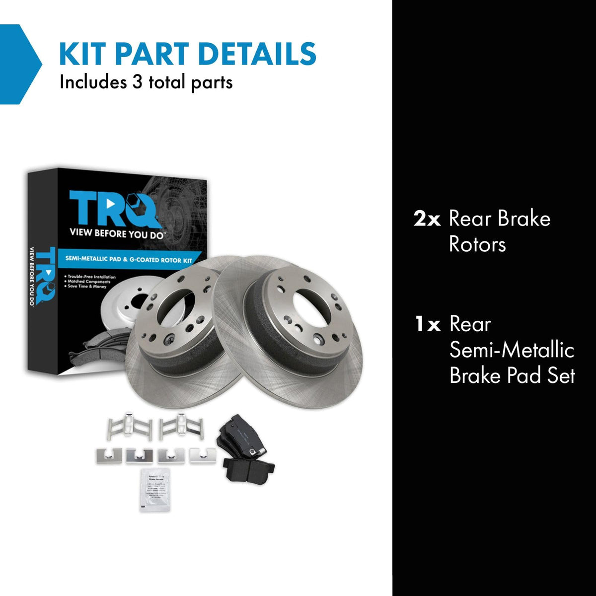 Semi-Metallic Brake Pad & Rotor KitKit Includes(1) Rear Semi-Metallic Brake Pad Set(2) Rear Brake RotorsFitmentCompatible with: 1995-98 Honda Odyssey RearCompatible with: 1991-95 Acura Legend RearCompatible with: 1996-98 Acura RL RearCompatible with: 1996-99 Isuzu Oasis RearProduct AttributesBrake Pad Bonding Type: Premium PosiBrake Pad Friction Material: Semi-MetallicProduct Features Positive Molded - Less dust resulting in clean wheels G3000 Casting Alloy - Reduced noise and improved wear resistance Application Specific Design - Extended service life, no modificationsItem DetailsTRQ brake kits are designed to restore your brake system to like-new performance. TRQ brake pads are positive molded, thermal scorched, chamfered, and utilize a multi-layer shim for enhanced performance and service life. TRQ rotors have a non-directional finish that reduces the break-in period for new rotors as well as reducing vibrations throughout the rotors lifecycle. All products are fit and road-tested in our Massachusetts R&D facility to ensure we deliver on our promise of Trusted Reliable Quality.Reference NumbersAcura: 43022SEPA00, 43022SEPC01, 43022SP0000, 43022SP0010, 43022SP0020, 43022SP0030, 43022STKA01, 43022SV4G00, 43022SX0A50, 43022SZ3A00, 43022SZ3A01, NBKD6291EFAimco: 31105Bendix: PRT1514DuraGo: BR31105Hollander: 533-58423Honda: 43022S6D000, 43022S9AA00, 43022S9AA01, 43022SCVA00, 43022SV4G00, 43022SX0A50Isuzu: 5862029840, 5862070780, 5862072040Raybestos Brakes: 96178, 96178FZN, 96178P, 96178R, EHT536HWagner: BD125221